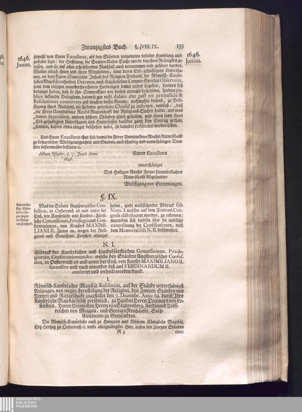 Dritter Theil (1735) Worinnen enthalten, was vom Monath April, biß zu Ende des Jahrs 1646. zwischen Jhro Römisch-Kayserlichen Majestät, dann den Beyden Cronen Franckreich und Schweden, ingleichen des Heiligen Römischen Reichs Chur Fürsten, Fürsten und Ständen, zu Oßnabrück und Münster gehandelt worden