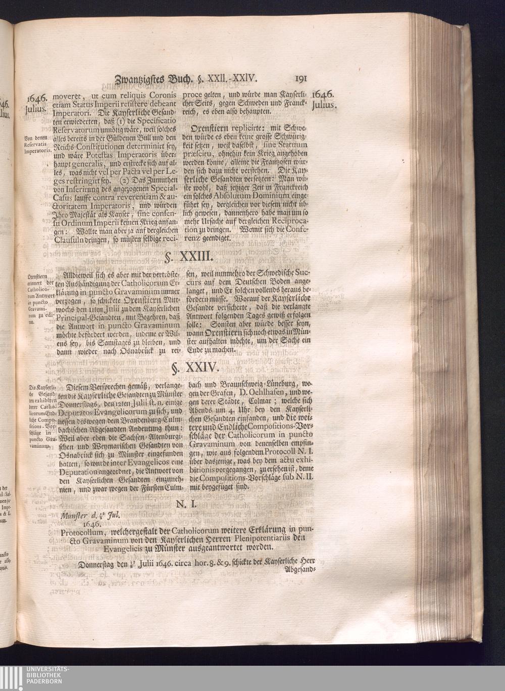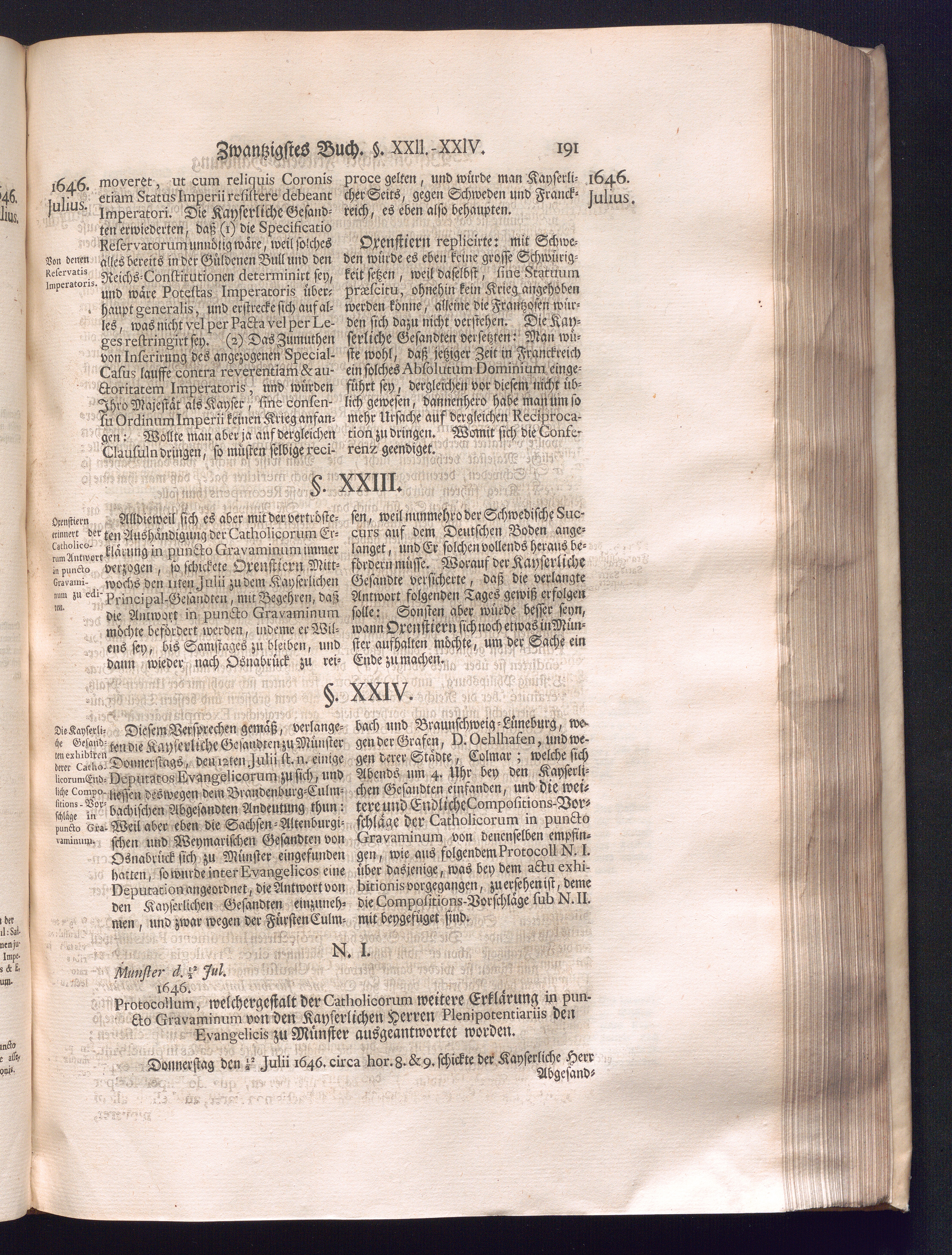 Dritter Theil (1735) Worinnen enthalten, was vom Monath April, biß zu Ende des Jahrs 1646. zwischen Jhro Römisch-Kayserlichen Majestät, dann den Beyden Cronen Franckreich und Schweden, ingleichen des Heiligen Römischen Reichs Chur Fürsten, Fürsten und Ständen, zu Oßnabrück und Münster gehandelt worden