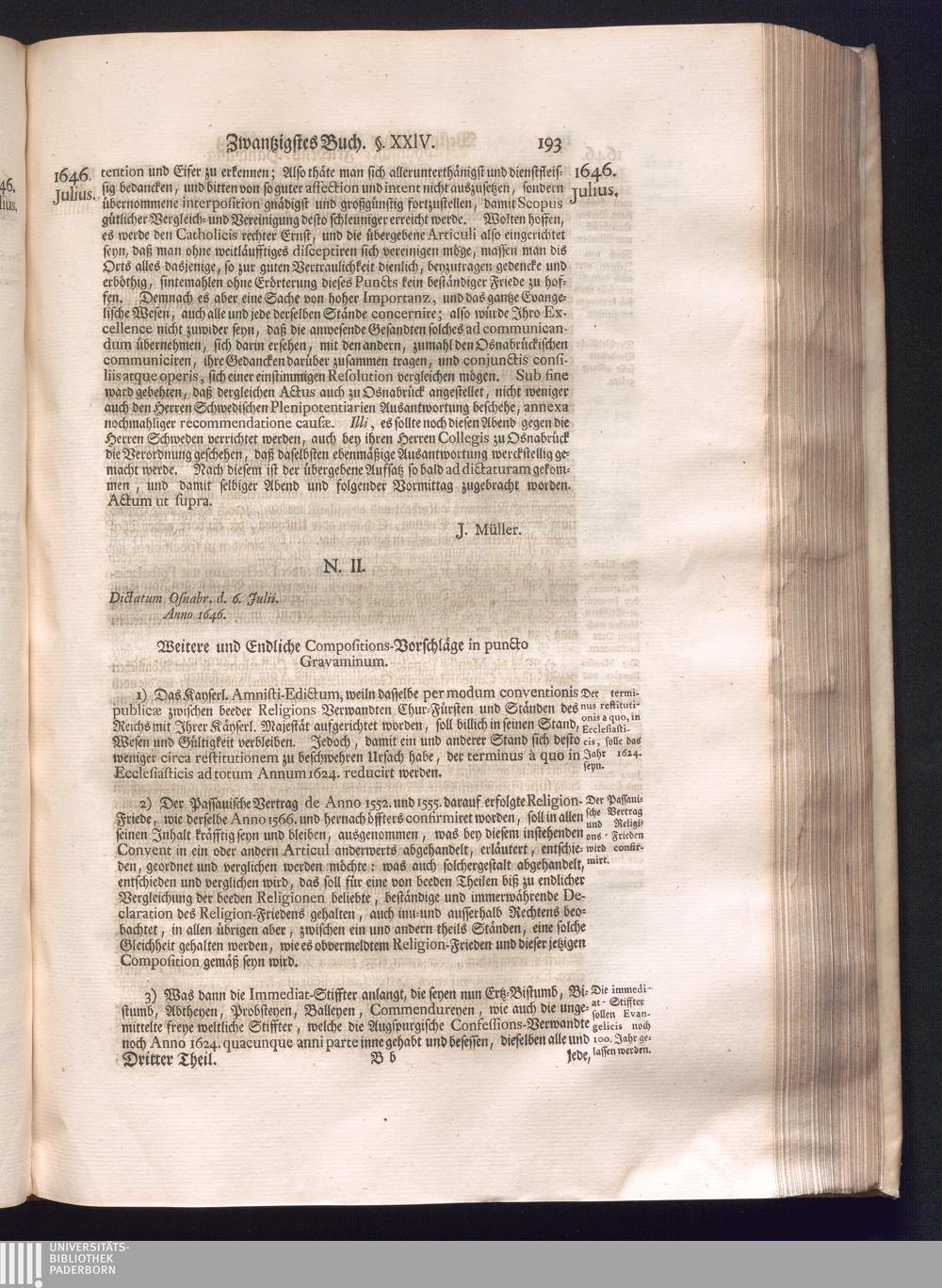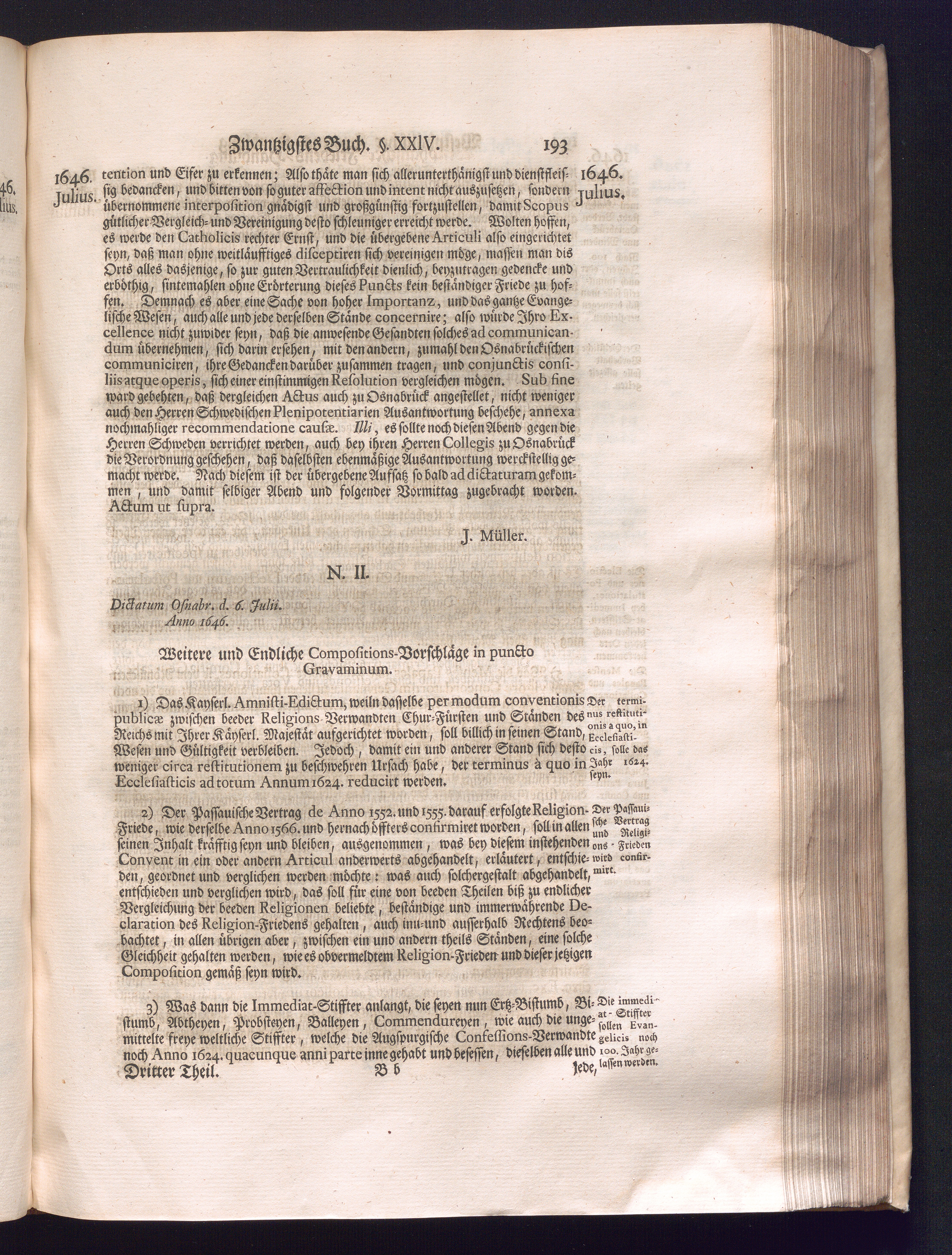 Dritter Theil (1735) Worinnen enthalten, was vom Monath April, biß zu Ende des Jahrs 1646. zwischen Jhro Römisch-Kayserlichen Majestät, dann den Beyden Cronen Franckreich und Schweden, ingleichen des Heiligen Römischen Reichs Chur Fürsten, Fürsten und Ständen, zu Oßnabrück und Münster gehandelt worden