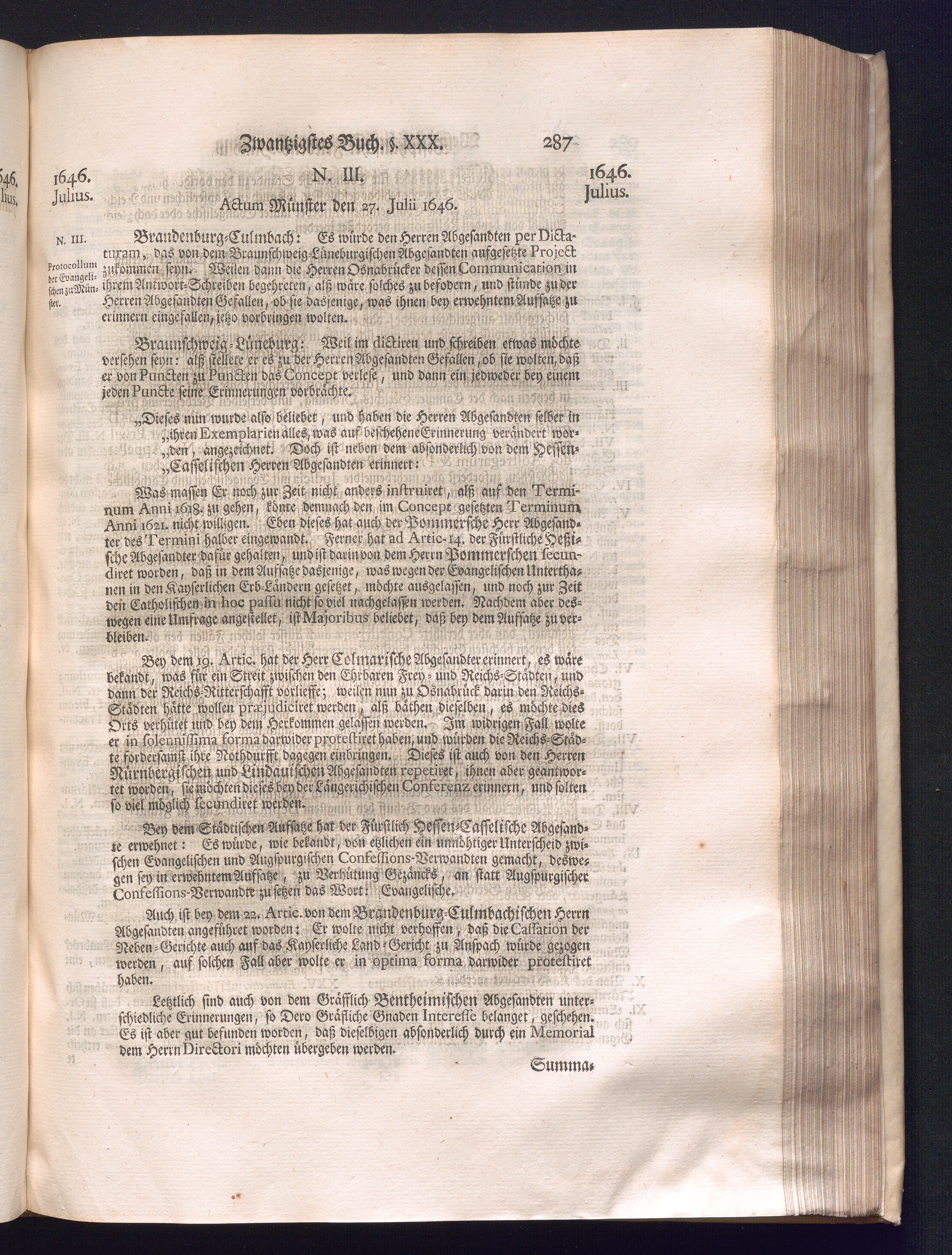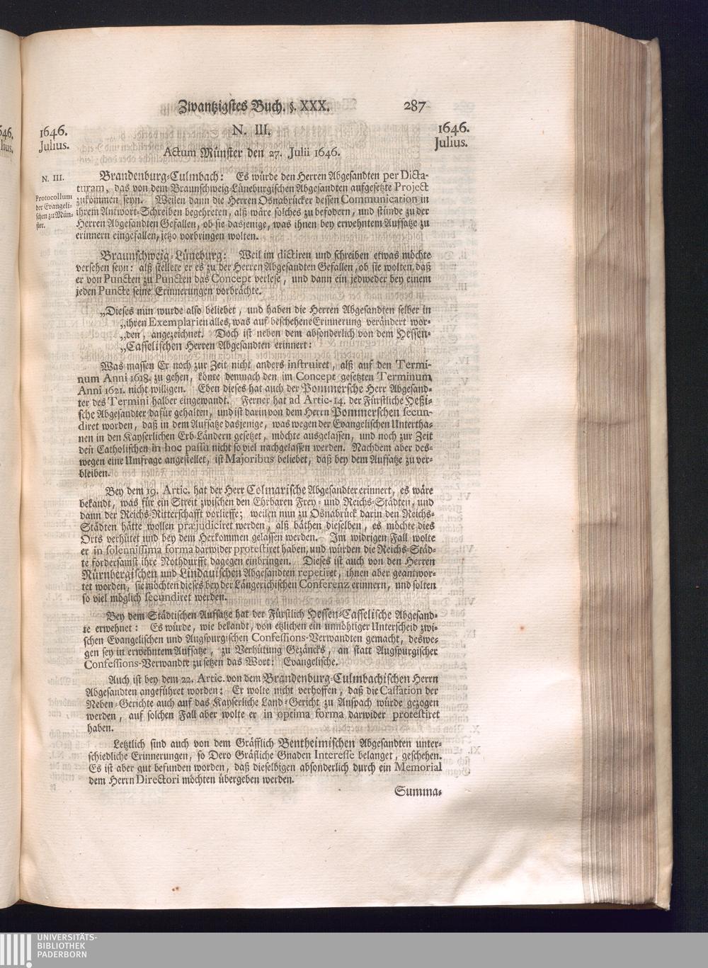 Dritter Theil (1735) Worinnen enthalten, was vom Monath April, biß zu Ende des Jahrs 1646. zwischen Jhro Römisch-Kayserlichen Majestät, dann den Beyden Cronen Franckreich und Schweden, ingleichen des Heiligen Römischen Reichs Chur Fürsten, Fürsten und Ständen, zu Oßnabrück und Münster gehandelt worden