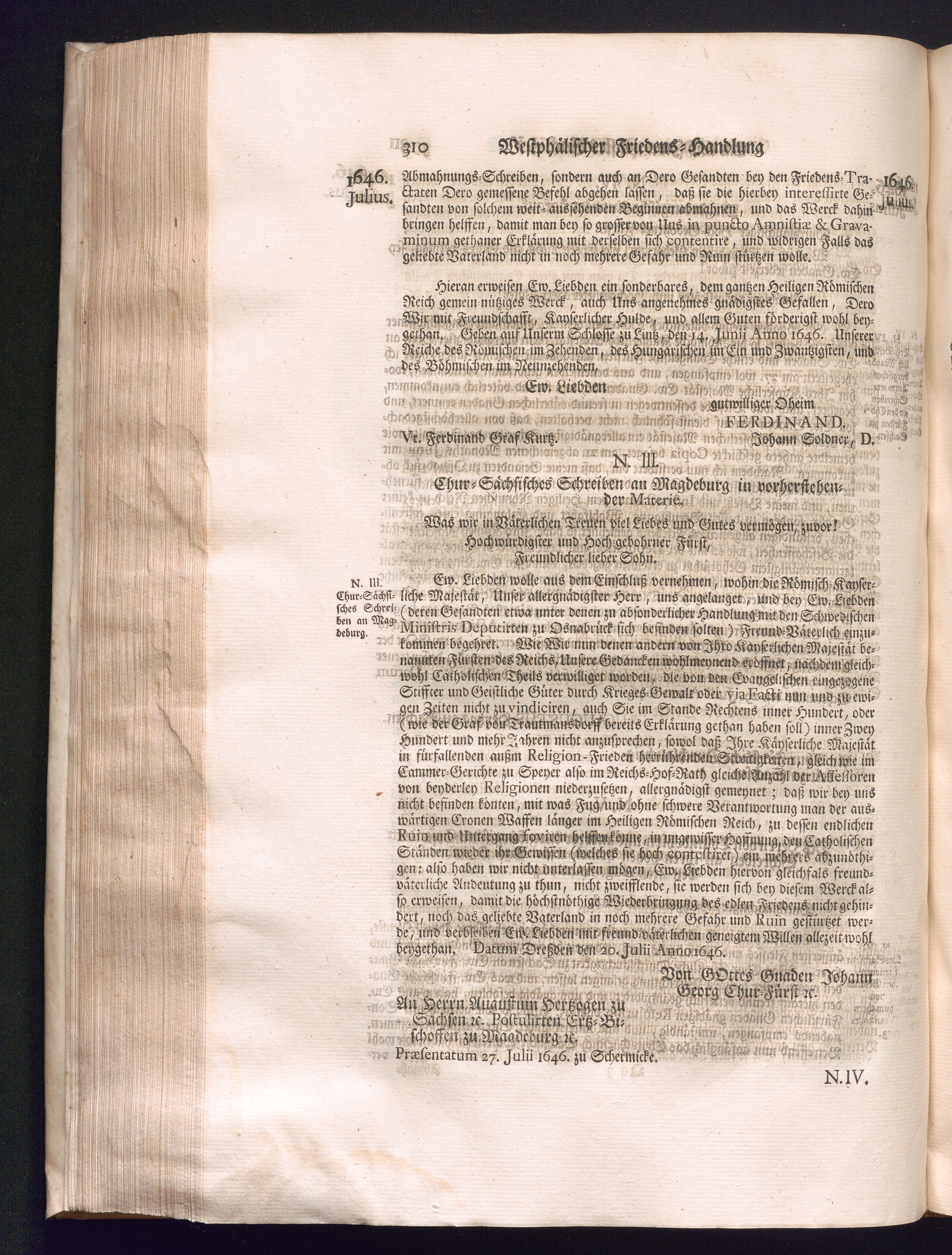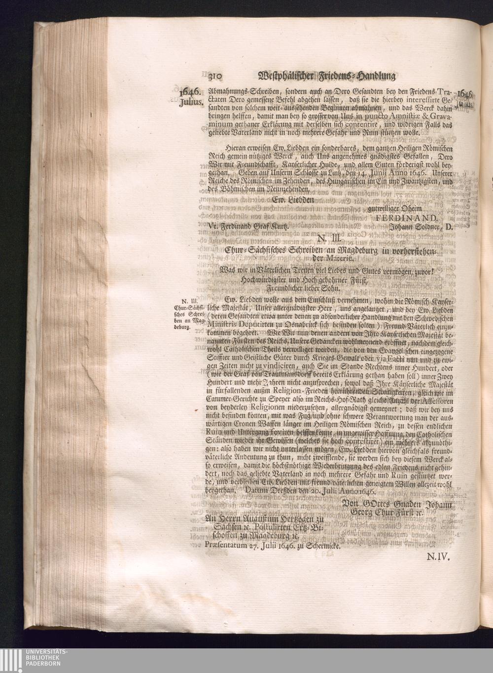 Dritter Theil (1735) Worinnen enthalten, was vom Monath April, biß zu Ende des Jahrs 1646. zwischen Jhro Römisch-Kayserlichen Majestät, dann den Beyden Cronen Franckreich und Schweden, ingleichen des Heiligen Römischen Reichs Chur Fürsten, Fürsten und Ständen, zu Oßnabrück und Münster gehandelt worden