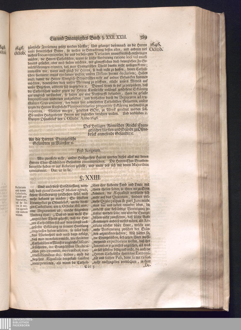 Dritter Theil (1735) Worinnen enthalten, was vom Monath April, biß zu Ende des Jahrs 1646. zwischen Jhro Römisch-Kayserlichen Majestät, dann den Beyden Cronen Franckreich und Schweden, ingleichen des Heiligen Römischen Reichs Chur Fürsten, Fürsten und Ständen, zu Oßnabrück und Münster gehandelt worden