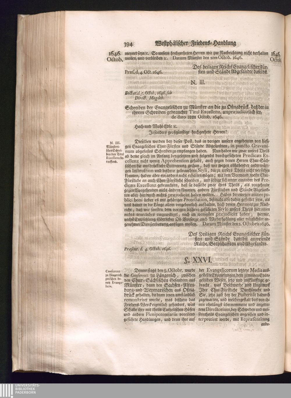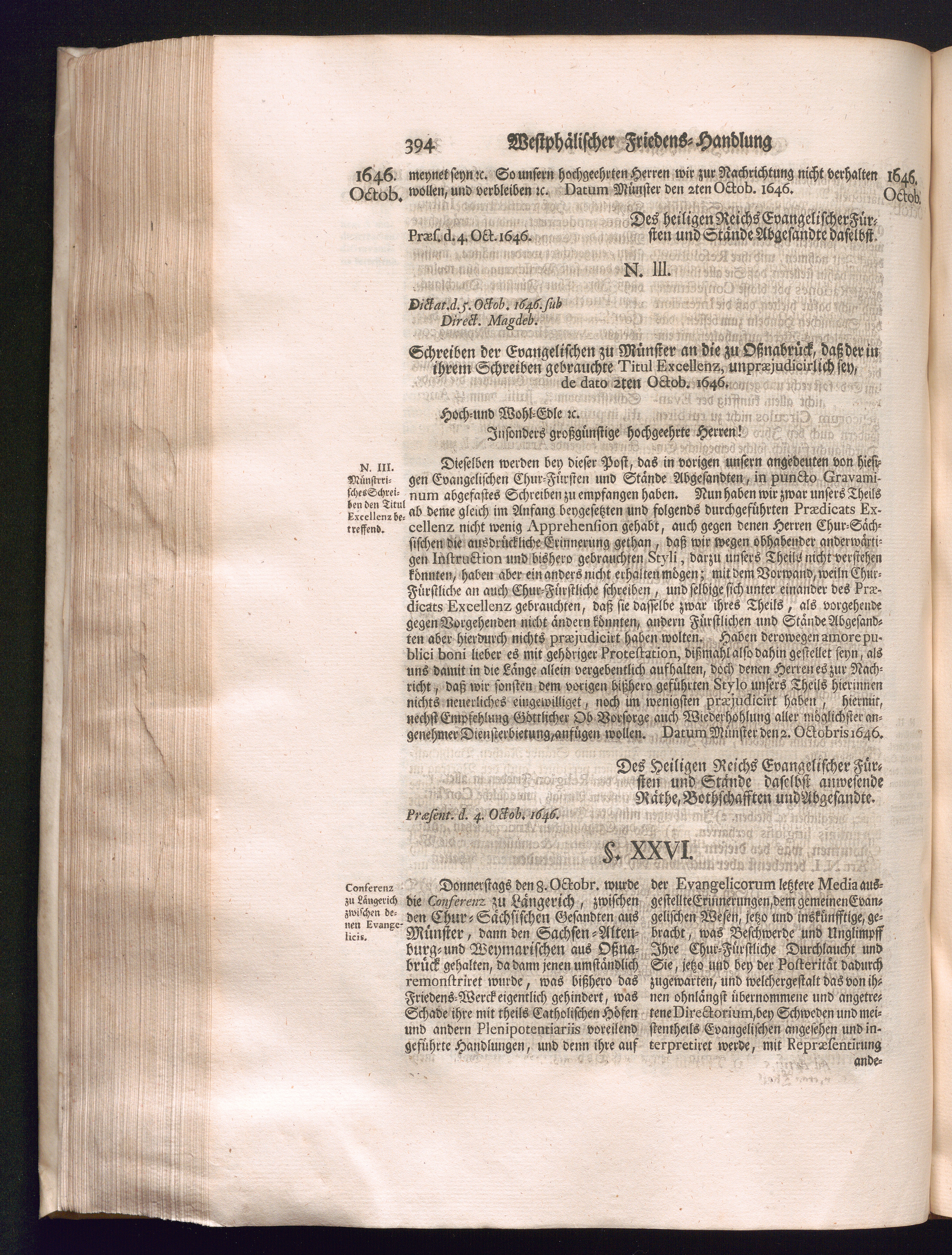 Dritter Theil (1735) Worinnen enthalten, was vom Monath April, biß zu Ende des Jahrs 1646. zwischen Jhro Römisch-Kayserlichen Majestät, dann den Beyden Cronen Franckreich und Schweden, ingleichen des Heiligen Römischen Reichs Chur Fürsten, Fürsten und Ständen, zu Oßnabrück und Münster gehandelt worden