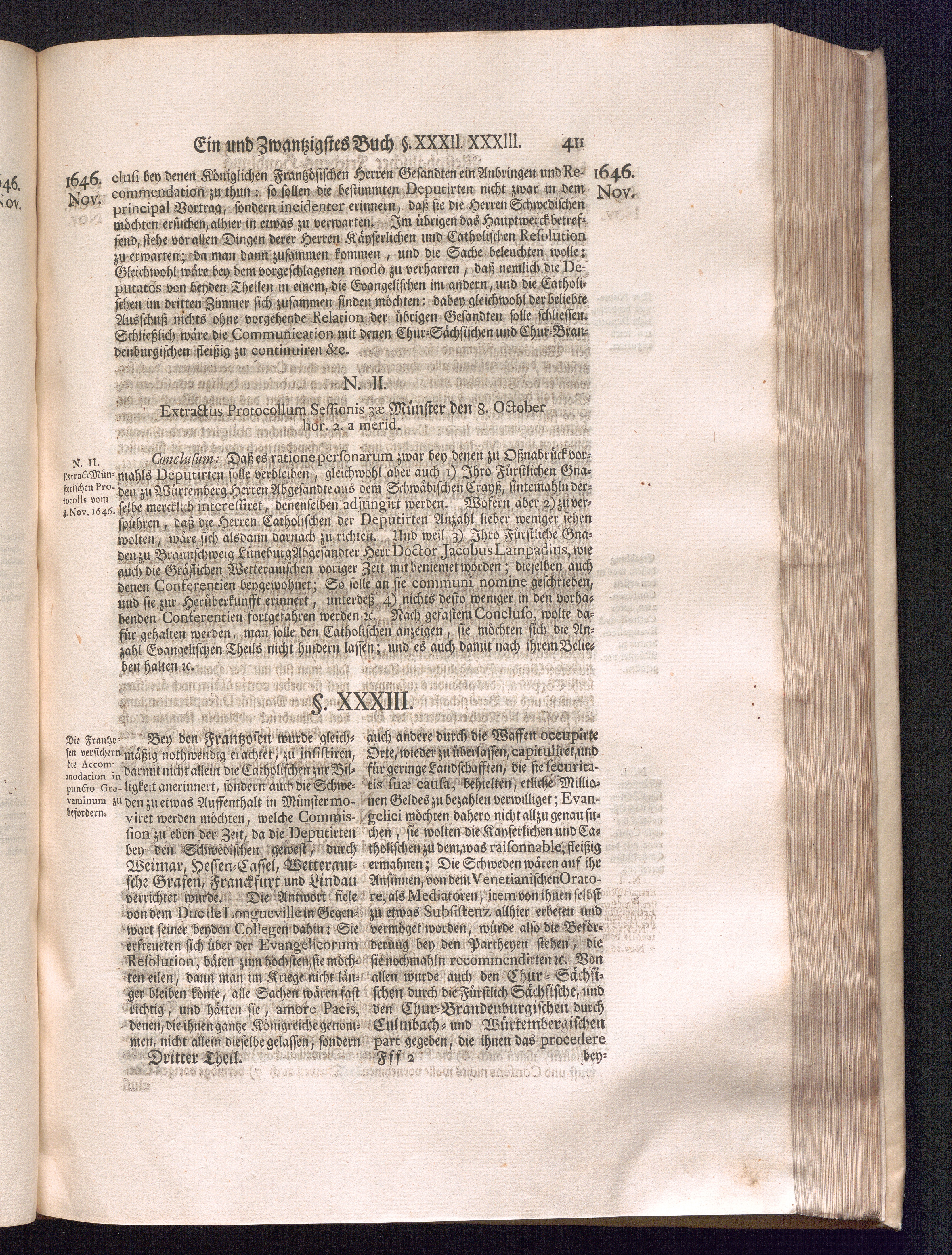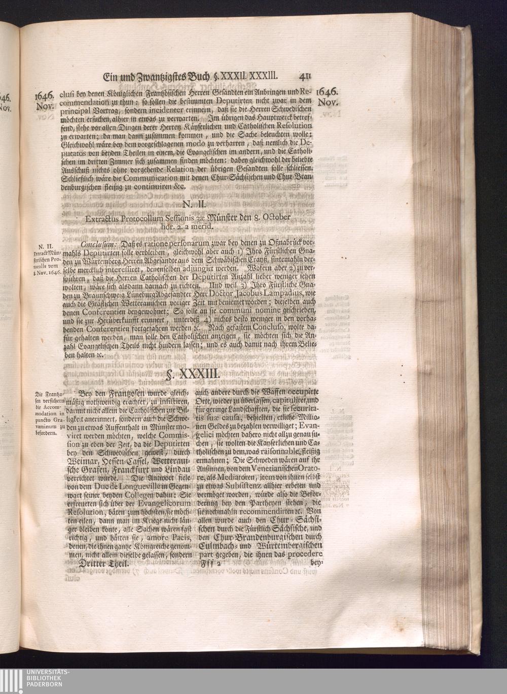 Dritter Theil (1735) Worinnen enthalten, was vom Monath April, biß zu Ende des Jahrs 1646. zwischen Jhro Römisch-Kayserlichen Majestät, dann den Beyden Cronen Franckreich und Schweden, ingleichen des Heiligen Römischen Reichs Chur Fürsten, Fürsten und Ständen, zu Oßnabrück und Münster gehandelt worden