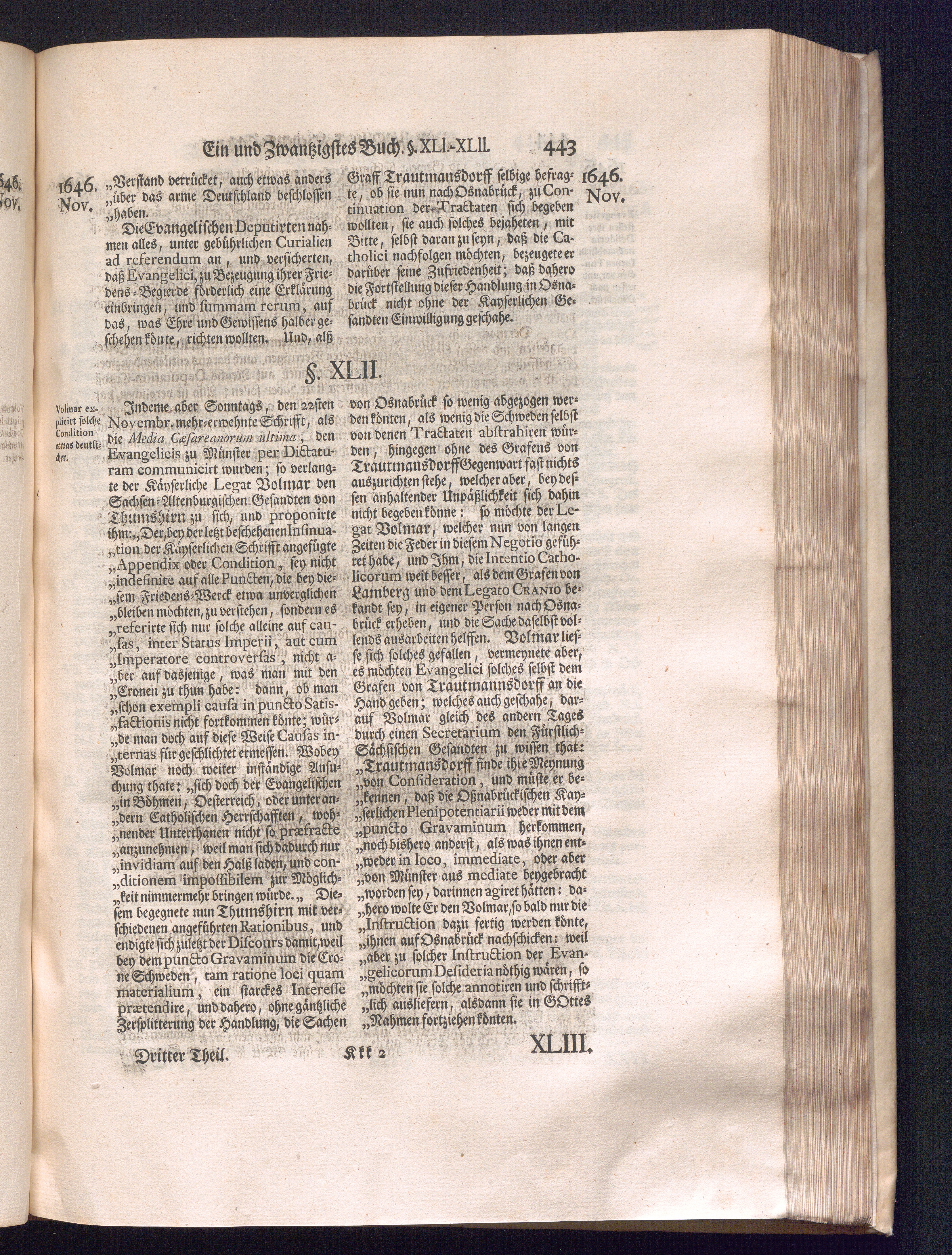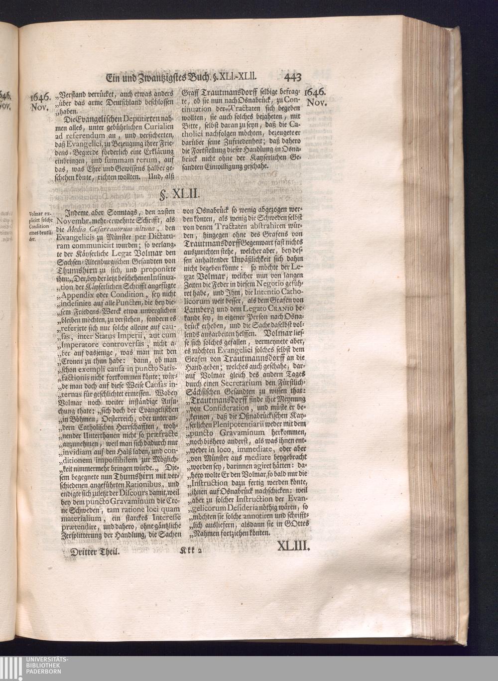 Dritter Theil (1735) Worinnen enthalten, was vom Monath April, biß zu Ende des Jahrs 1646. zwischen Jhro Römisch-Kayserlichen Majestät, dann den Beyden Cronen Franckreich und Schweden, ingleichen des Heiligen Römischen Reichs Chur Fürsten, Fürsten und Ständen, zu Oßnabrück und Münster gehandelt worden