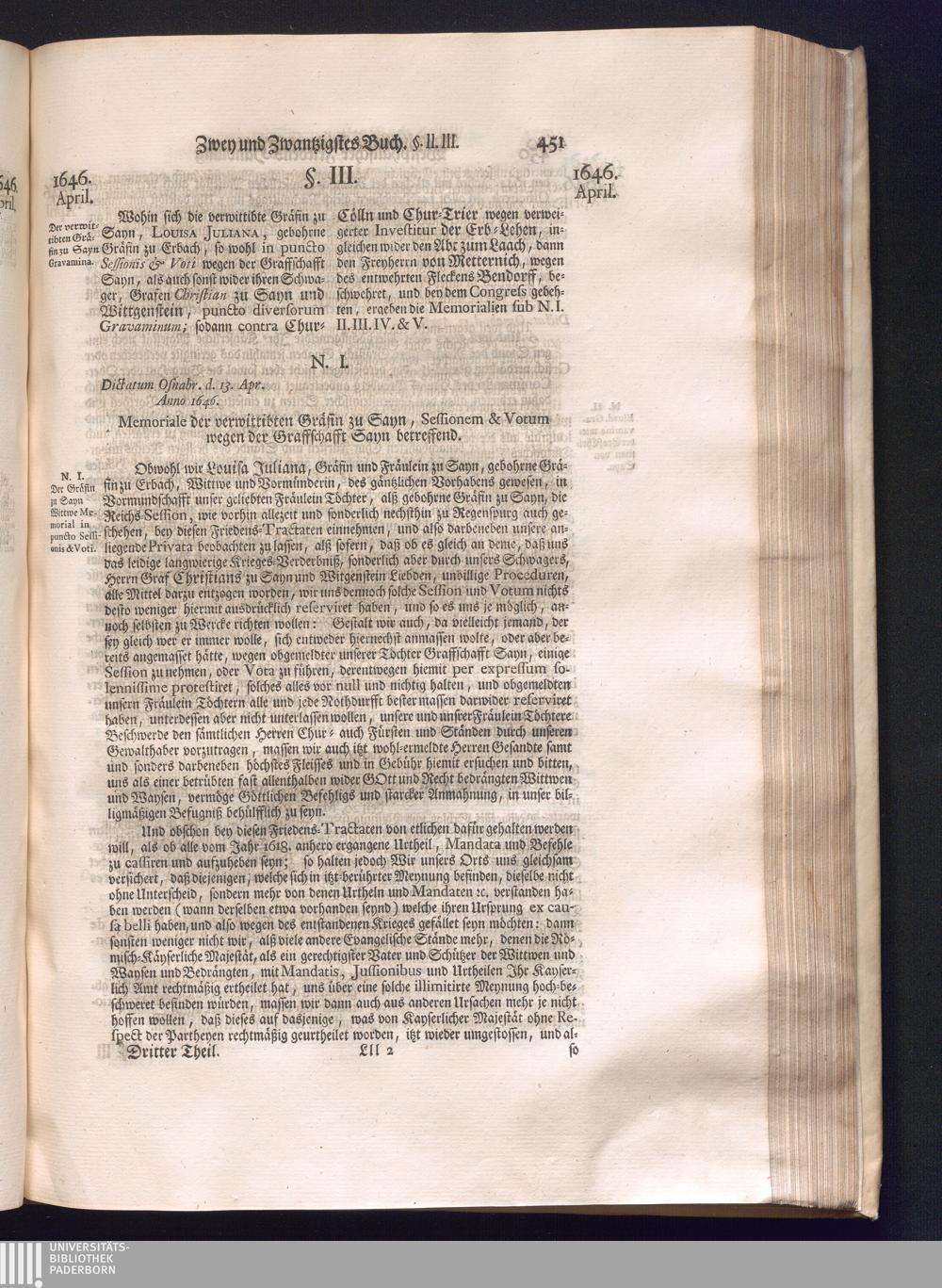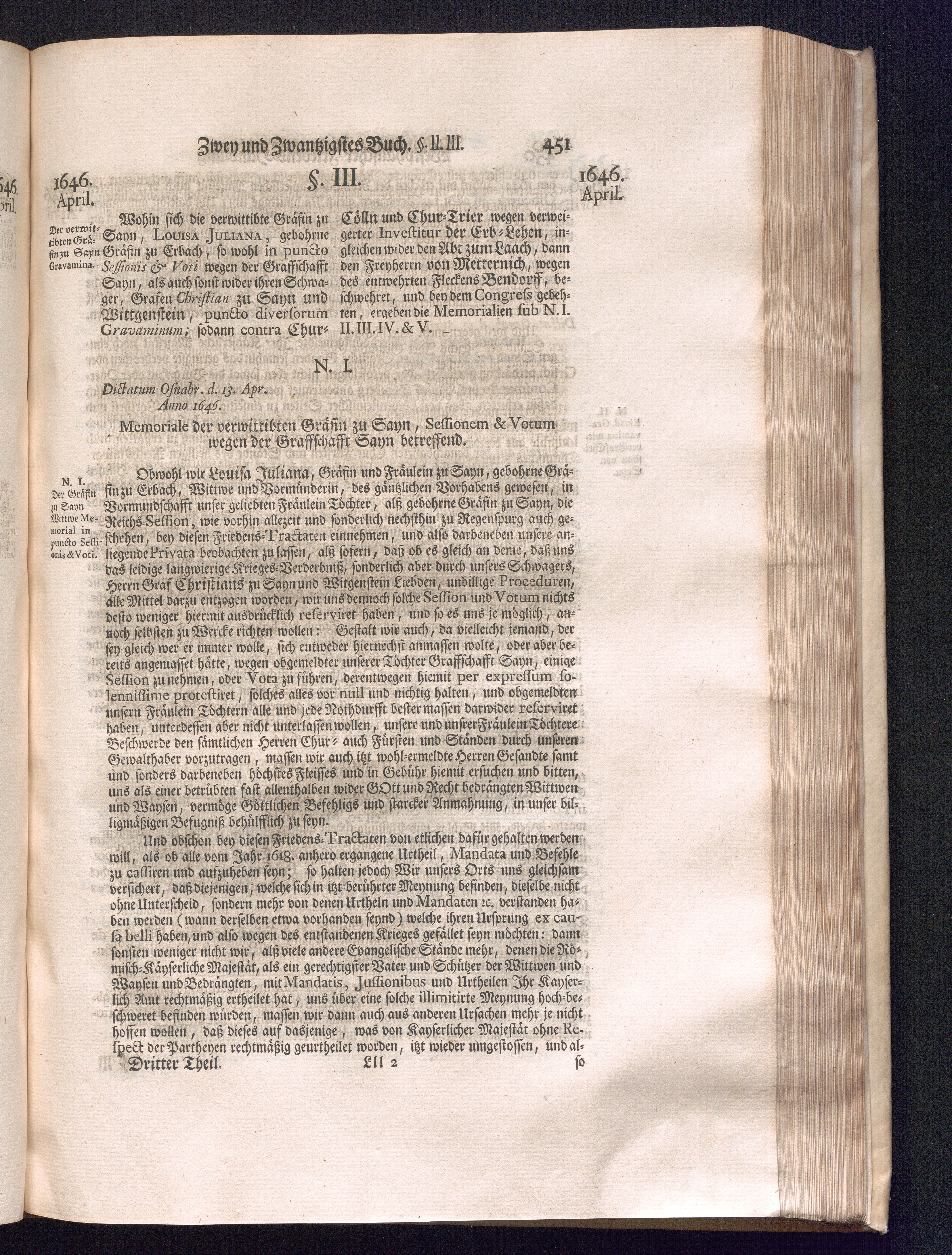 Dritter Theil (1735) Worinnen enthalten, was vom Monath April, biß zu Ende des Jahrs 1646. zwischen Jhro Römisch-Kayserlichen Majestät, dann den Beyden Cronen Franckreich und Schweden, ingleichen des Heiligen Römischen Reichs Chur Fürsten, Fürsten und Ständen, zu Oßnabrück und Münster gehandelt worden