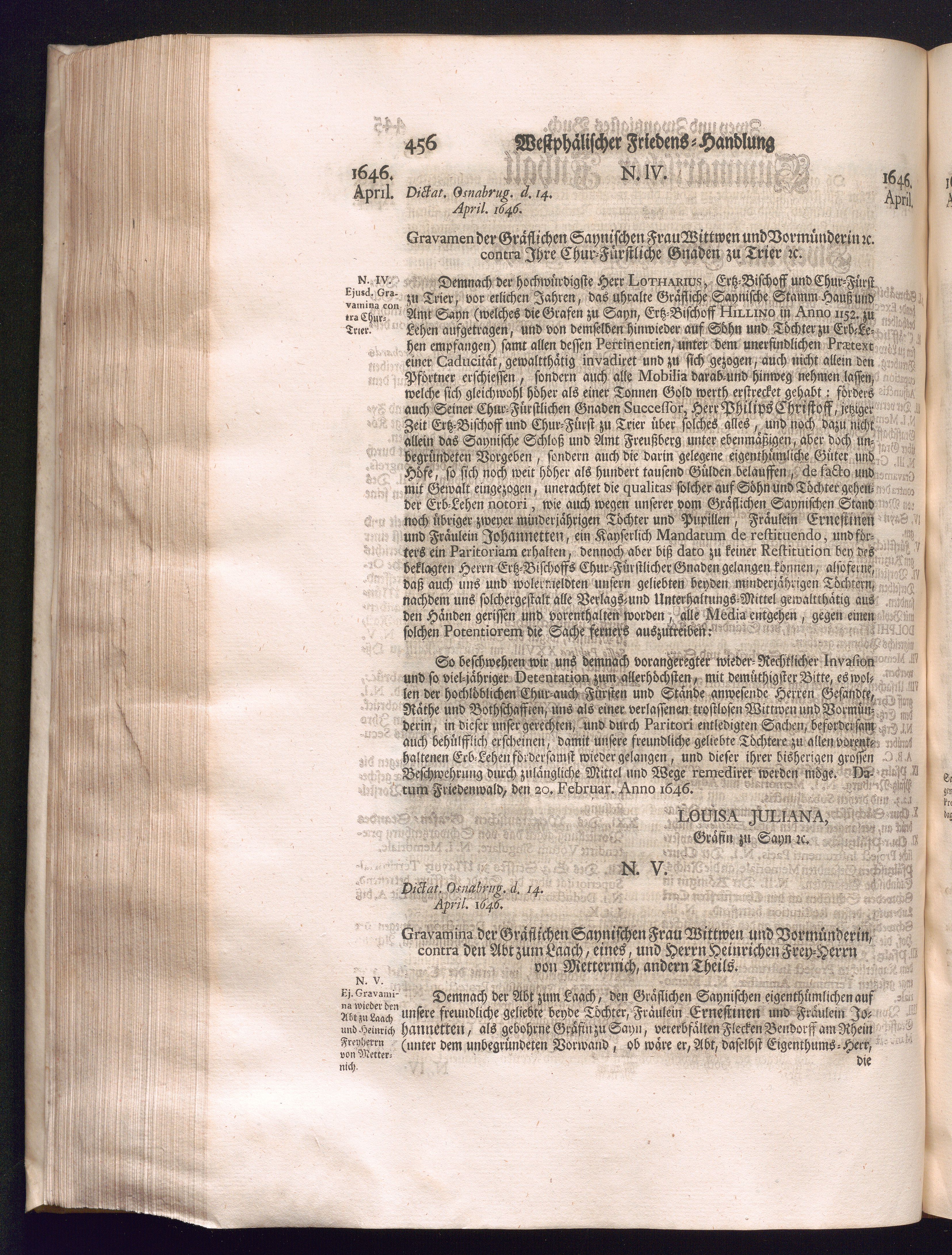 Dritter Theil (1735) Worinnen enthalten, was vom Monath April, biß zu Ende des Jahrs 1646. zwischen Jhro Römisch-Kayserlichen Majestät, dann den Beyden Cronen Franckreich und Schweden, ingleichen des Heiligen Römischen Reichs Chur Fürsten, Fürsten und Ständen, zu Oßnabrück und Münster gehandelt worden