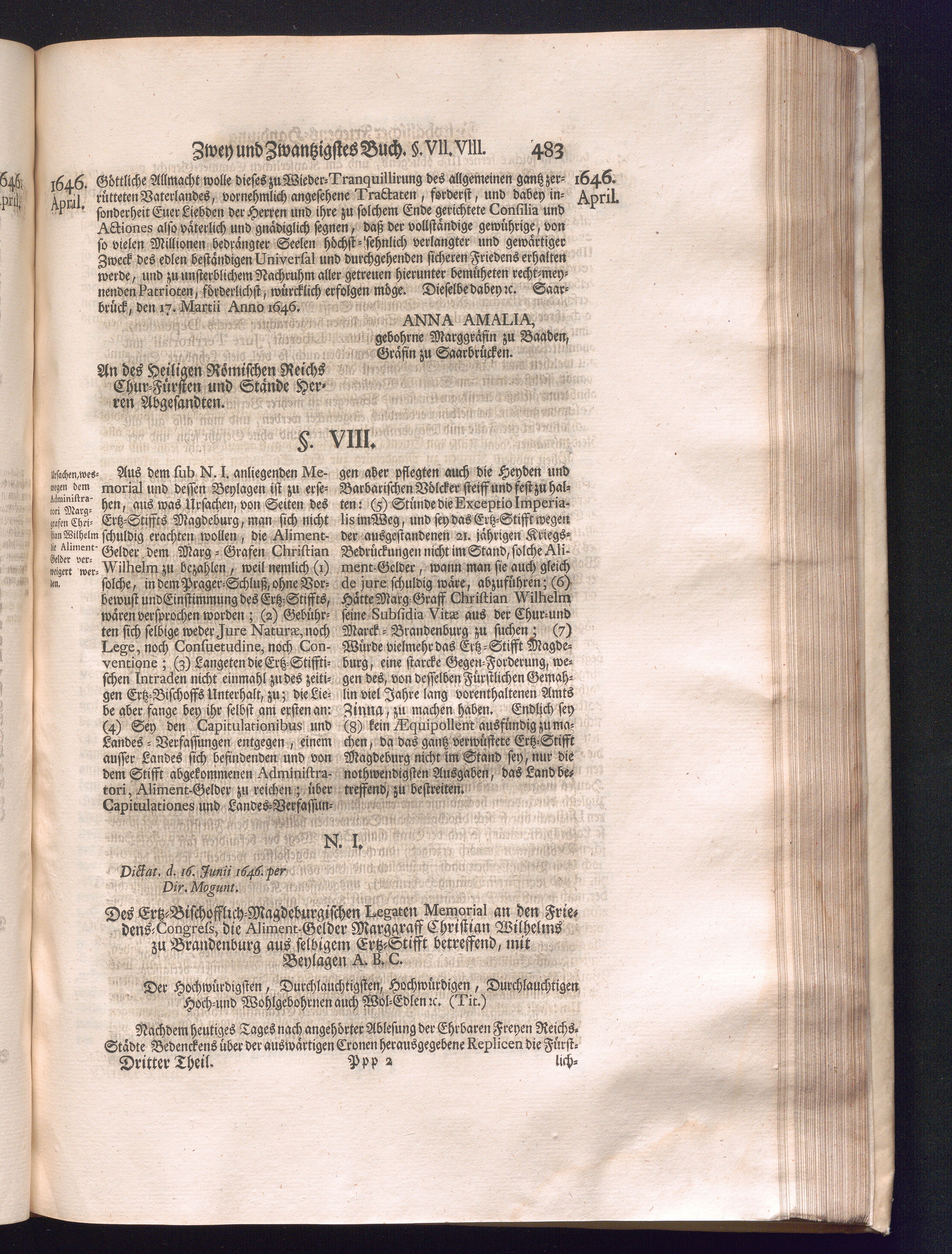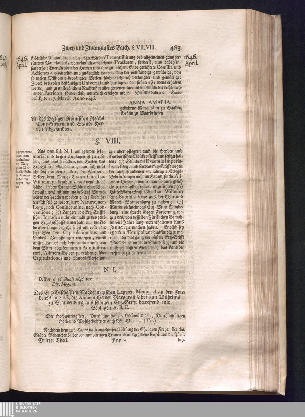 Dritter Theil (1735) Worinnen enthalten, was vom Monath April, biß zu Ende des Jahrs 1646. zwischen Jhro Römisch-Kayserlichen Majestät, dann den Beyden Cronen Franckreich und Schweden, ingleichen des Heiligen Römischen Reichs Chur Fürsten, Fürsten und Ständen, zu Oßnabrück und Münster gehandelt worden
