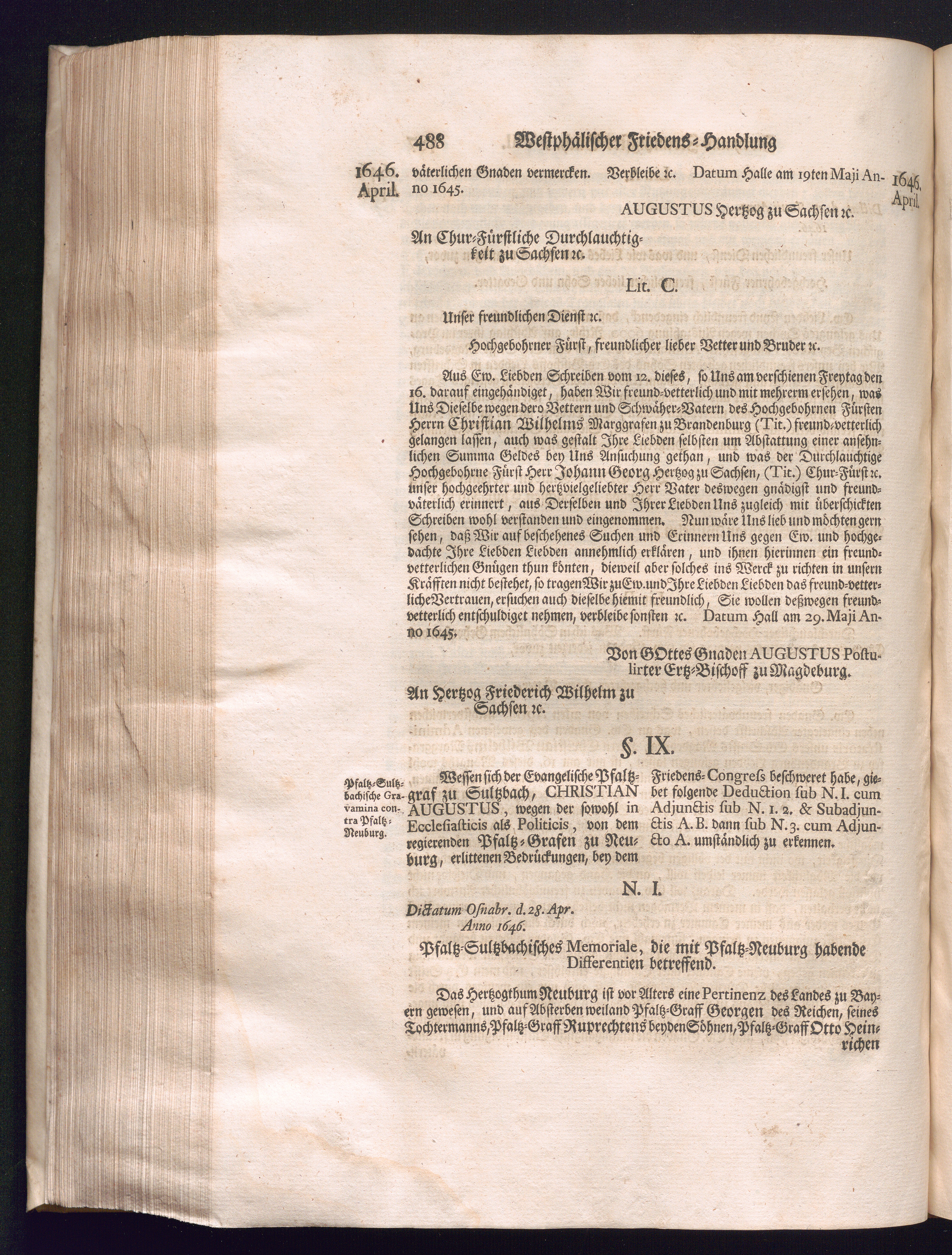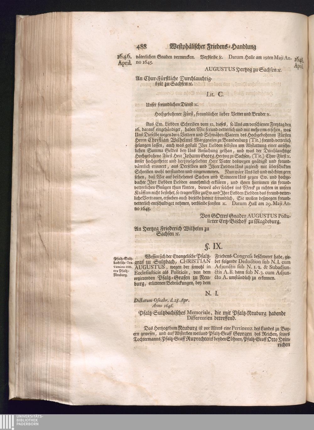 Dritter Theil (1735) Worinnen enthalten, was vom Monath April, biß zu Ende des Jahrs 1646. zwischen Jhro Römisch-Kayserlichen Majestät, dann den Beyden Cronen Franckreich und Schweden, ingleichen des Heiligen Römischen Reichs Chur Fürsten, Fürsten und Ständen, zu Oßnabrück und Münster gehandelt worden