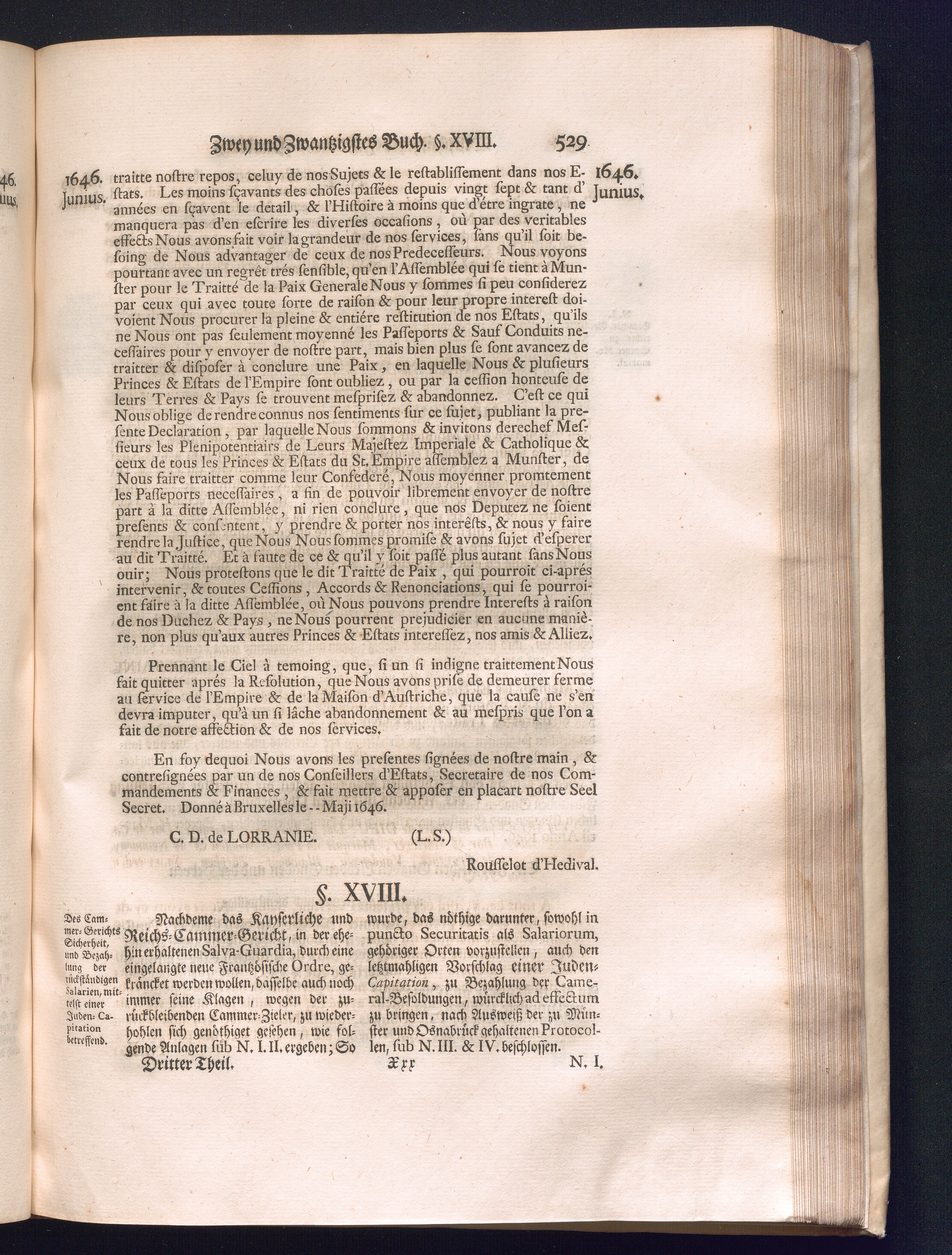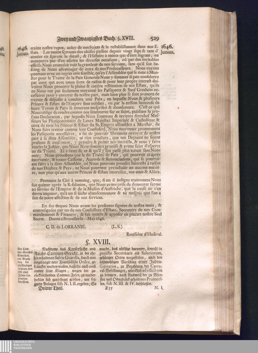 Dritter Theil (1735) Worinnen enthalten, was vom Monath April, biß zu Ende des Jahrs 1646. zwischen Jhro Römisch-Kayserlichen Majestät, dann den Beyden Cronen Franckreich und Schweden, ingleichen des Heiligen Römischen Reichs Chur Fürsten, Fürsten und Ständen, zu Oßnabrück und Münster gehandelt worden