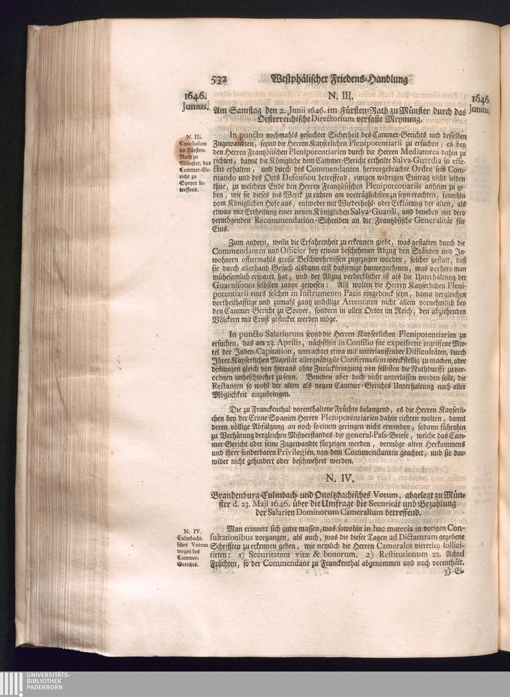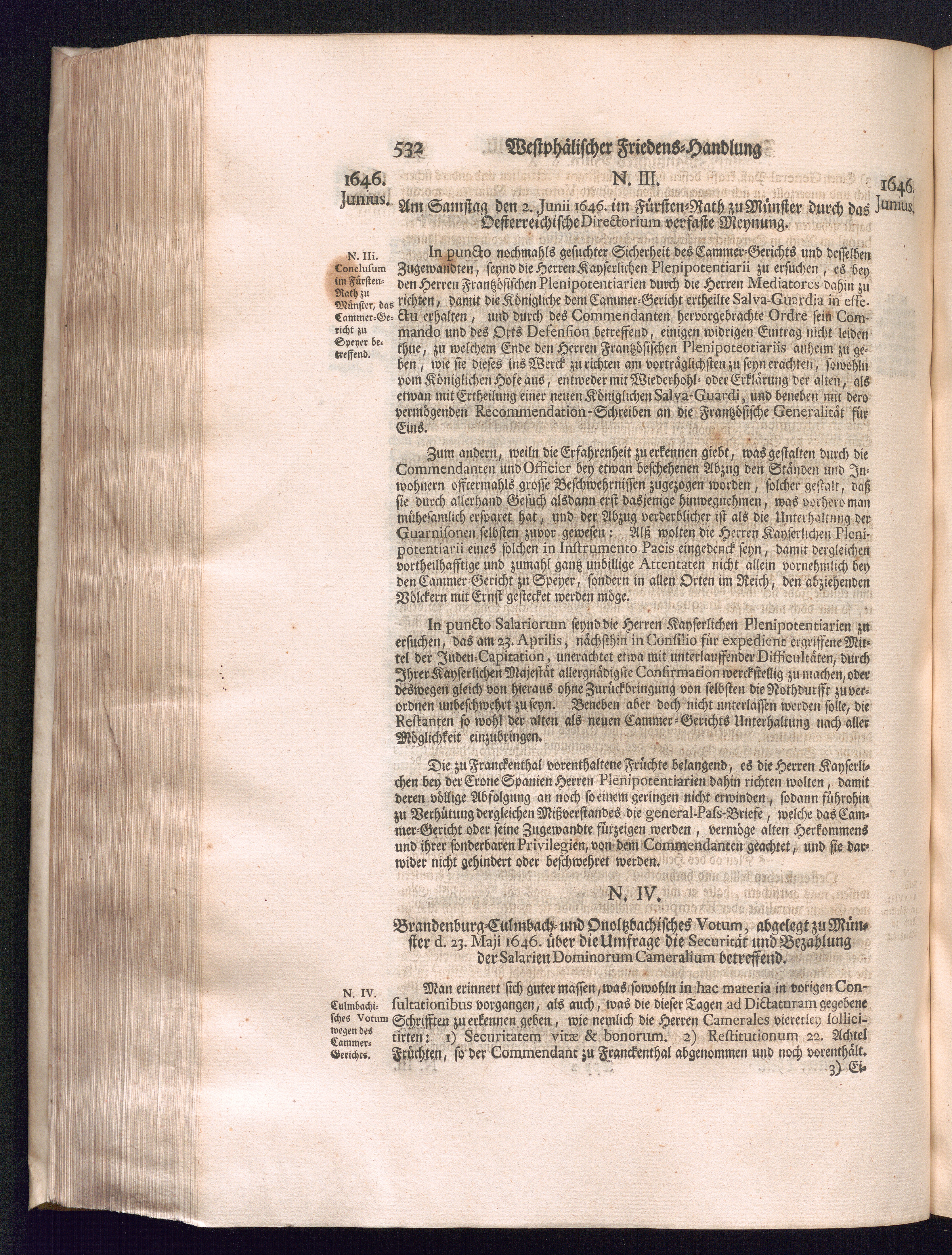 Dritter Theil (1735) Worinnen enthalten, was vom Monath April, biß zu Ende des Jahrs 1646. zwischen Jhro Römisch-Kayserlichen Majestät, dann den Beyden Cronen Franckreich und Schweden, ingleichen des Heiligen Römischen Reichs Chur Fürsten, Fürsten und Ständen, zu Oßnabrück und Münster gehandelt worden