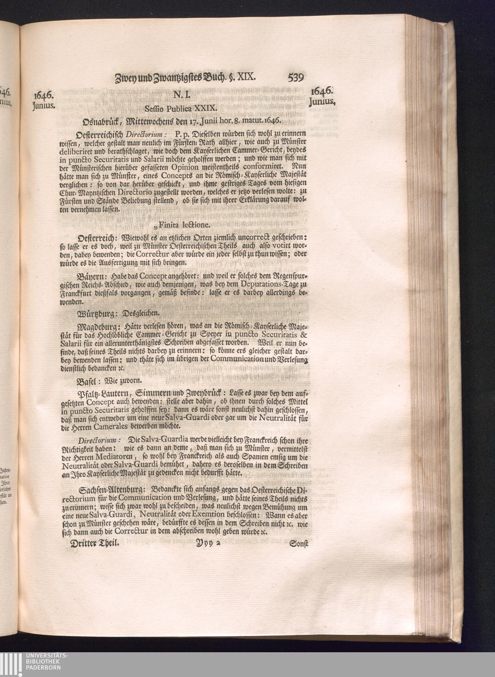 Dritter Theil (1735) Worinnen enthalten, was vom Monath April, biß zu Ende des Jahrs 1646. zwischen Jhro Römisch-Kayserlichen Majestät, dann den Beyden Cronen Franckreich und Schweden, ingleichen des Heiligen Römischen Reichs Chur Fürsten, Fürsten und Ständen, zu Oßnabrück und Münster gehandelt worden