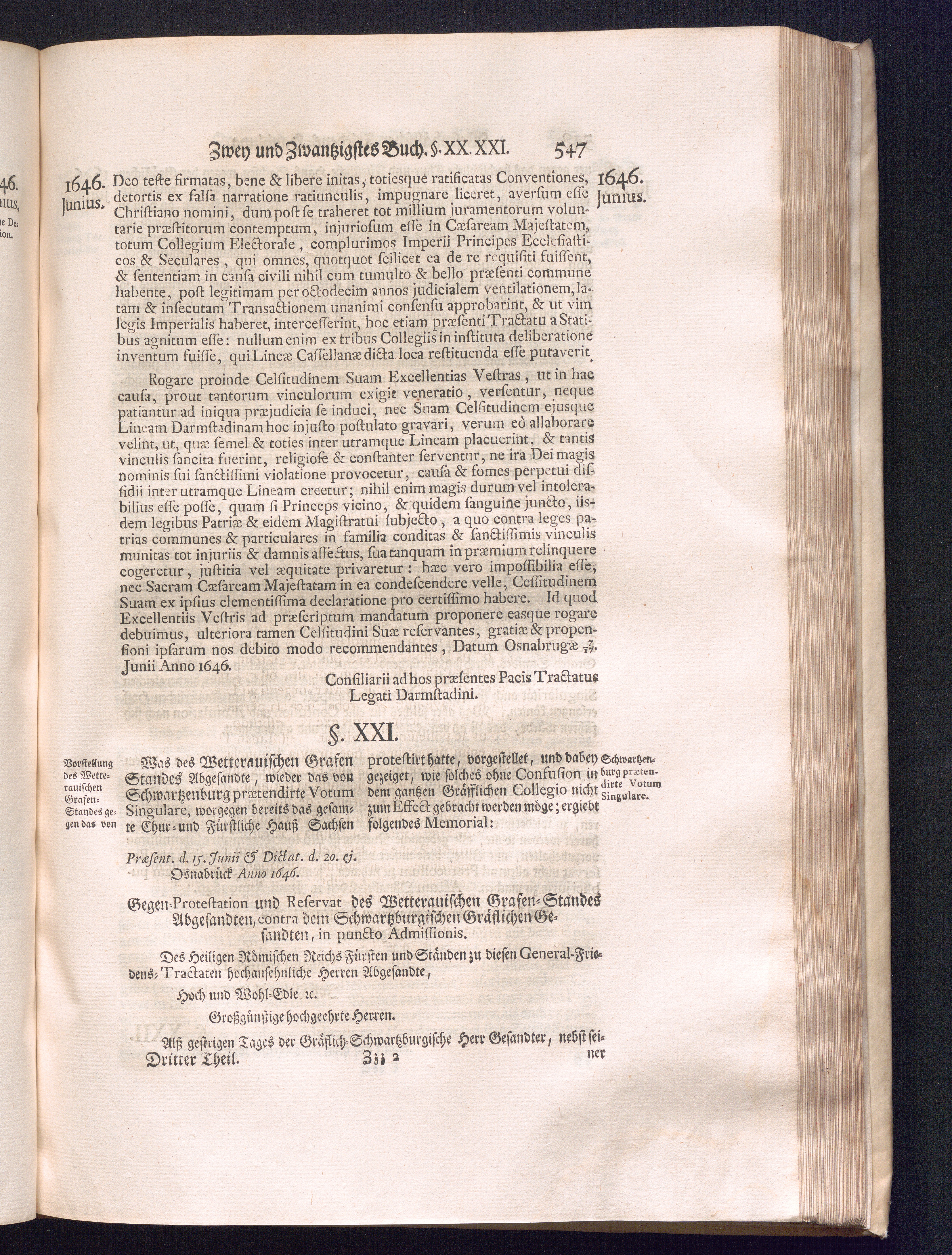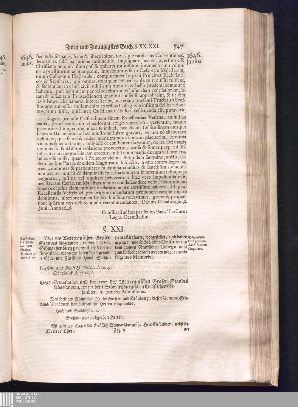 Dritter Theil (1735) Worinnen enthalten, was vom Monath April, biß zu Ende des Jahrs 1646. zwischen Jhro Römisch-Kayserlichen Majestät, dann den Beyden Cronen Franckreich und Schweden, ingleichen des Heiligen Römischen Reichs Chur Fürsten, Fürsten und Ständen, zu Oßnabrück und Münster gehandelt worden