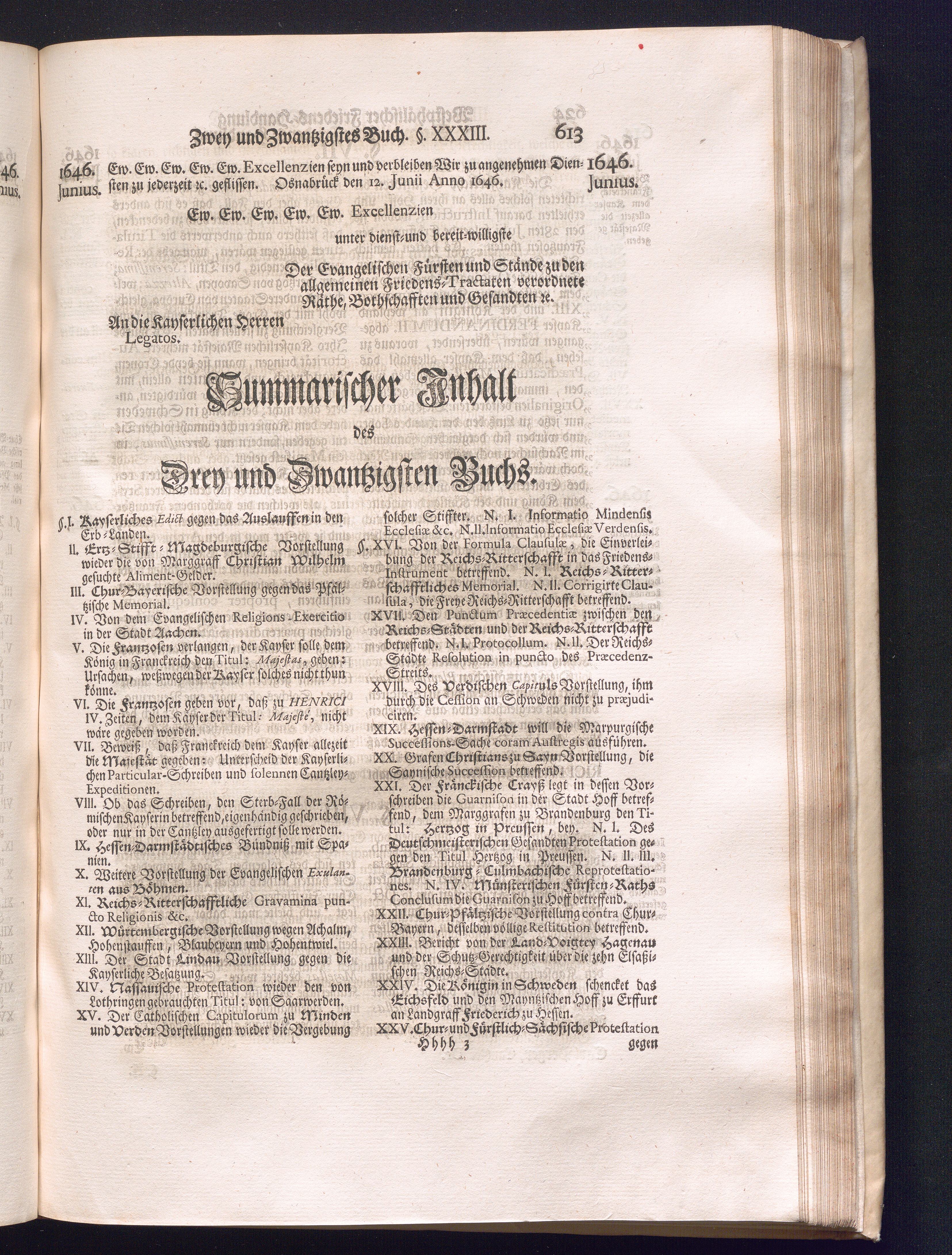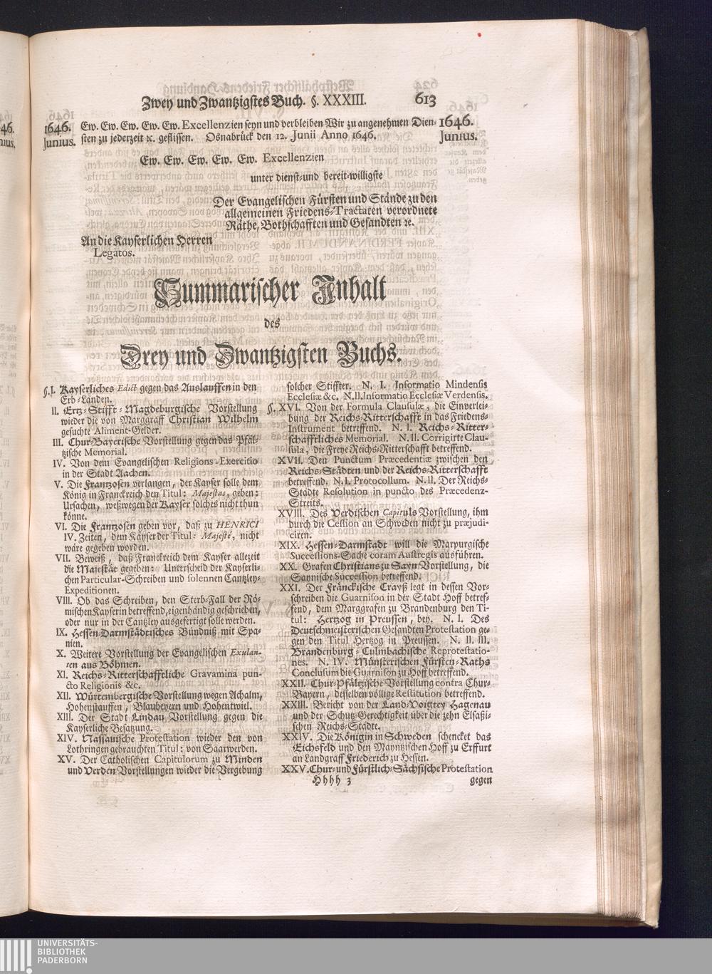 Dritter Theil (1735) Worinnen enthalten, was vom Monath April, biß zu Ende des Jahrs 1646. zwischen Jhro Römisch-Kayserlichen Majestät, dann den Beyden Cronen Franckreich und Schweden, ingleichen des Heiligen Römischen Reichs Chur Fürsten, Fürsten und Ständen, zu Oßnabrück und Münster gehandelt worden