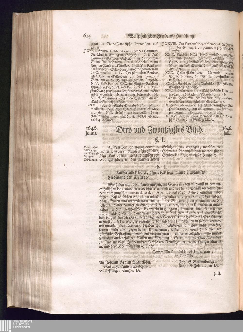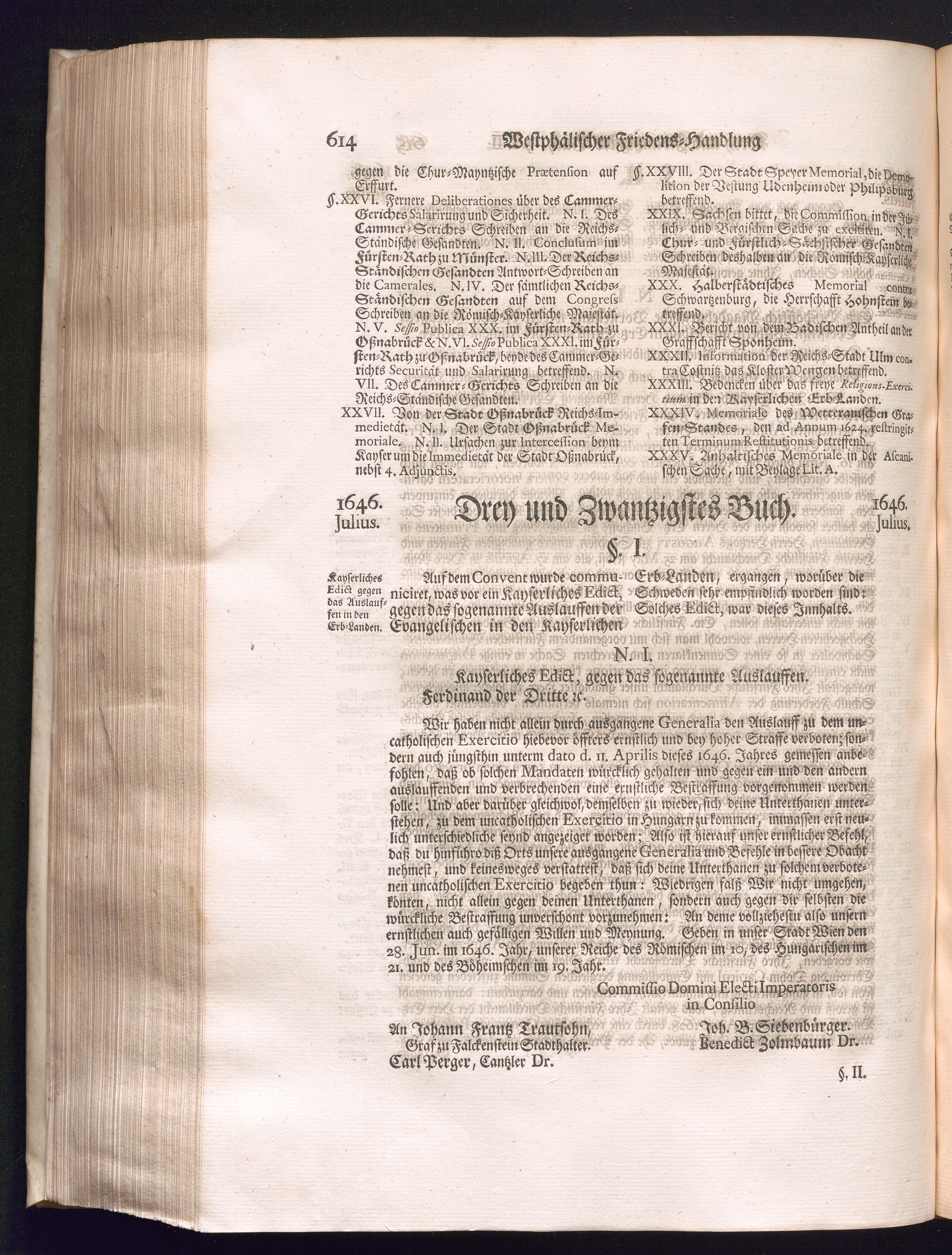 Dritter Theil (1735) Worinnen enthalten, was vom Monath April, biß zu Ende des Jahrs 1646. zwischen Jhro Römisch-Kayserlichen Majestät, dann den Beyden Cronen Franckreich und Schweden, ingleichen des Heiligen Römischen Reichs Chur Fürsten, Fürsten und Ständen, zu Oßnabrück und Münster gehandelt worden