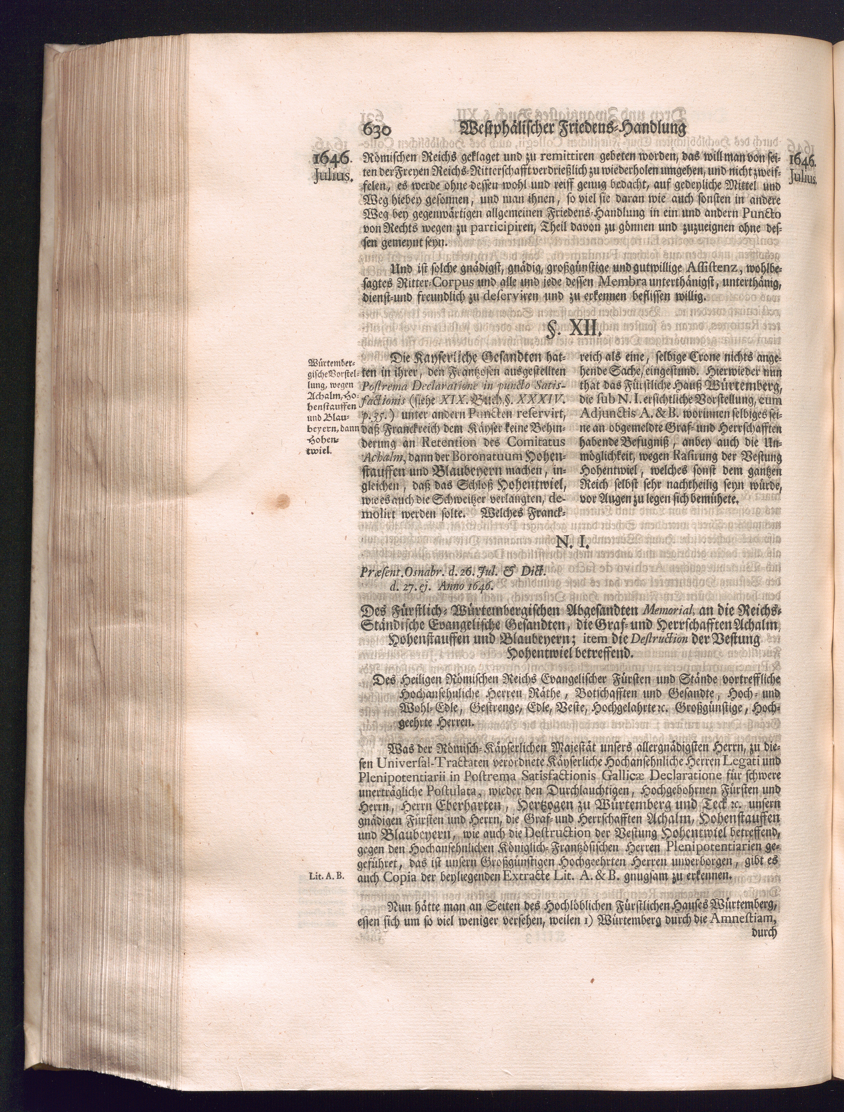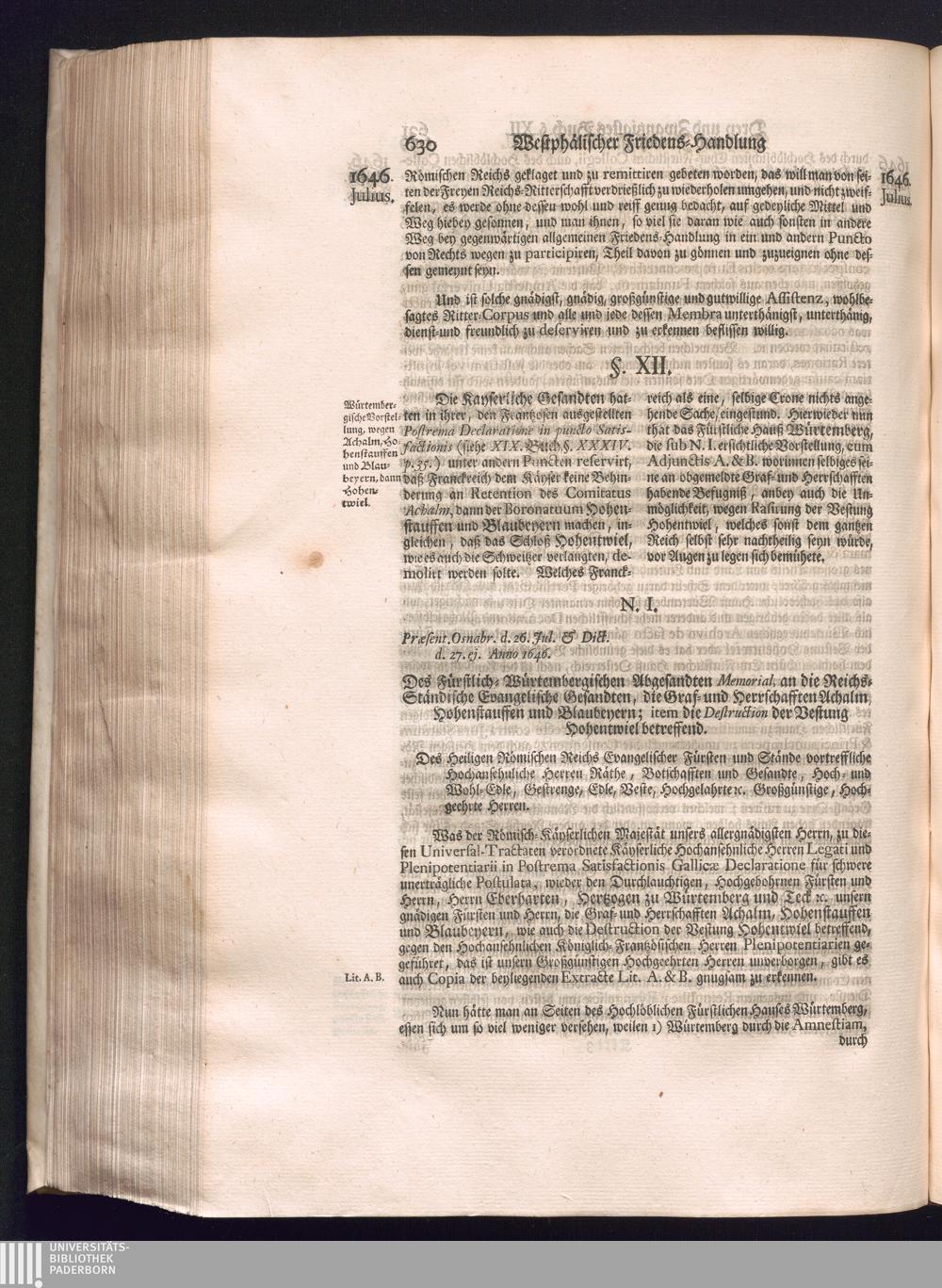 Dritter Theil (1735) Worinnen enthalten, was vom Monath April, biß zu Ende des Jahrs 1646. zwischen Jhro Römisch-Kayserlichen Majestät, dann den Beyden Cronen Franckreich und Schweden, ingleichen des Heiligen Römischen Reichs Chur Fürsten, Fürsten und Ständen, zu Oßnabrück und Münster gehandelt worden