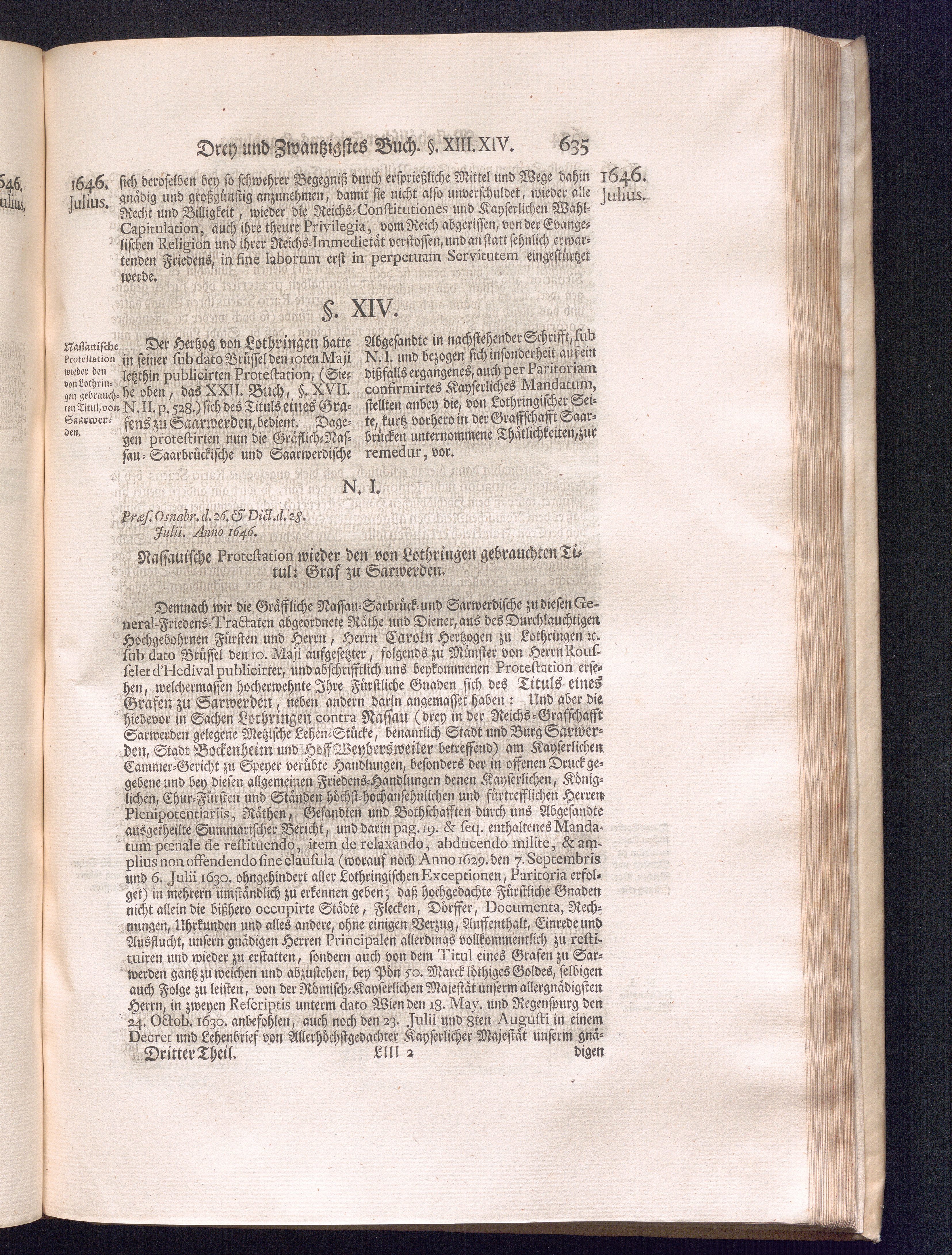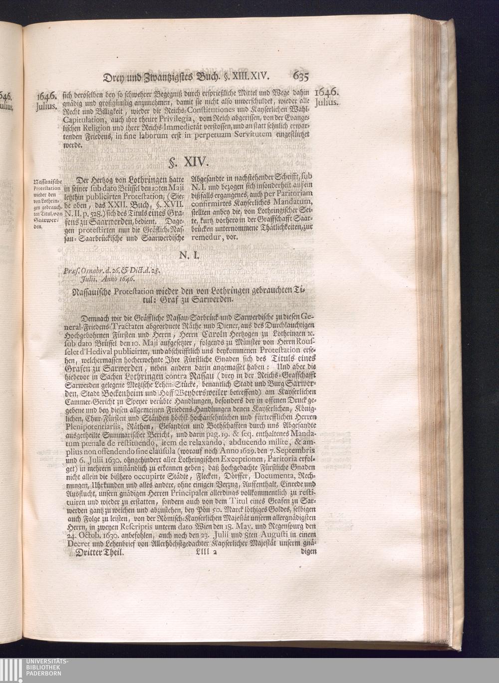 Dritter Theil (1735) Worinnen enthalten, was vom Monath April, biß zu Ende des Jahrs 1646. zwischen Jhro Römisch-Kayserlichen Majestät, dann den Beyden Cronen Franckreich und Schweden, ingleichen des Heiligen Römischen Reichs Chur Fürsten, Fürsten und Ständen, zu Oßnabrück und Münster gehandelt worden