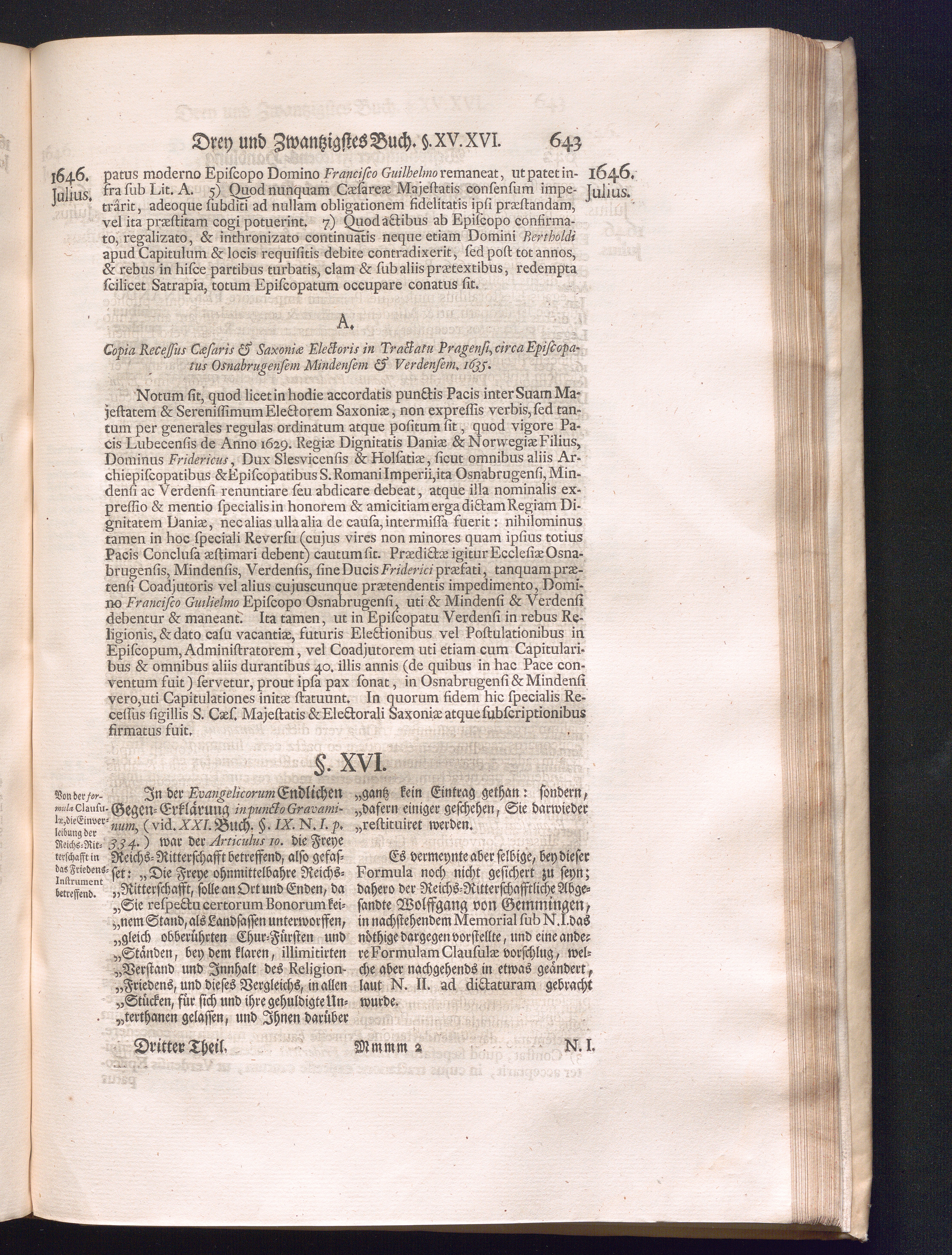 Dritter Theil (1735) Worinnen enthalten, was vom Monath April, biß zu Ende des Jahrs 1646. zwischen Jhro Römisch-Kayserlichen Majestät, dann den Beyden Cronen Franckreich und Schweden, ingleichen des Heiligen Römischen Reichs Chur Fürsten, Fürsten und Ständen, zu Oßnabrück und Münster gehandelt worden