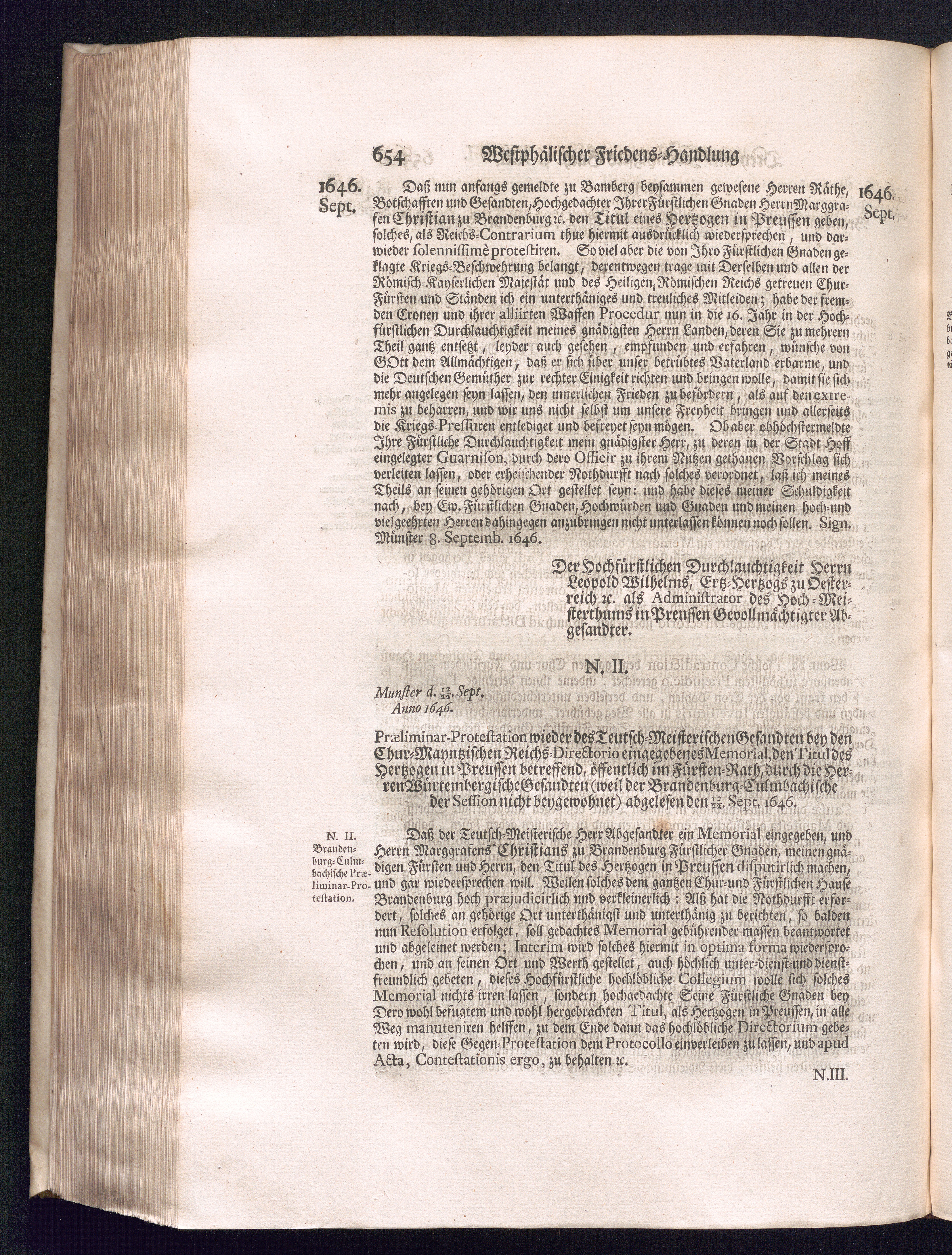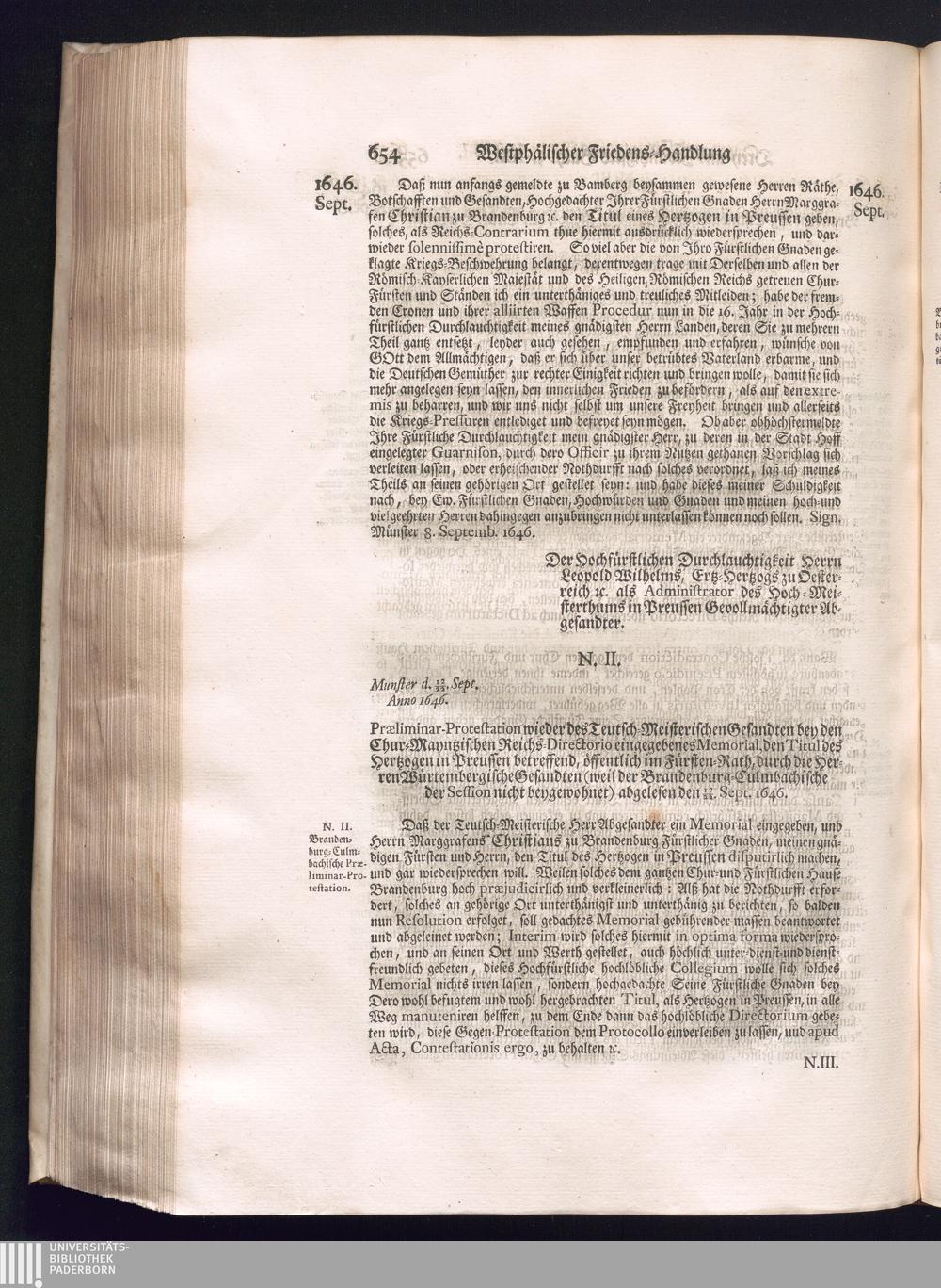 Dritter Theil (1735) Worinnen enthalten, was vom Monath April, biß zu Ende des Jahrs 1646. zwischen Jhro Römisch-Kayserlichen Majestät, dann den Beyden Cronen Franckreich und Schweden, ingleichen des Heiligen Römischen Reichs Chur Fürsten, Fürsten und Ständen, zu Oßnabrück und Münster gehandelt worden