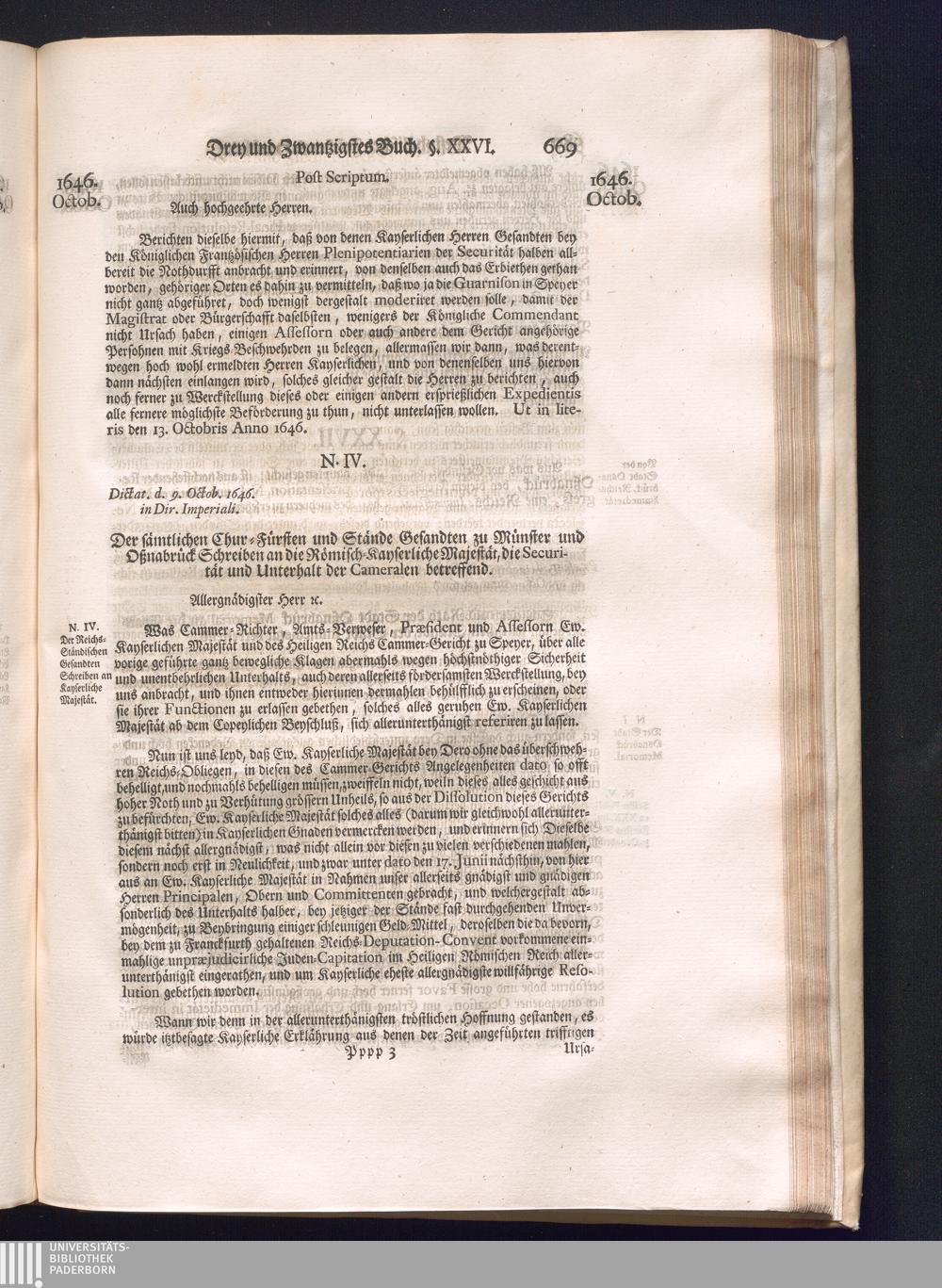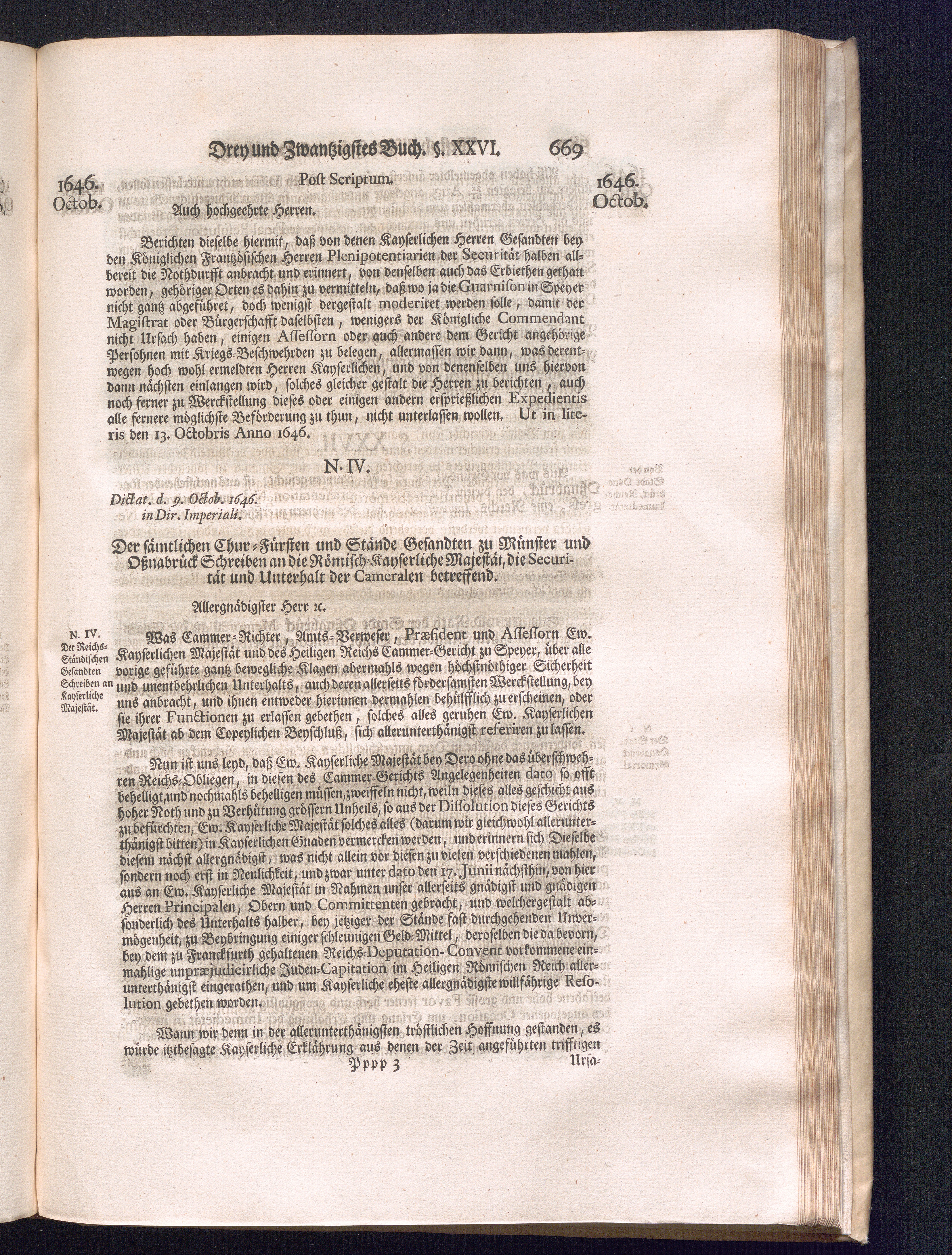 Dritter Theil (1735) Worinnen enthalten, was vom Monath April, biß zu Ende des Jahrs 1646. zwischen Jhro Römisch-Kayserlichen Majestät, dann den Beyden Cronen Franckreich und Schweden, ingleichen des Heiligen Römischen Reichs Chur Fürsten, Fürsten und Ständen, zu Oßnabrück und Münster gehandelt worden