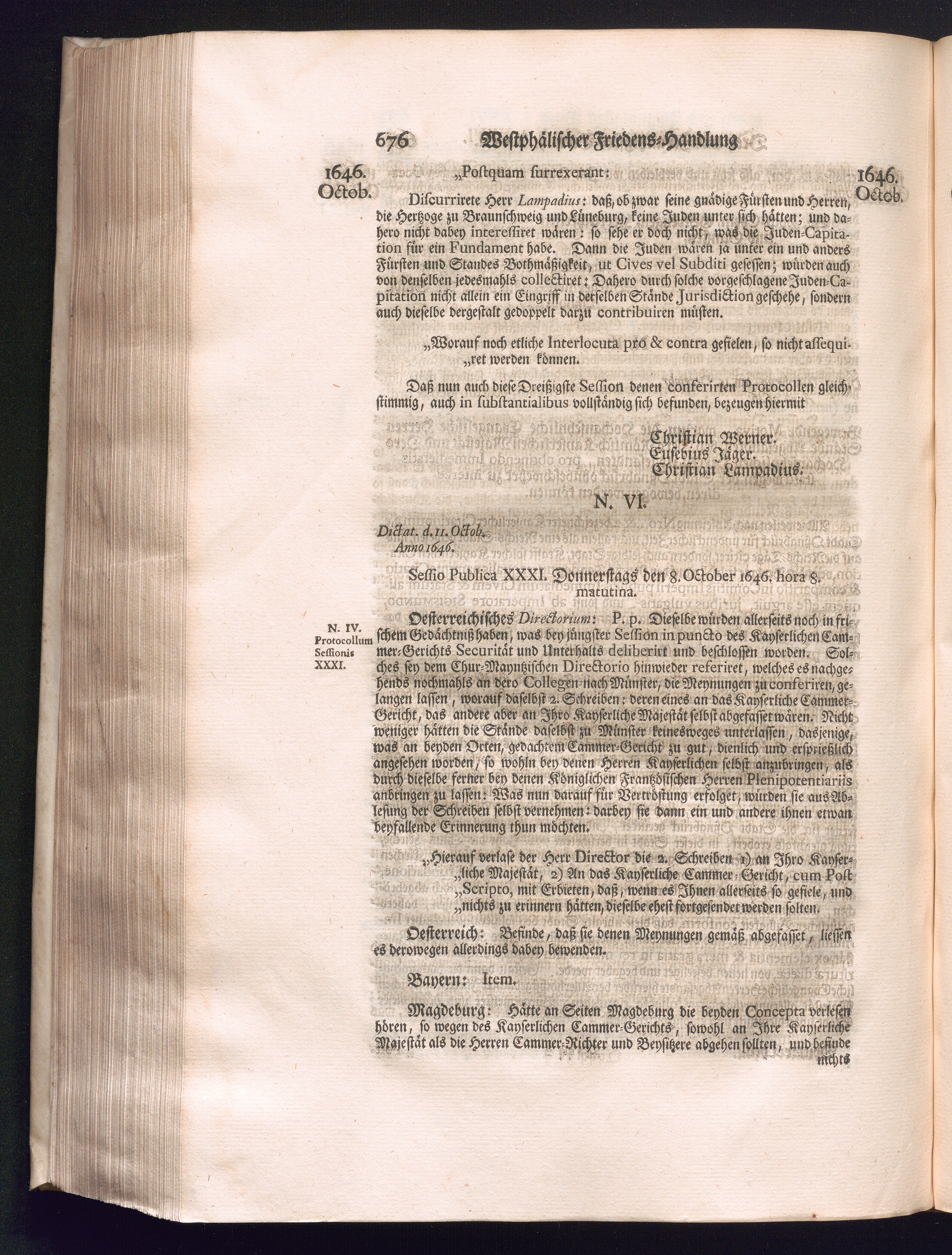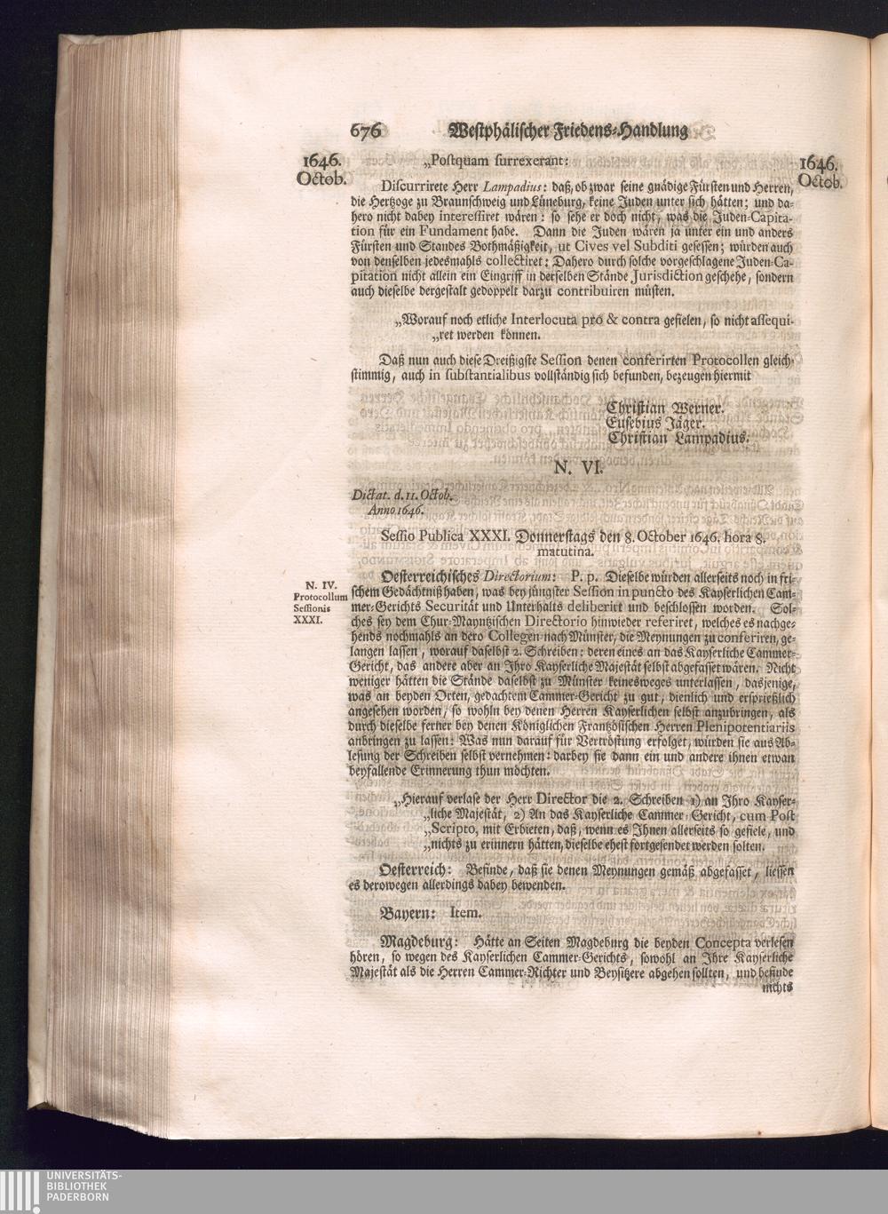 Dritter Theil (1735) Worinnen enthalten, was vom Monath April, biß zu Ende des Jahrs 1646. zwischen Jhro Römisch-Kayserlichen Majestät, dann den Beyden Cronen Franckreich und Schweden, ingleichen des Heiligen Römischen Reichs Chur Fürsten, Fürsten und Ständen, zu Oßnabrück und Münster gehandelt worden