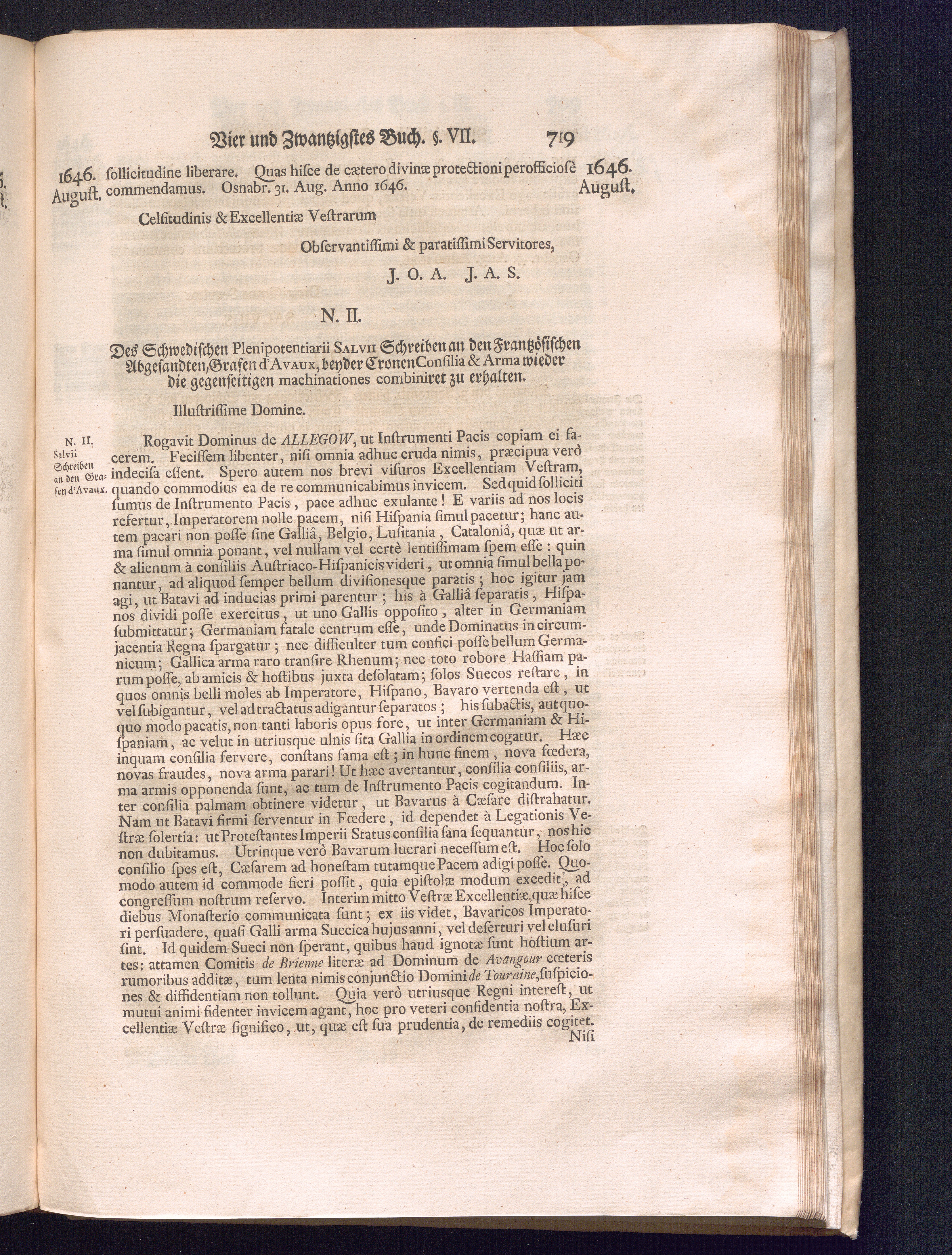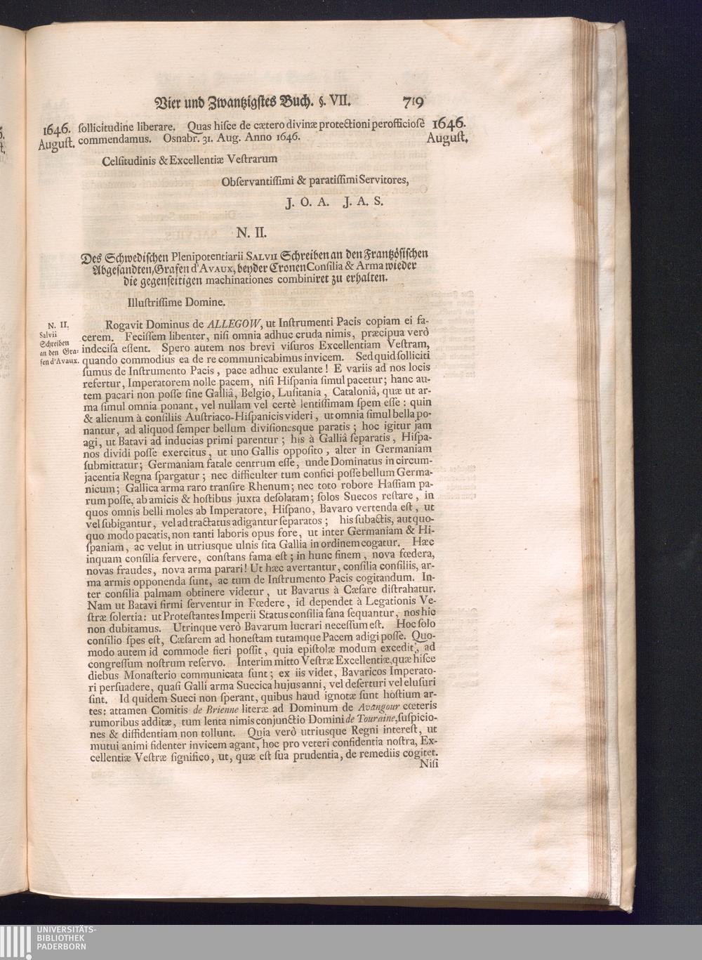 Dritter Theil (1735) Worinnen enthalten, was vom Monath April, biß zu Ende des Jahrs 1646. zwischen Jhro Römisch-Kayserlichen Majestät, dann den Beyden Cronen Franckreich und Schweden, ingleichen des Heiligen Römischen Reichs Chur Fürsten, Fürsten und Ständen, zu Oßnabrück und Münster gehandelt worden