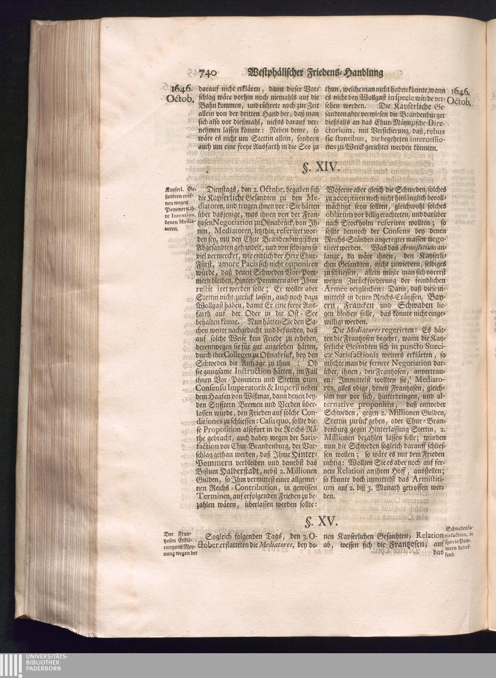 Dritter Theil (1735) Worinnen enthalten, was vom Monath April, biß zu Ende des Jahrs 1646. zwischen Jhro Römisch-Kayserlichen Majestät, dann den Beyden Cronen Franckreich und Schweden, ingleichen des Heiligen Römischen Reichs Chur Fürsten, Fürsten und Ständen, zu Oßnabrück und Münster gehandelt worden