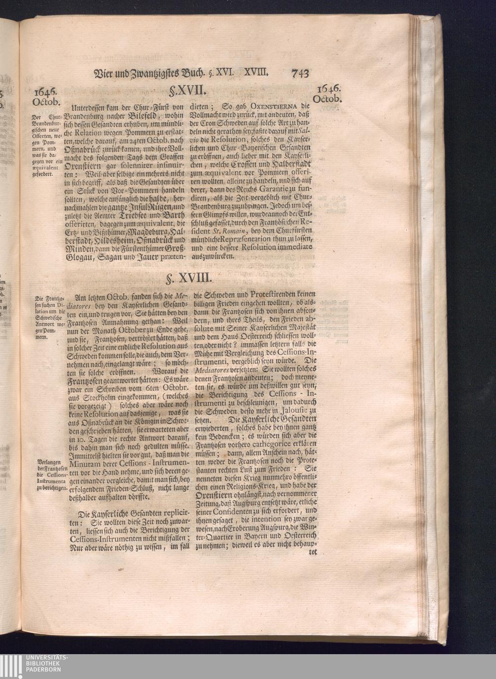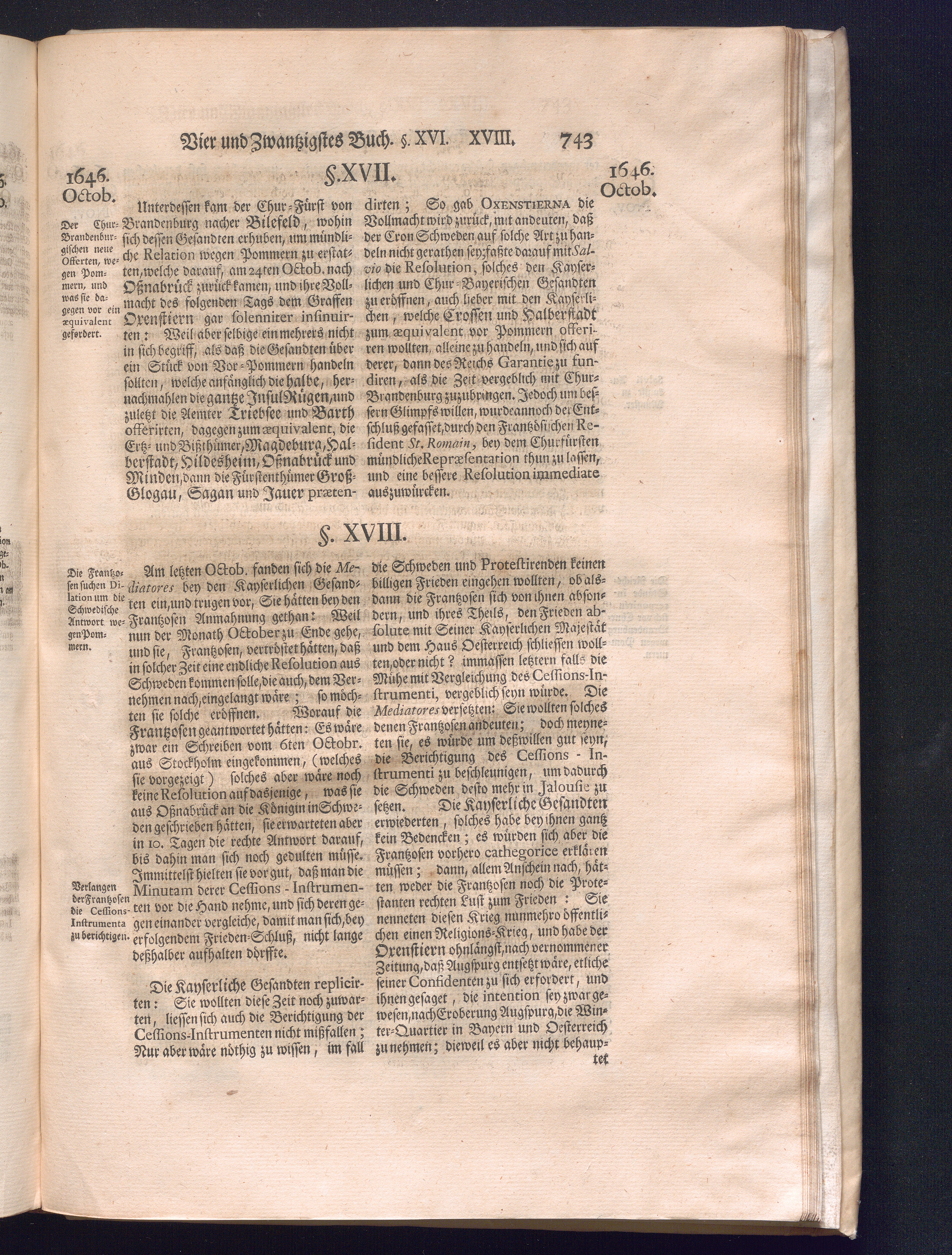Dritter Theil (1735) Worinnen enthalten, was vom Monath April, biß zu Ende des Jahrs 1646. zwischen Jhro Römisch-Kayserlichen Majestät, dann den Beyden Cronen Franckreich und Schweden, ingleichen des Heiligen Römischen Reichs Chur Fürsten, Fürsten und Ständen, zu Oßnabrück und Münster gehandelt worden