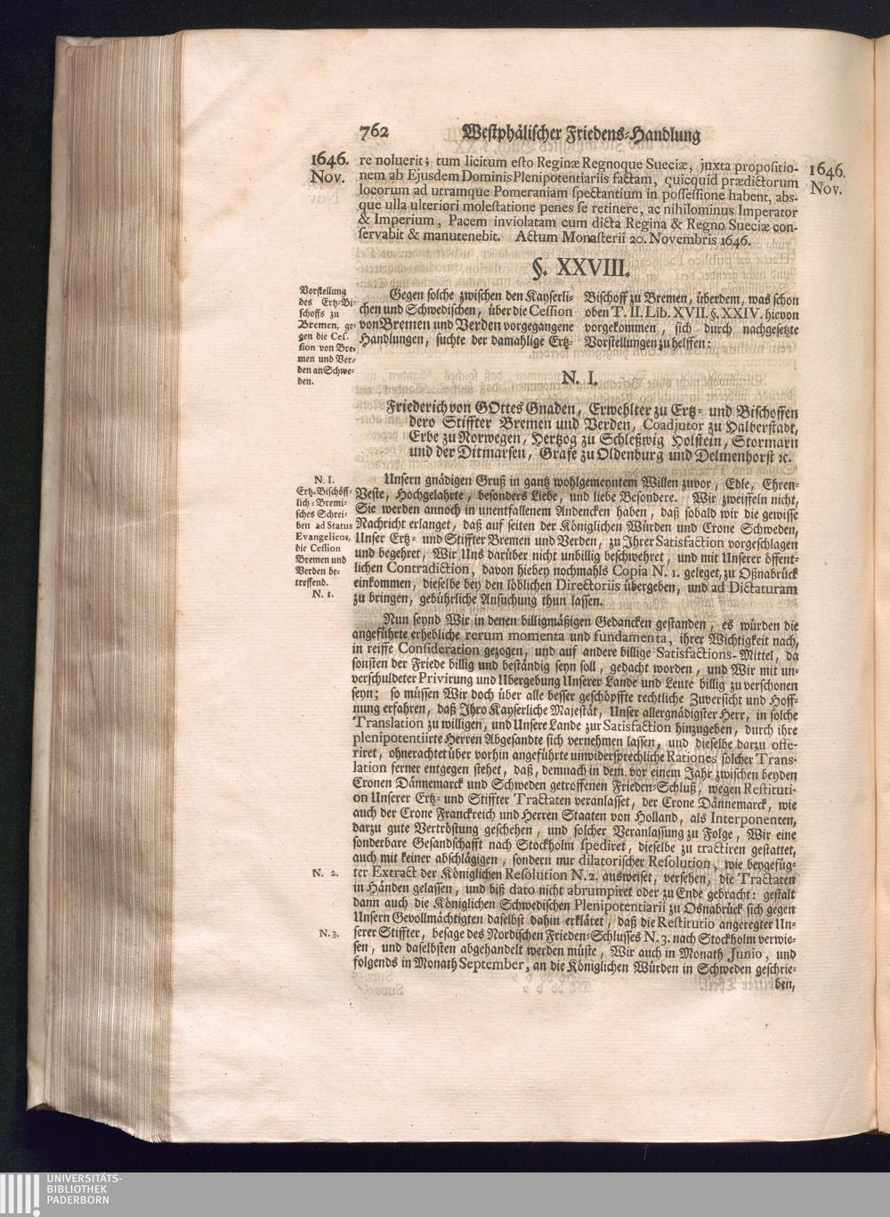 Dritter Theil (1735) Worinnen enthalten, was vom Monath April, biß zu Ende des Jahrs 1646. zwischen Jhro Römisch-Kayserlichen Majestät, dann den Beyden Cronen Franckreich und Schweden, ingleichen des Heiligen Römischen Reichs Chur Fürsten, Fürsten und Ständen, zu Oßnabrück und Münster gehandelt worden