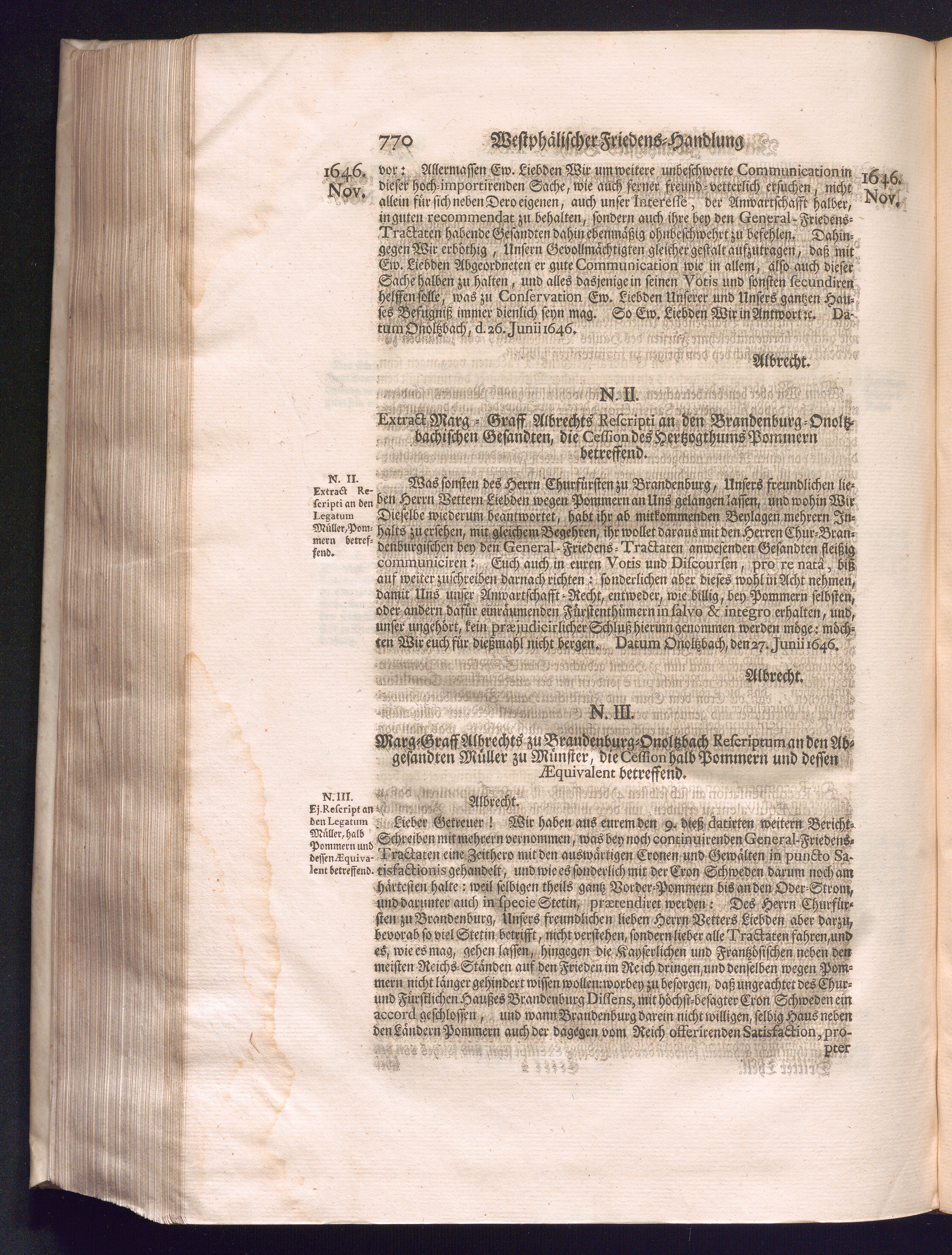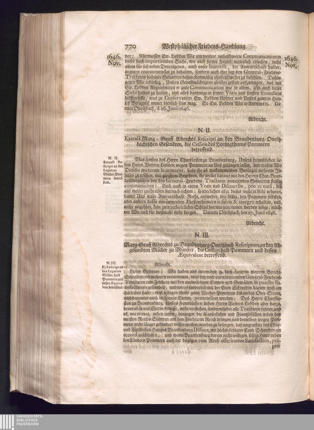 Dritter Theil (1735) Worinnen enthalten, was vom Monath April, biß zu Ende des Jahrs 1646. zwischen Jhro Römisch-Kayserlichen Majestät, dann den Beyden Cronen Franckreich und Schweden, ingleichen des Heiligen Römischen Reichs Chur Fürsten, Fürsten und Ständen, zu Oßnabrück und Münster gehandelt worden