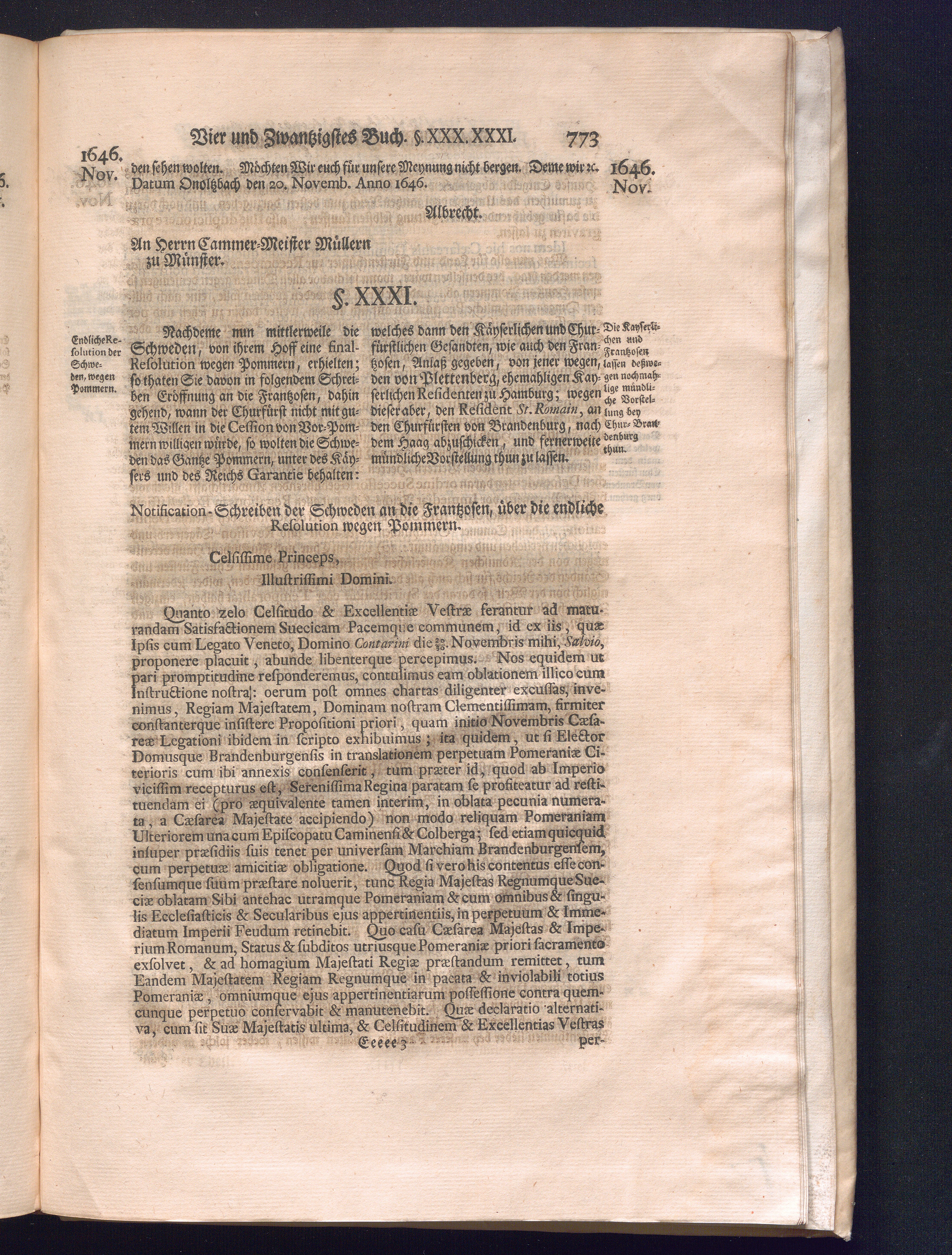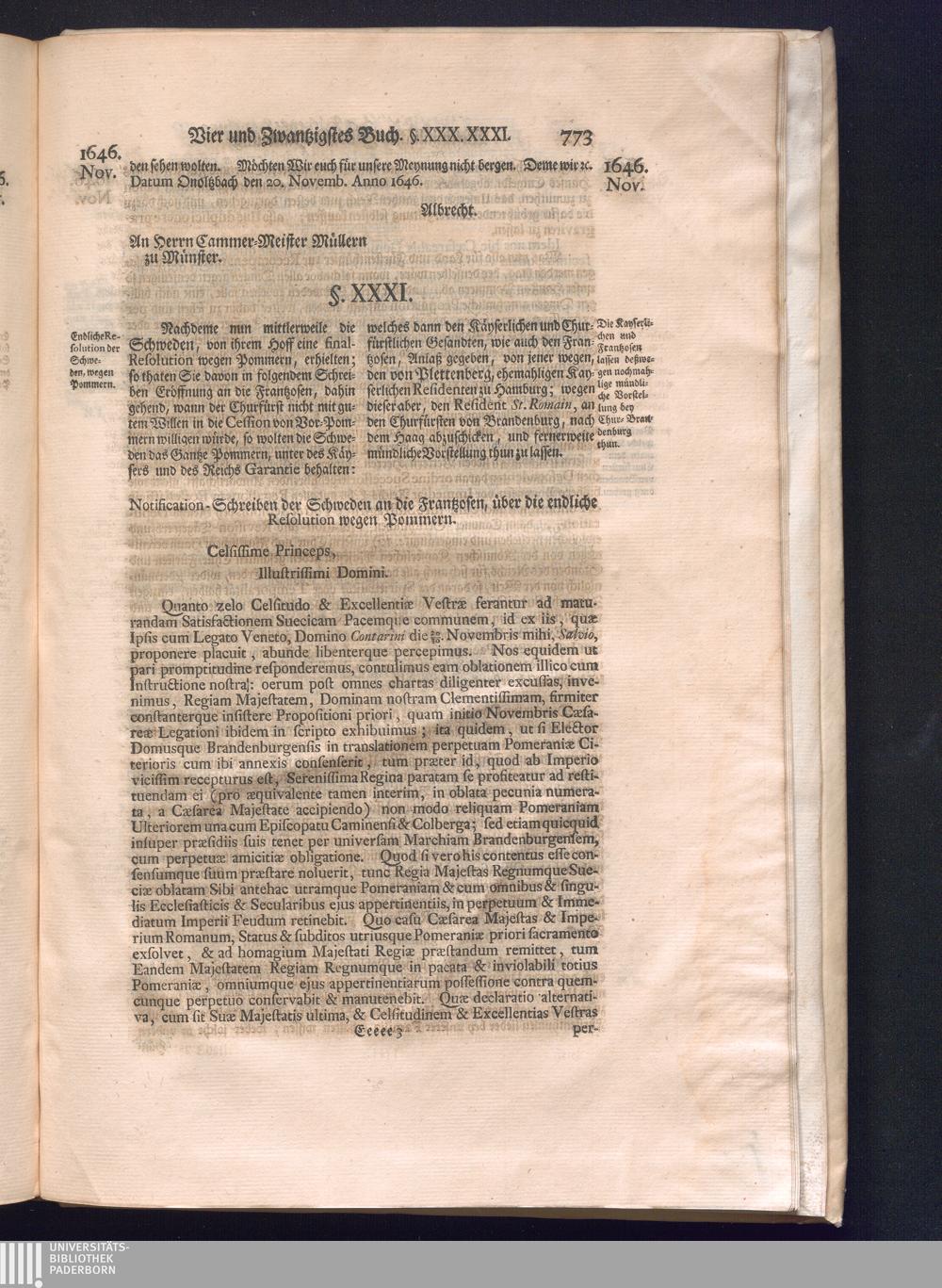 Dritter Theil (1735) Worinnen enthalten, was vom Monath April, biß zu Ende des Jahrs 1646. zwischen Jhro Römisch-Kayserlichen Majestät, dann den Beyden Cronen Franckreich und Schweden, ingleichen des Heiligen Römischen Reichs Chur Fürsten, Fürsten und Ständen, zu Oßnabrück und Münster gehandelt worden