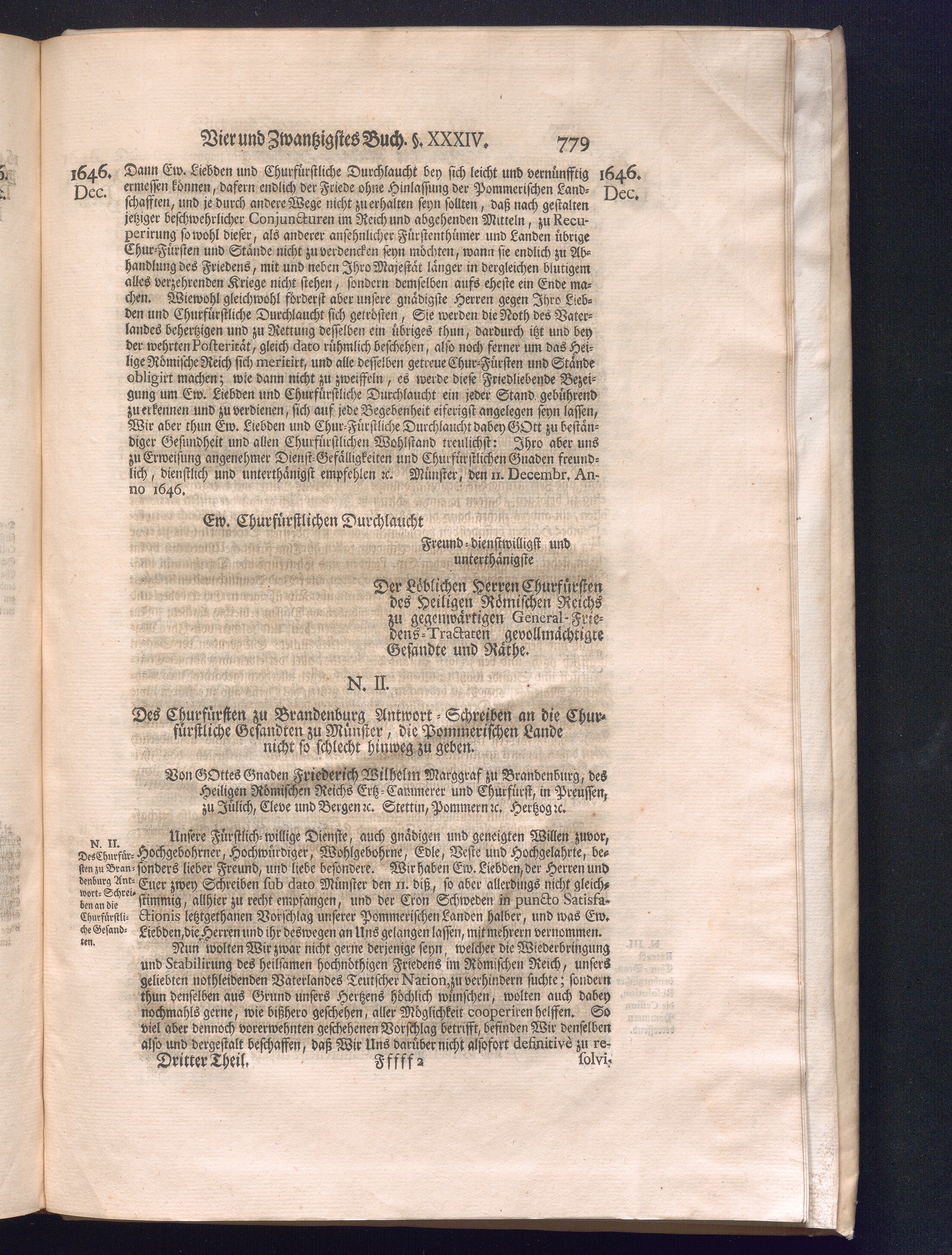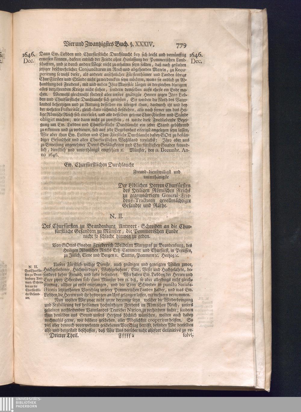 Dritter Theil (1735) Worinnen enthalten, was vom Monath April, biß zu Ende des Jahrs 1646. zwischen Jhro Römisch-Kayserlichen Majestät, dann den Beyden Cronen Franckreich und Schweden, ingleichen des Heiligen Römischen Reichs Chur Fürsten, Fürsten und Ständen, zu Oßnabrück und Münster gehandelt worden