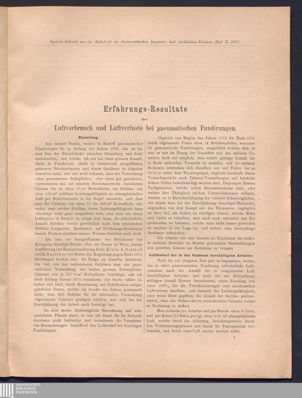 Erfahrungsresultate über Luftverbrauch und über Reibungswiderstände : Mittheilungen über pneumatische Fundirungen / von Adolph Schmoll v. Eisenwerth