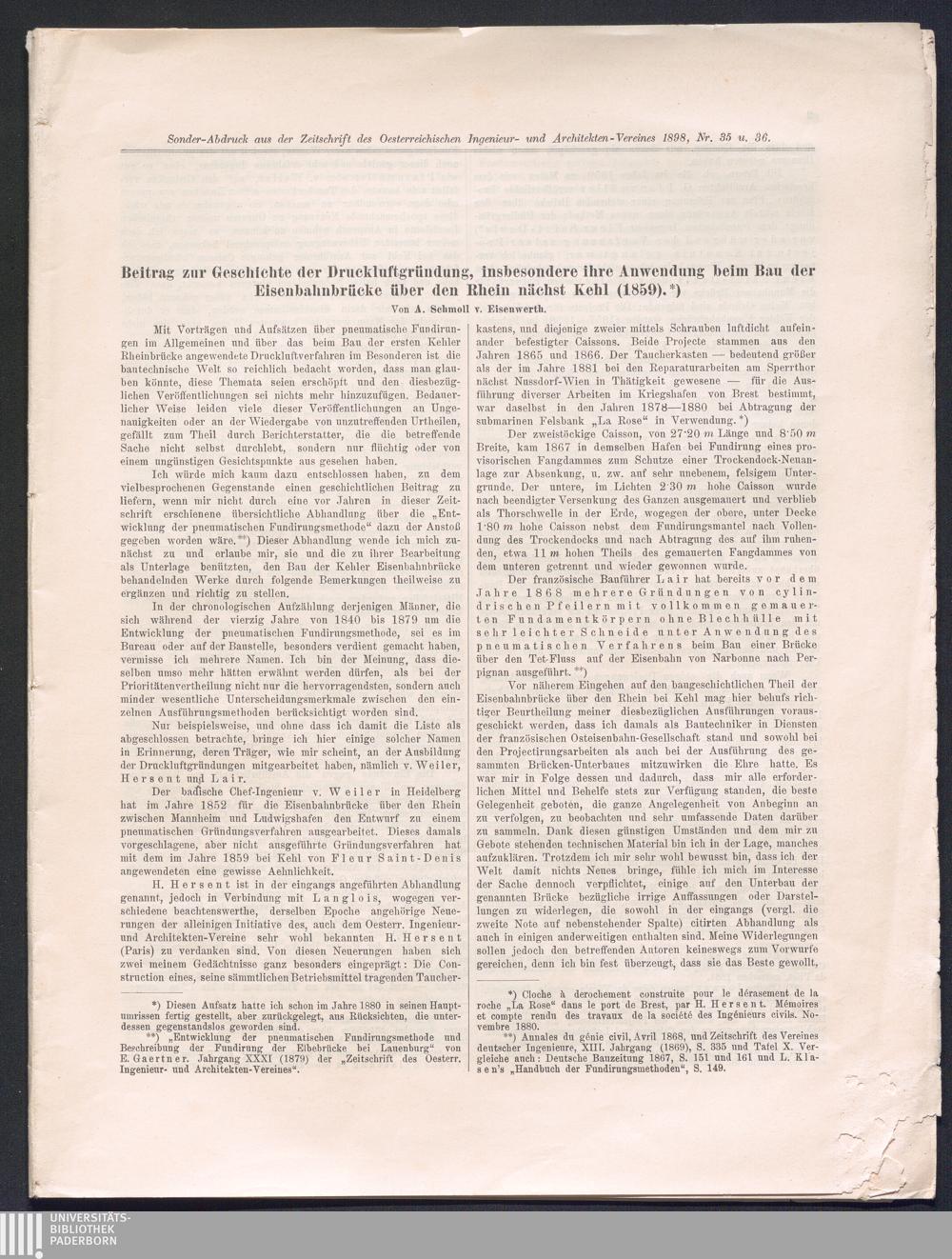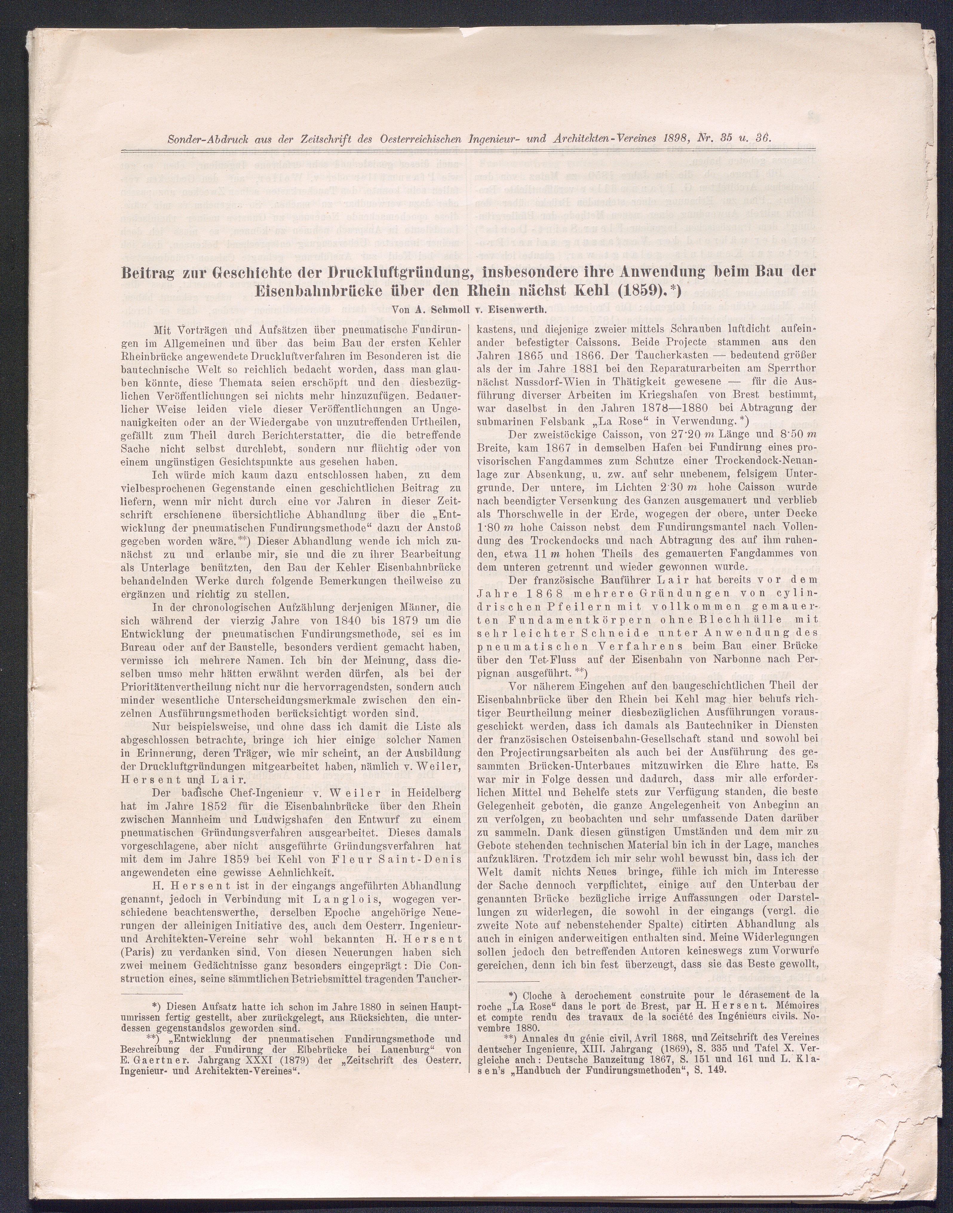 Beitrag zur Geschichte der Druckluftgründung, insbesondere ihre Anwendung beim Bau der Eisenbahnbrücke über den Rhein nächst Kehl (1859) / von A. Schmolll v. Eisenwerth