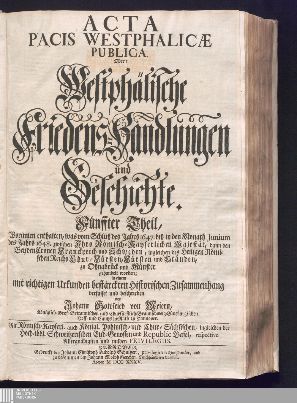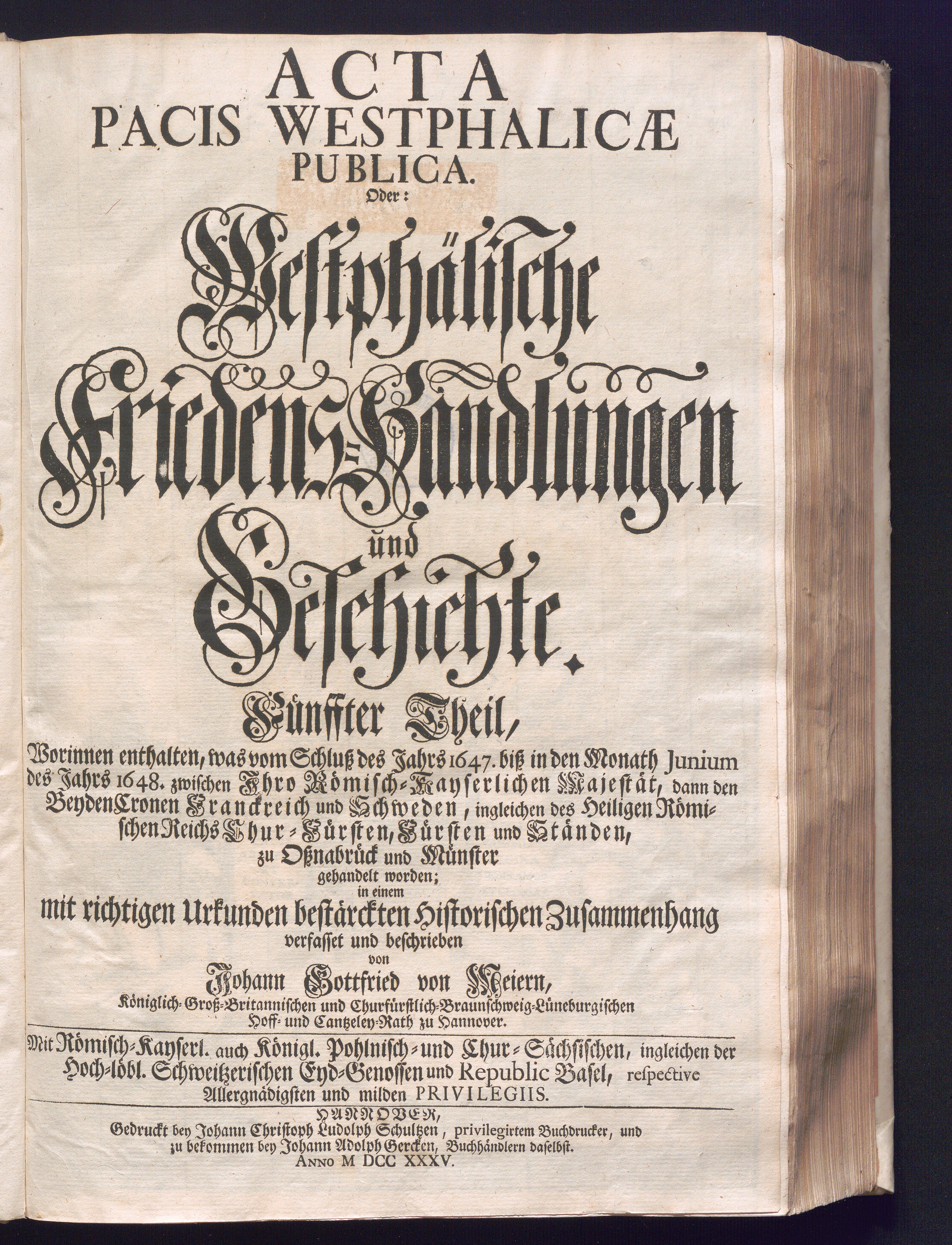 Fünffter Theil (1735) Worinnen enthalten, was vom Schluß des Jahrs 1647. biß in den Monath Junium des Jahrs 1648. zwischen Jhro Römisch-Kayserlichen Majestät, dann den Beyden Cronen Franckreich und Schweden, ingleichen des Heiligen Römischen Reichs Chur-Fürsten, Fürsten und Ständen, zu Oßnabrück und Münster gehandelt worden
