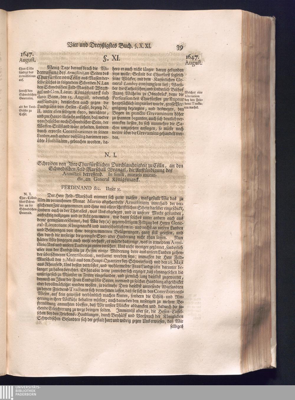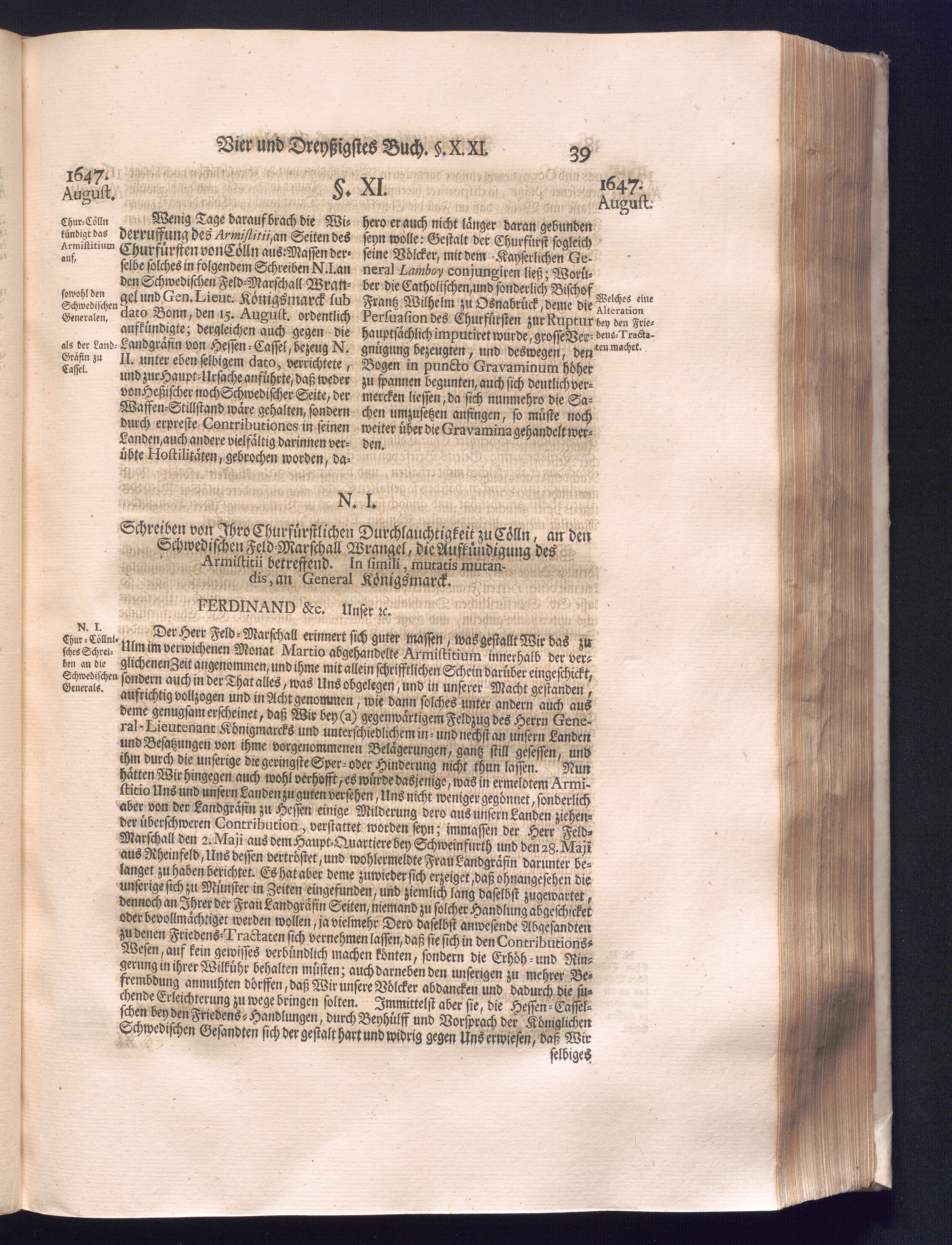 Fünffter Theil (1735) Worinnen enthalten, was vom Schluß des Jahrs 1647. biß in den Monath Junium des Jahrs 1648. zwischen Jhro Römisch-Kayserlichen Majestät, dann den Beyden Cronen Franckreich und Schweden, ingleichen des Heiligen Römischen Reichs Chur-Fürsten, Fürsten und Ständen, zu Oßnabrück und Münster gehandelt worden