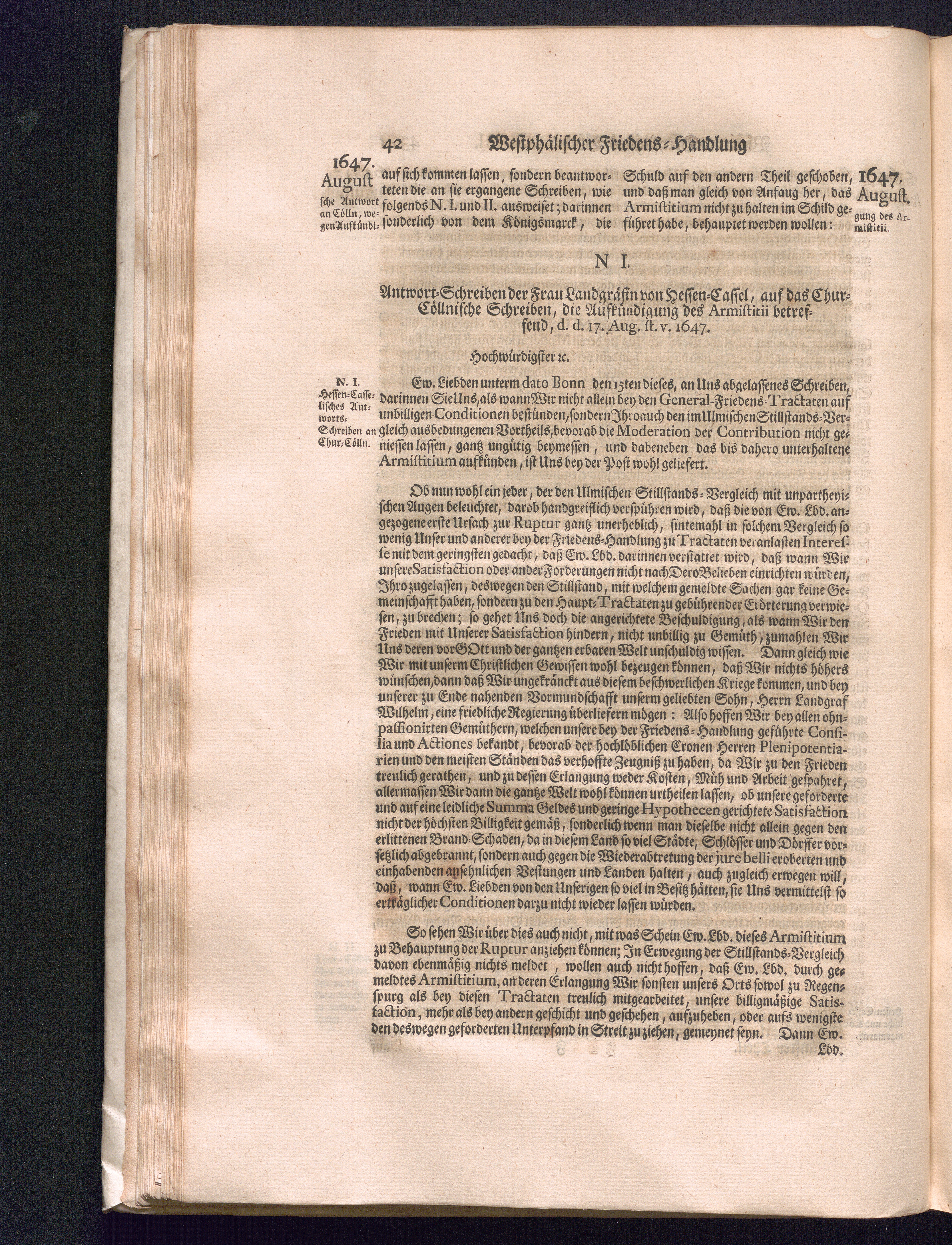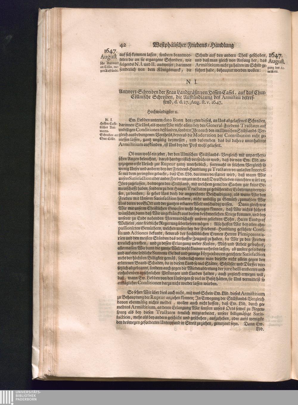 Fünffter Theil (1735) Worinnen enthalten, was vom Schluß des Jahrs 1647. biß in den Monath Junium des Jahrs 1648. zwischen Jhro Römisch-Kayserlichen Majestät, dann den Beyden Cronen Franckreich und Schweden, ingleichen des Heiligen Römischen Reichs Chur-Fürsten, Fürsten und Ständen, zu Oßnabrück und Münster gehandelt worden