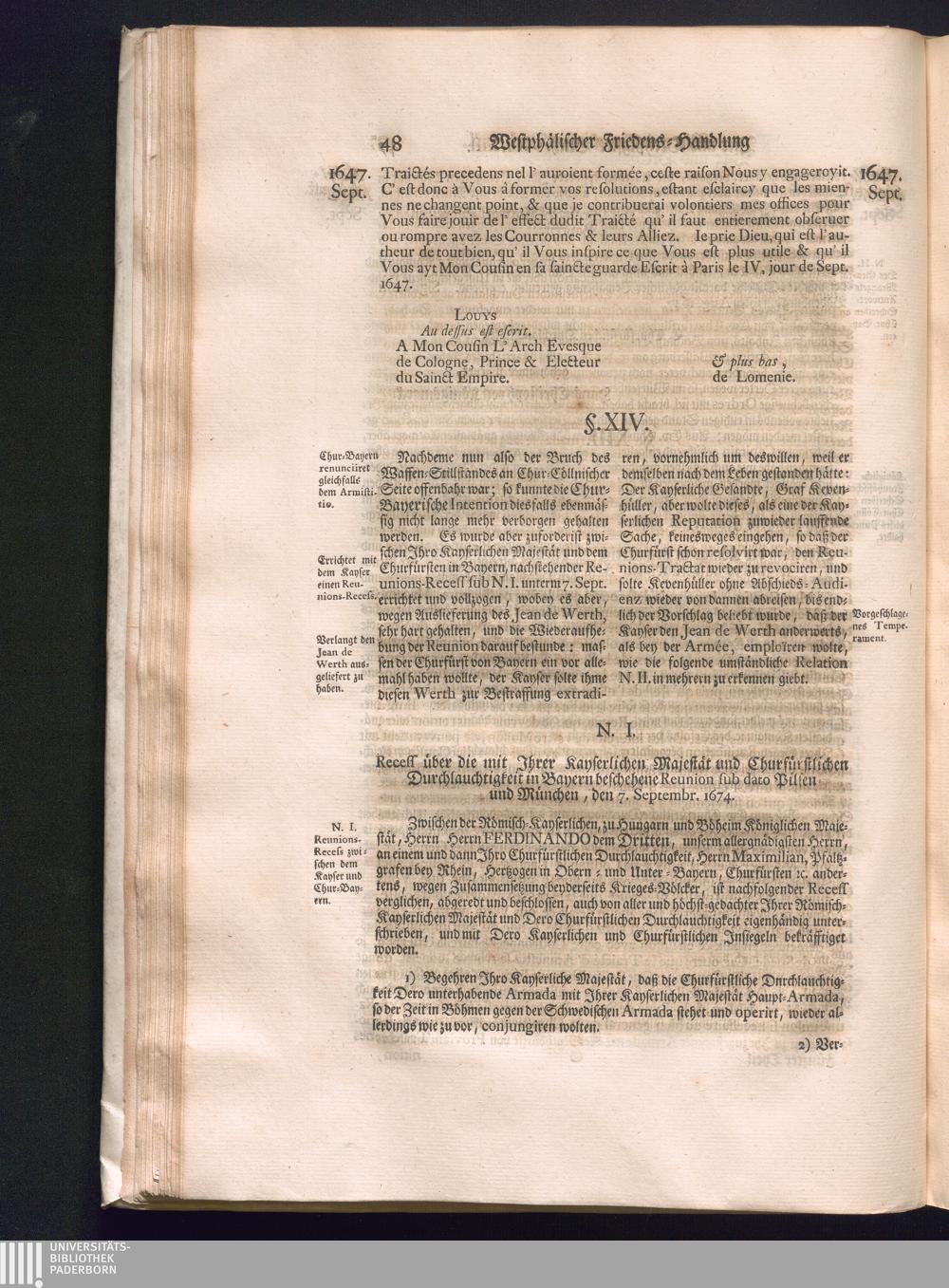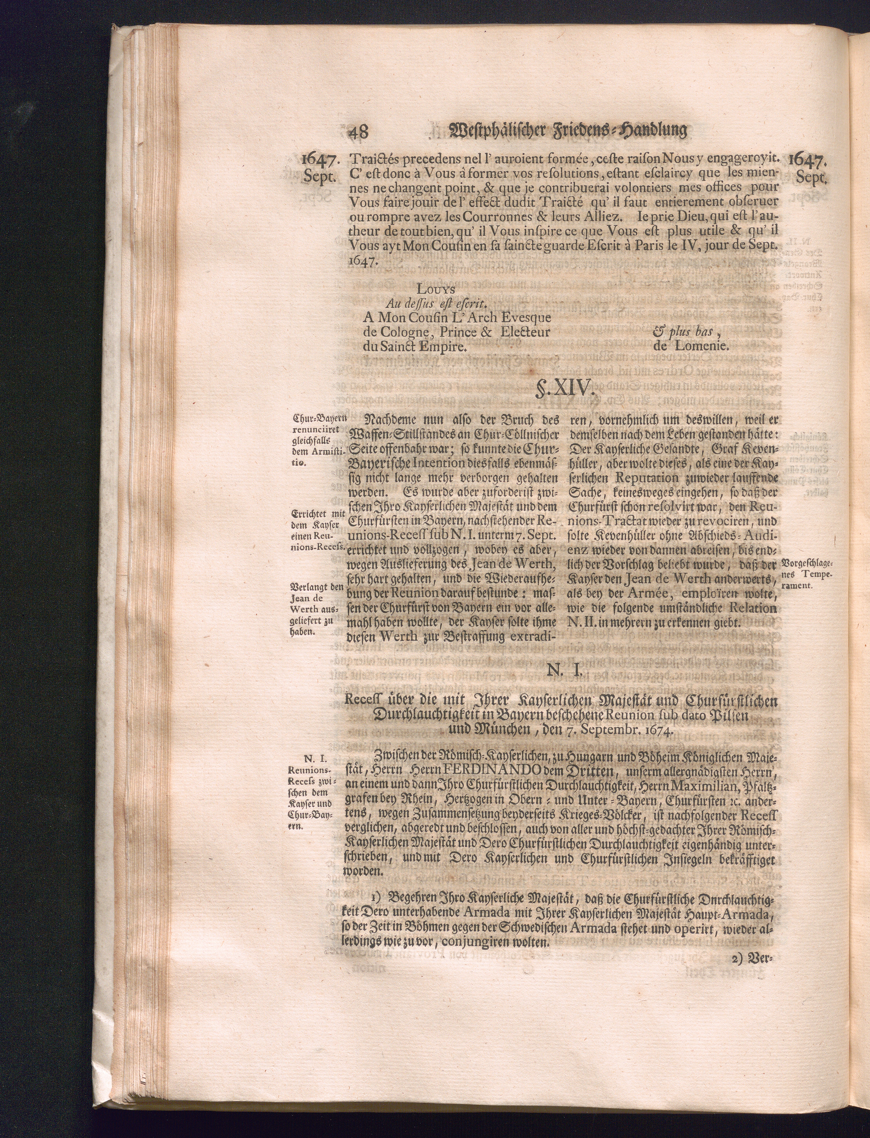 Fünffter Theil (1735) Worinnen enthalten, was vom Schluß des Jahrs 1647. biß in den Monath Junium des Jahrs 1648. zwischen Jhro Römisch-Kayserlichen Majestät, dann den Beyden Cronen Franckreich und Schweden, ingleichen des Heiligen Römischen Reichs Chur-Fürsten, Fürsten und Ständen, zu Oßnabrück und Münster gehandelt worden
