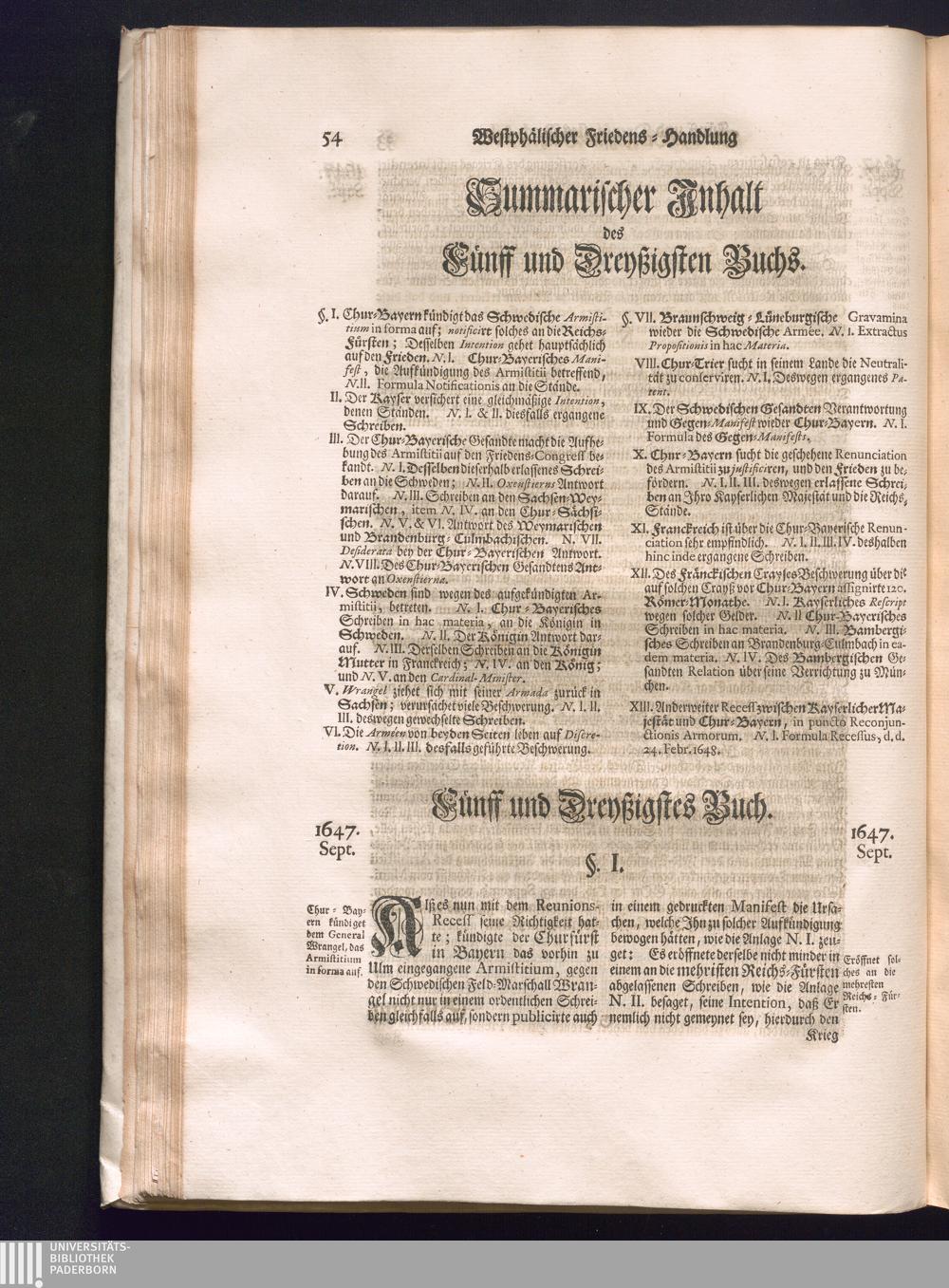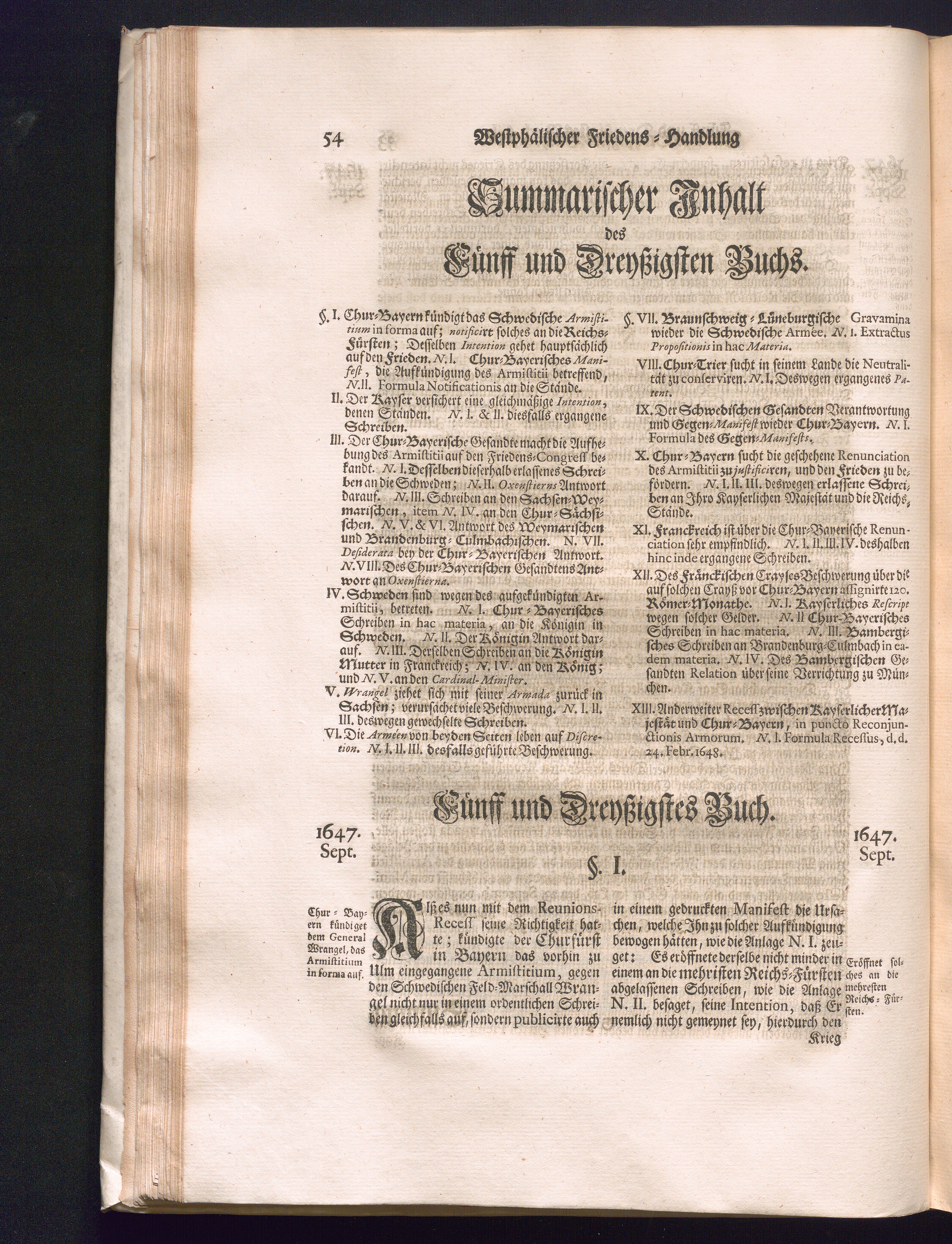 Fünffter Theil (1735) Worinnen enthalten, was vom Schluß des Jahrs 1647. biß in den Monath Junium des Jahrs 1648. zwischen Jhro Römisch-Kayserlichen Majestät, dann den Beyden Cronen Franckreich und Schweden, ingleichen des Heiligen Römischen Reichs Chur-Fürsten, Fürsten und Ständen, zu Oßnabrück und Münster gehandelt worden