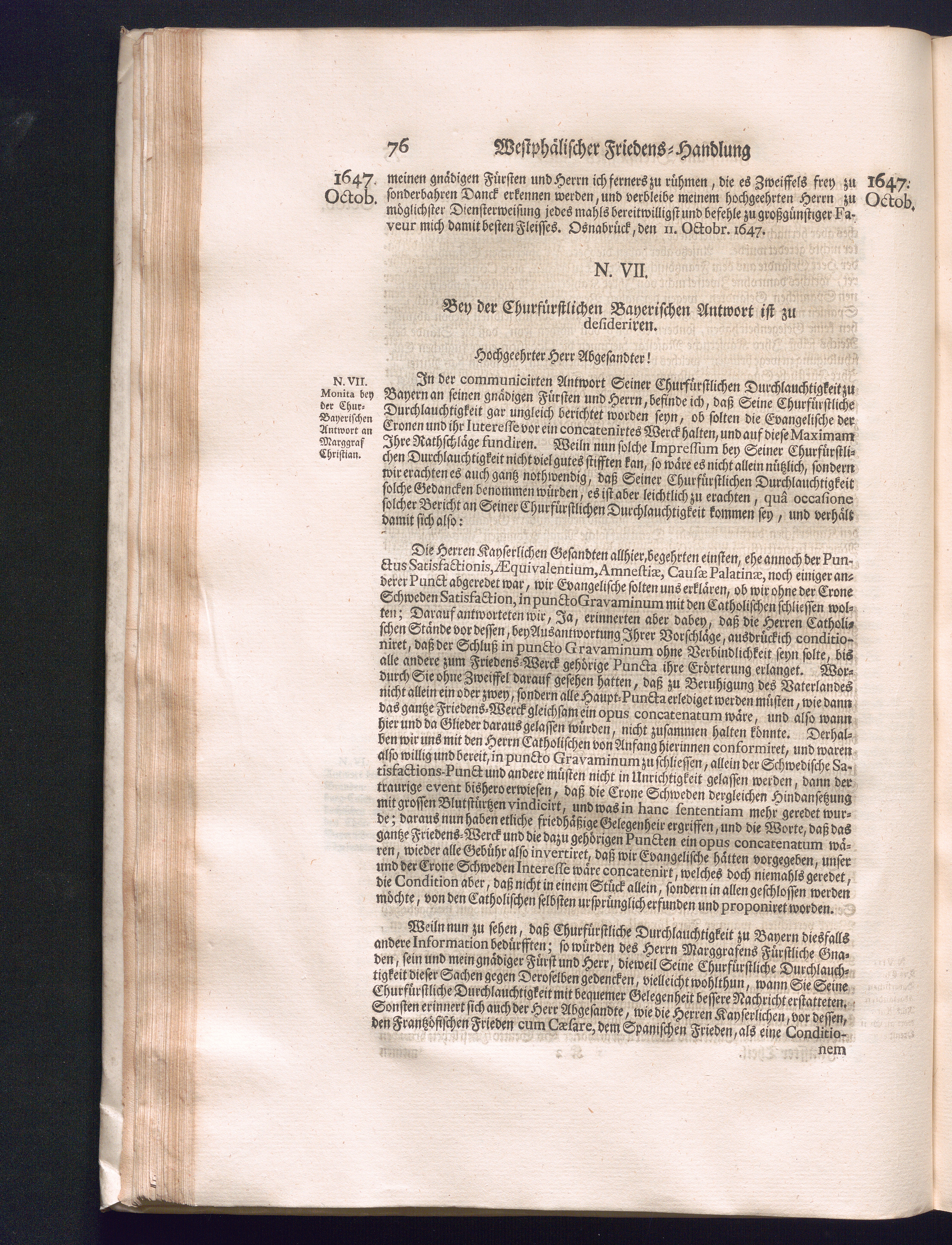 Fünffter Theil (1735) Worinnen enthalten, was vom Schluß des Jahrs 1647. biß in den Monath Junium des Jahrs 1648. zwischen Jhro Römisch-Kayserlichen Majestät, dann den Beyden Cronen Franckreich und Schweden, ingleichen des Heiligen Römischen Reichs Chur-Fürsten, Fürsten und Ständen, zu Oßnabrück und Münster gehandelt worden