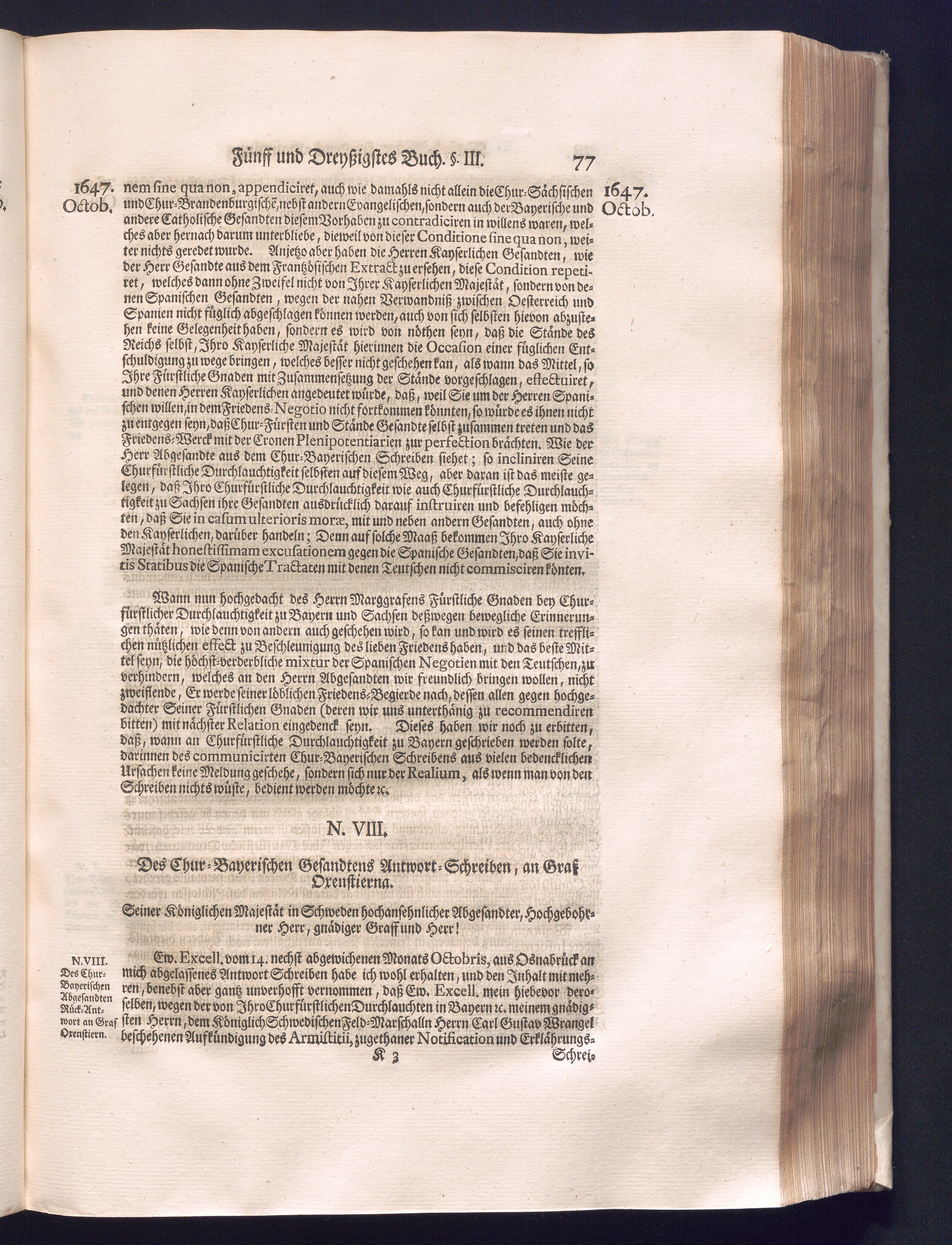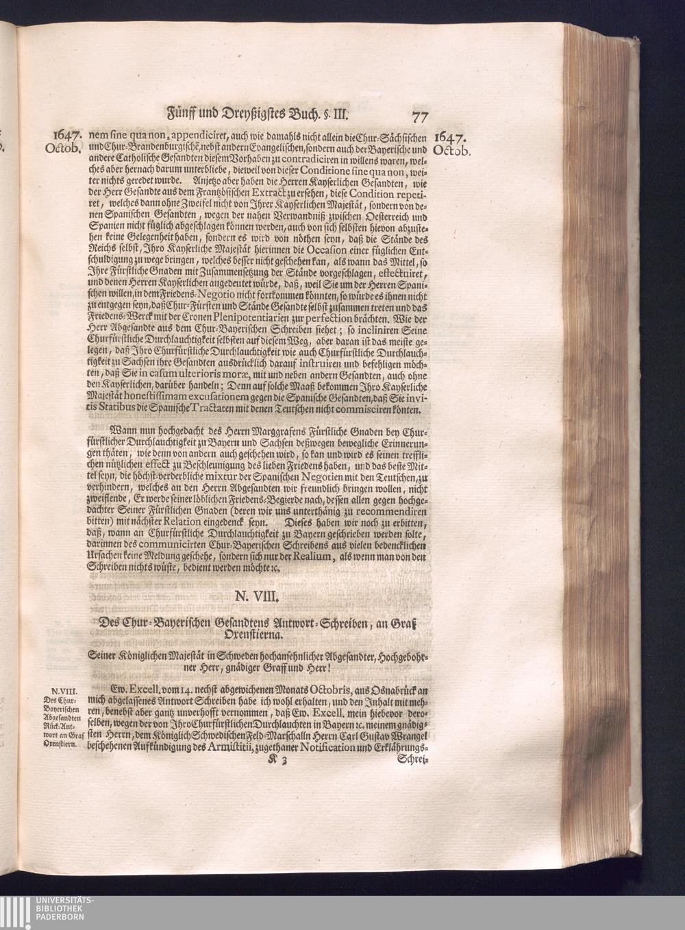 Fünffter Theil (1735) Worinnen enthalten, was vom Schluß des Jahrs 1647. biß in den Monath Junium des Jahrs 1648. zwischen Jhro Römisch-Kayserlichen Majestät, dann den Beyden Cronen Franckreich und Schweden, ingleichen des Heiligen Römischen Reichs Chur-Fürsten, Fürsten und Ständen, zu Oßnabrück und Münster gehandelt worden