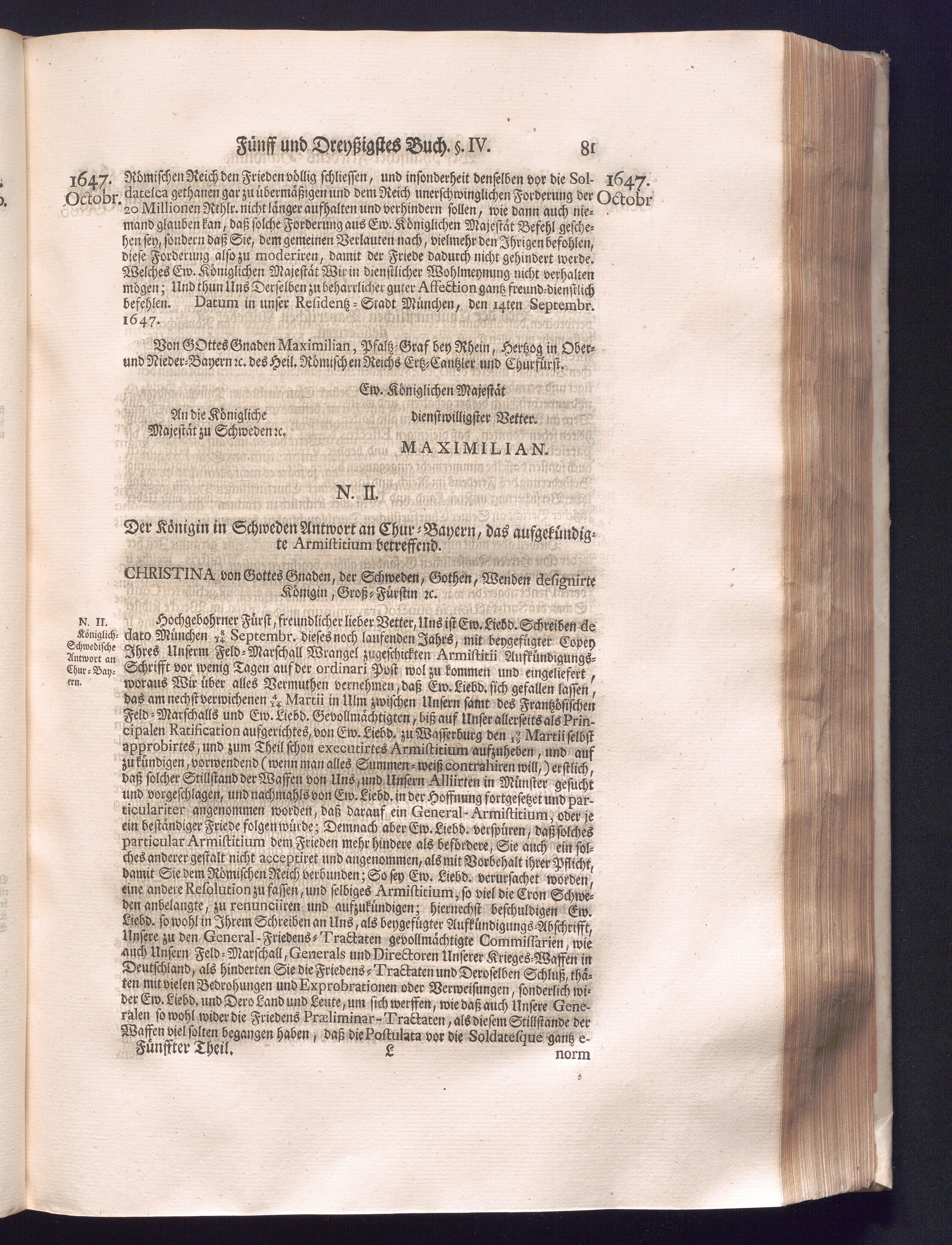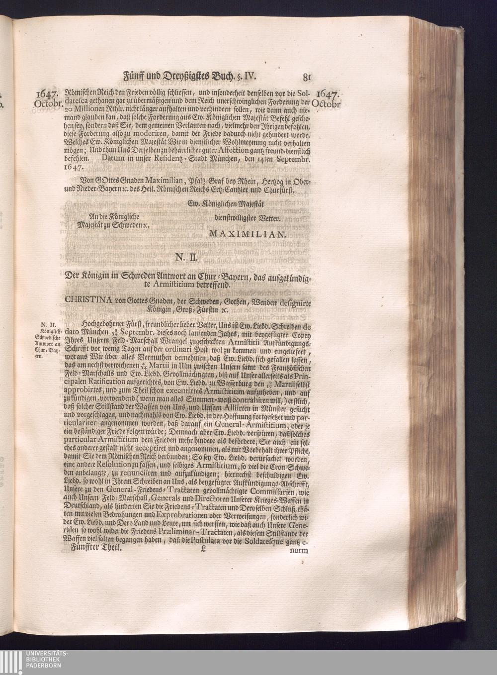 Fünffter Theil (1735) Worinnen enthalten, was vom Schluß des Jahrs 1647. biß in den Monath Junium des Jahrs 1648. zwischen Jhro Römisch-Kayserlichen Majestät, dann den Beyden Cronen Franckreich und Schweden, ingleichen des Heiligen Römischen Reichs Chur-Fürsten, Fürsten und Ständen, zu Oßnabrück und Münster gehandelt worden