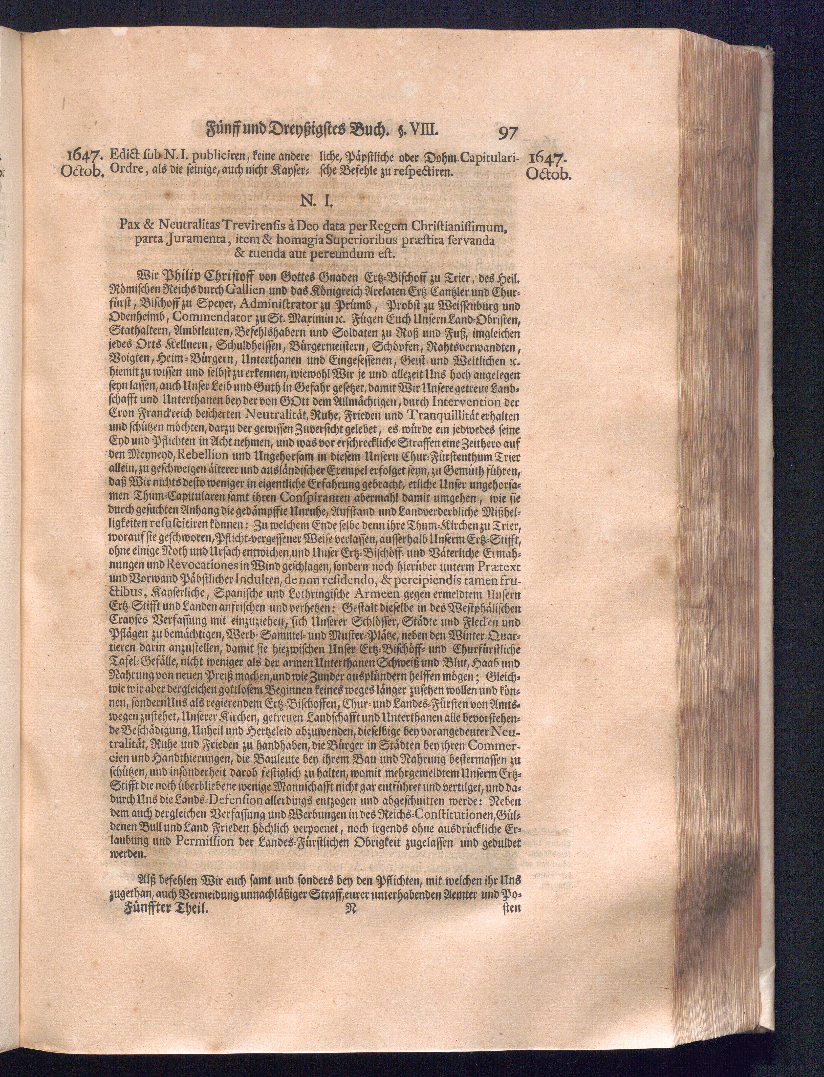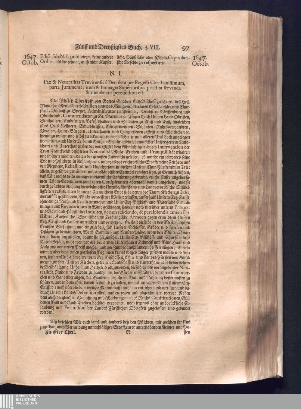 Fünffter Theil (1735) Worinnen enthalten, was vom Schluß des Jahrs 1647. biß in den Monath Junium des Jahrs 1648. zwischen Jhro Römisch-Kayserlichen Majestät, dann den Beyden Cronen Franckreich und Schweden, ingleichen des Heiligen Römischen Reichs Chur-Fürsten, Fürsten und Ständen, zu Oßnabrück und Münster gehandelt worden