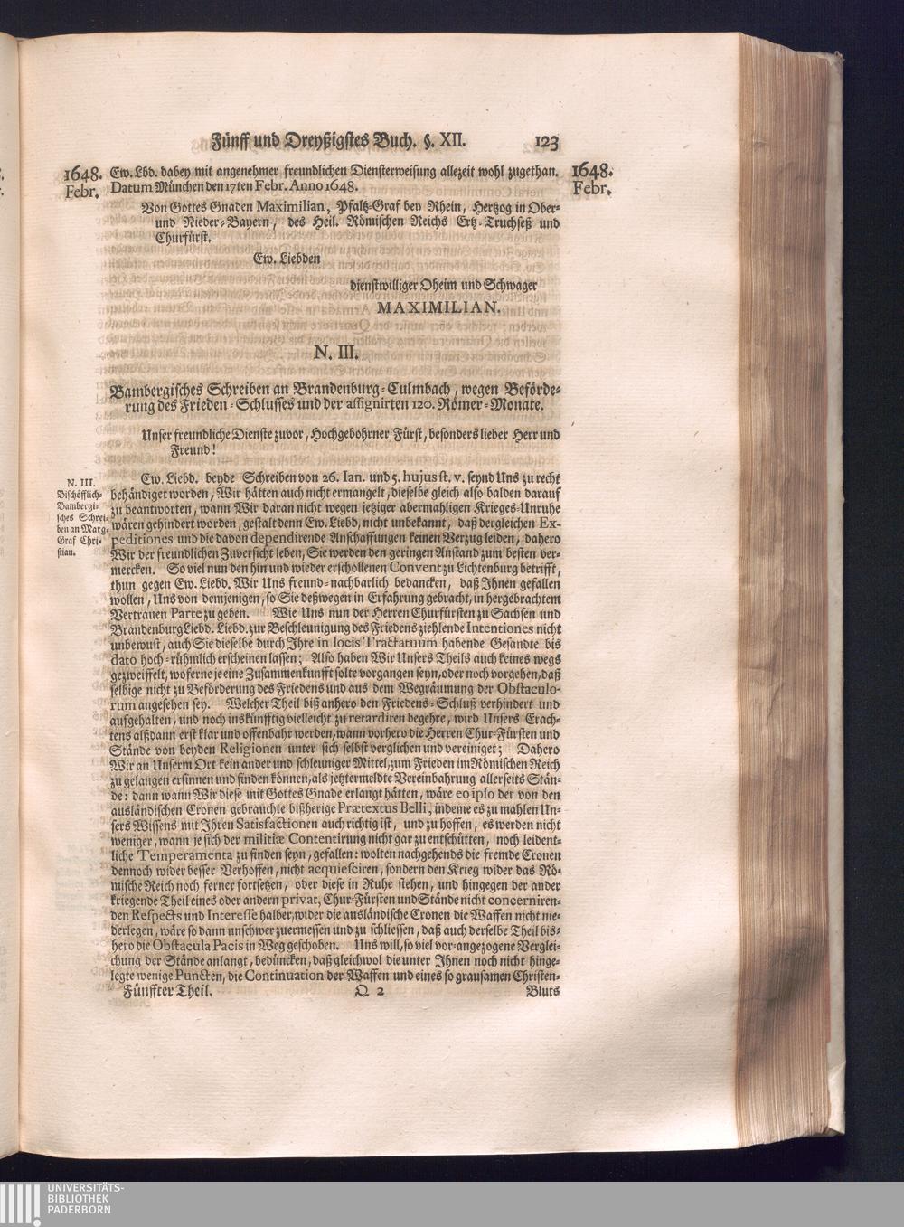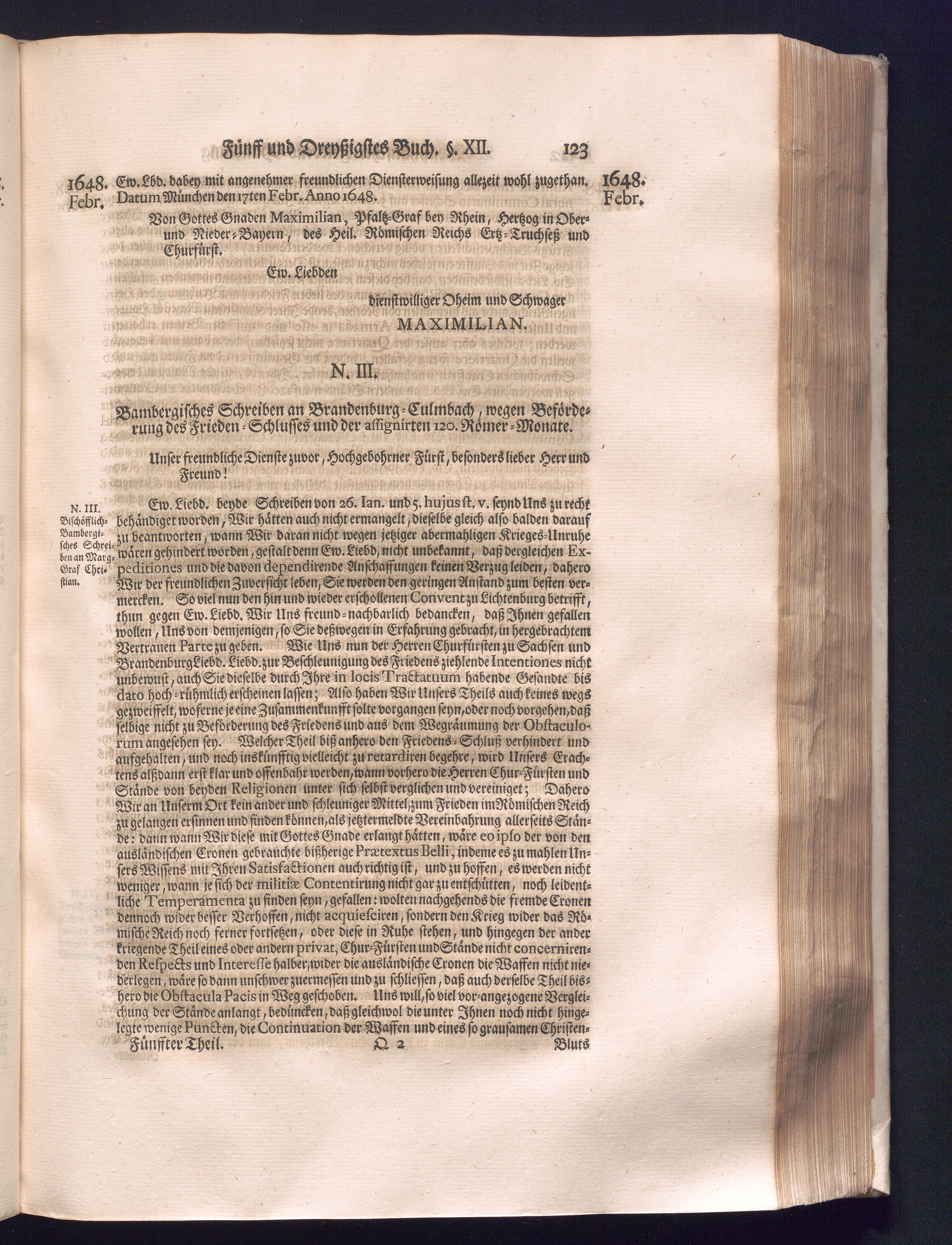 Fünffter Theil (1735) Worinnen enthalten, was vom Schluß des Jahrs 1647. biß in den Monath Junium des Jahrs 1648. zwischen Jhro Römisch-Kayserlichen Majestät, dann den Beyden Cronen Franckreich und Schweden, ingleichen des Heiligen Römischen Reichs Chur-Fürsten, Fürsten und Ständen, zu Oßnabrück und Münster gehandelt worden
