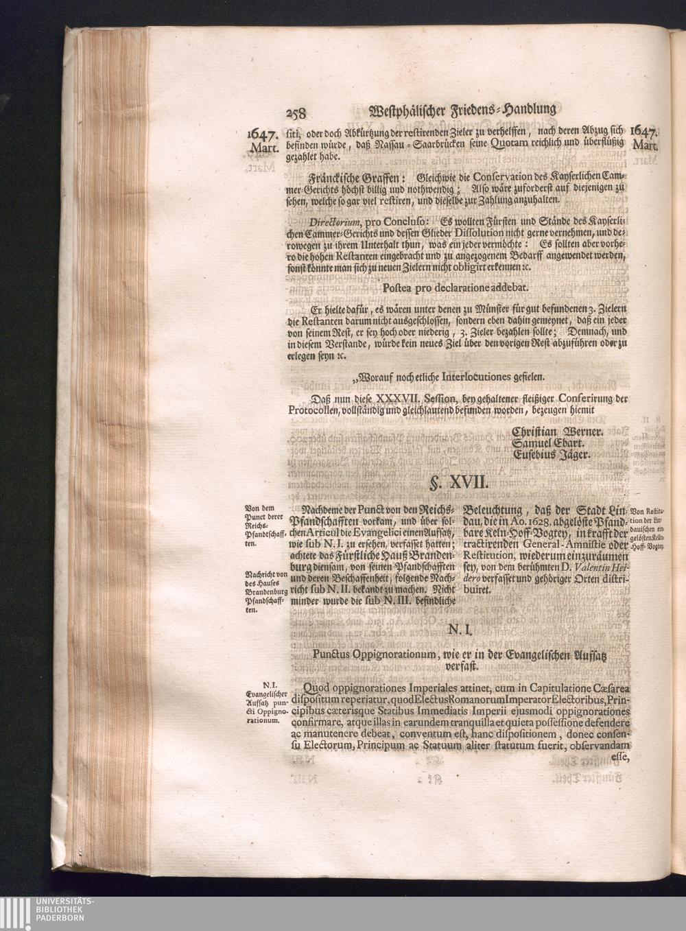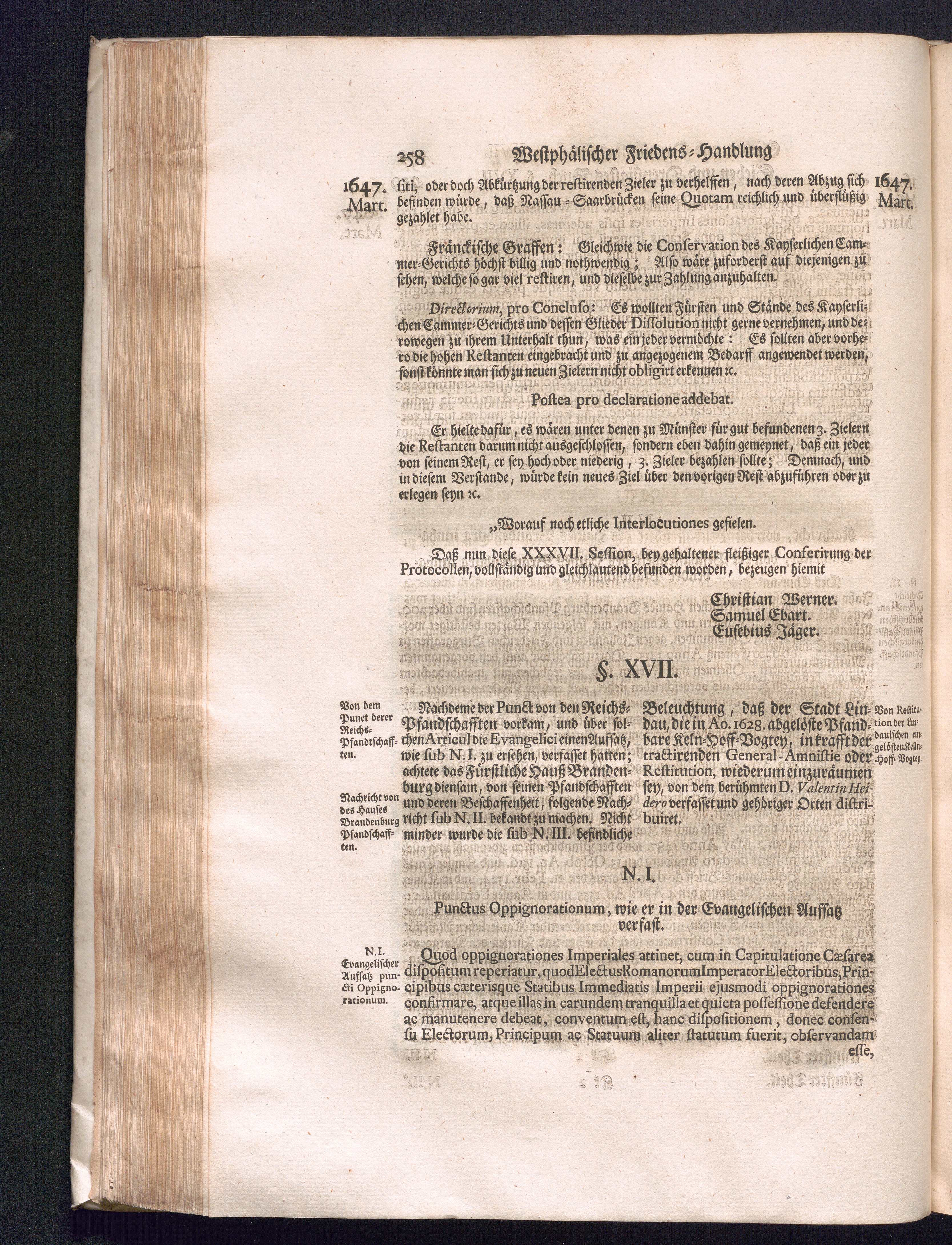 Fünffter Theil (1735) Worinnen enthalten, was vom Schluß des Jahrs 1647. biß in den Monath Junium des Jahrs 1648. zwischen Jhro Römisch-Kayserlichen Majestät, dann den Beyden Cronen Franckreich und Schweden, ingleichen des Heiligen Römischen Reichs Chur-Fürsten, Fürsten und Ständen, zu Oßnabrück und Münster gehandelt worden