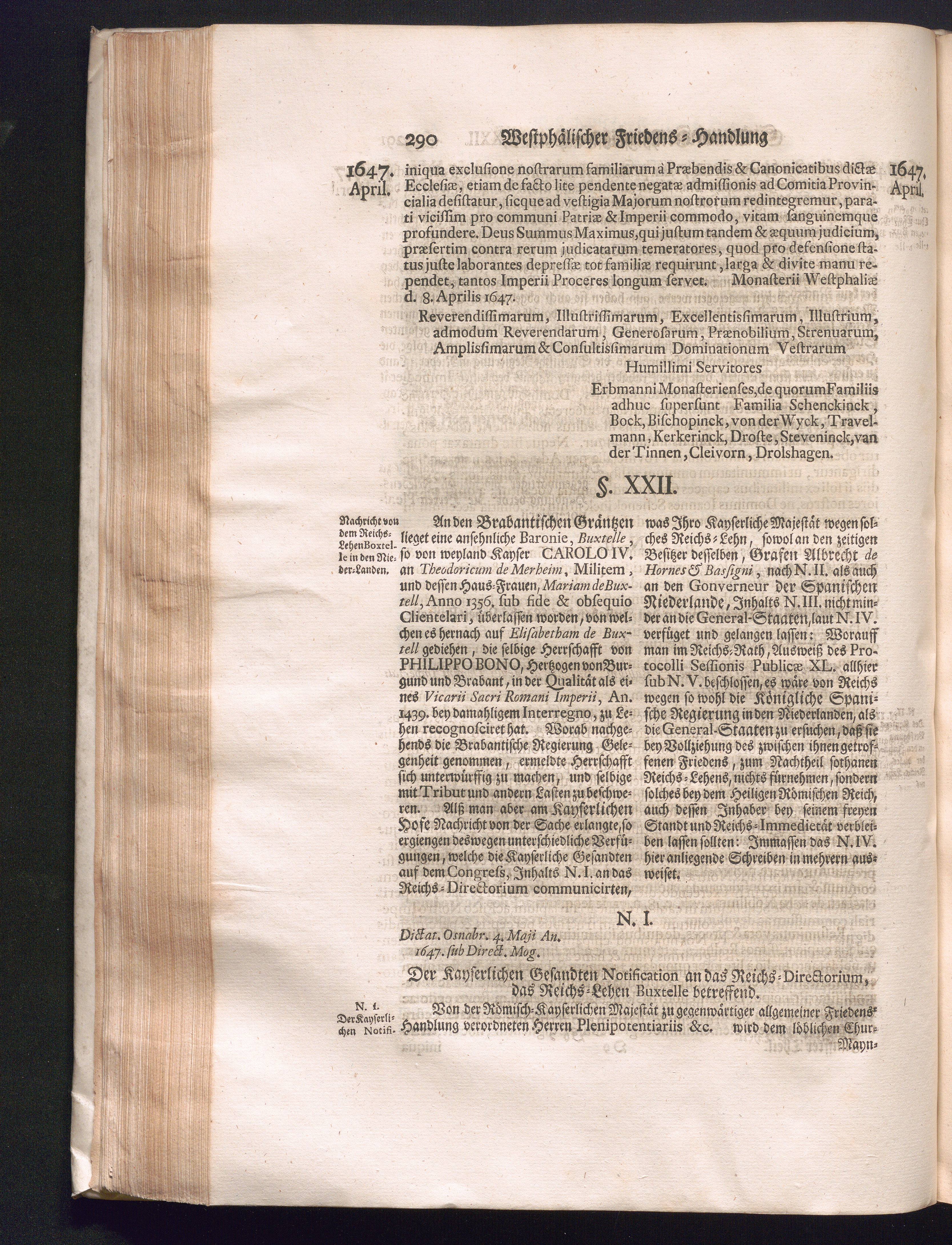 Fünffter Theil (1735) Worinnen enthalten, was vom Schluß des Jahrs 1647. biß in den Monath Junium des Jahrs 1648. zwischen Jhro Römisch-Kayserlichen Majestät, dann den Beyden Cronen Franckreich und Schweden, ingleichen des Heiligen Römischen Reichs Chur-Fürsten, Fürsten und Ständen, zu Oßnabrück und Münster gehandelt worden