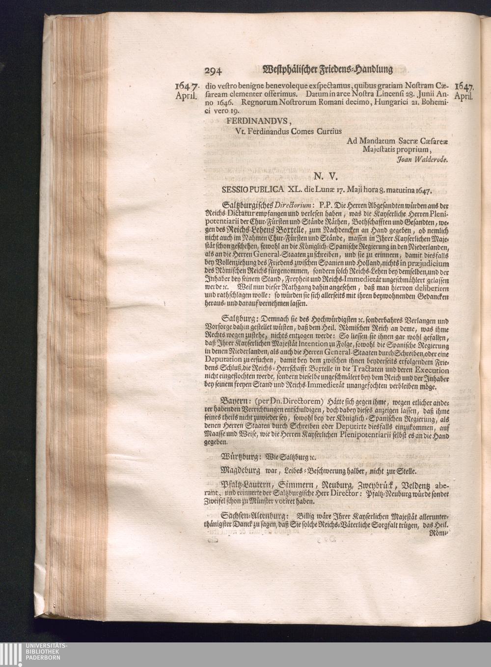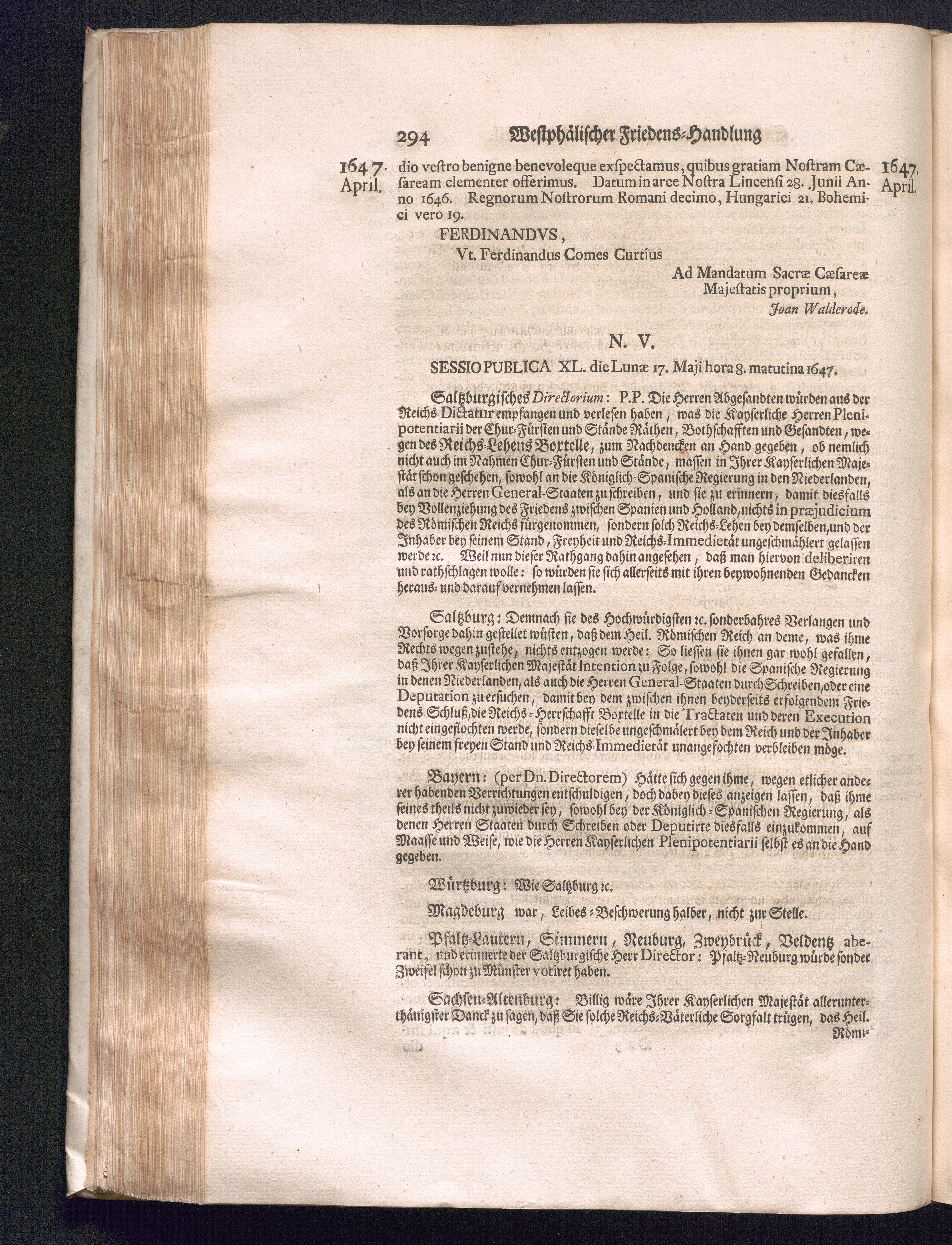 Fünffter Theil (1735) Worinnen enthalten, was vom Schluß des Jahrs 1647. biß in den Monath Junium des Jahrs 1648. zwischen Jhro Römisch-Kayserlichen Majestät, dann den Beyden Cronen Franckreich und Schweden, ingleichen des Heiligen Römischen Reichs Chur-Fürsten, Fürsten und Ständen, zu Oßnabrück und Münster gehandelt worden