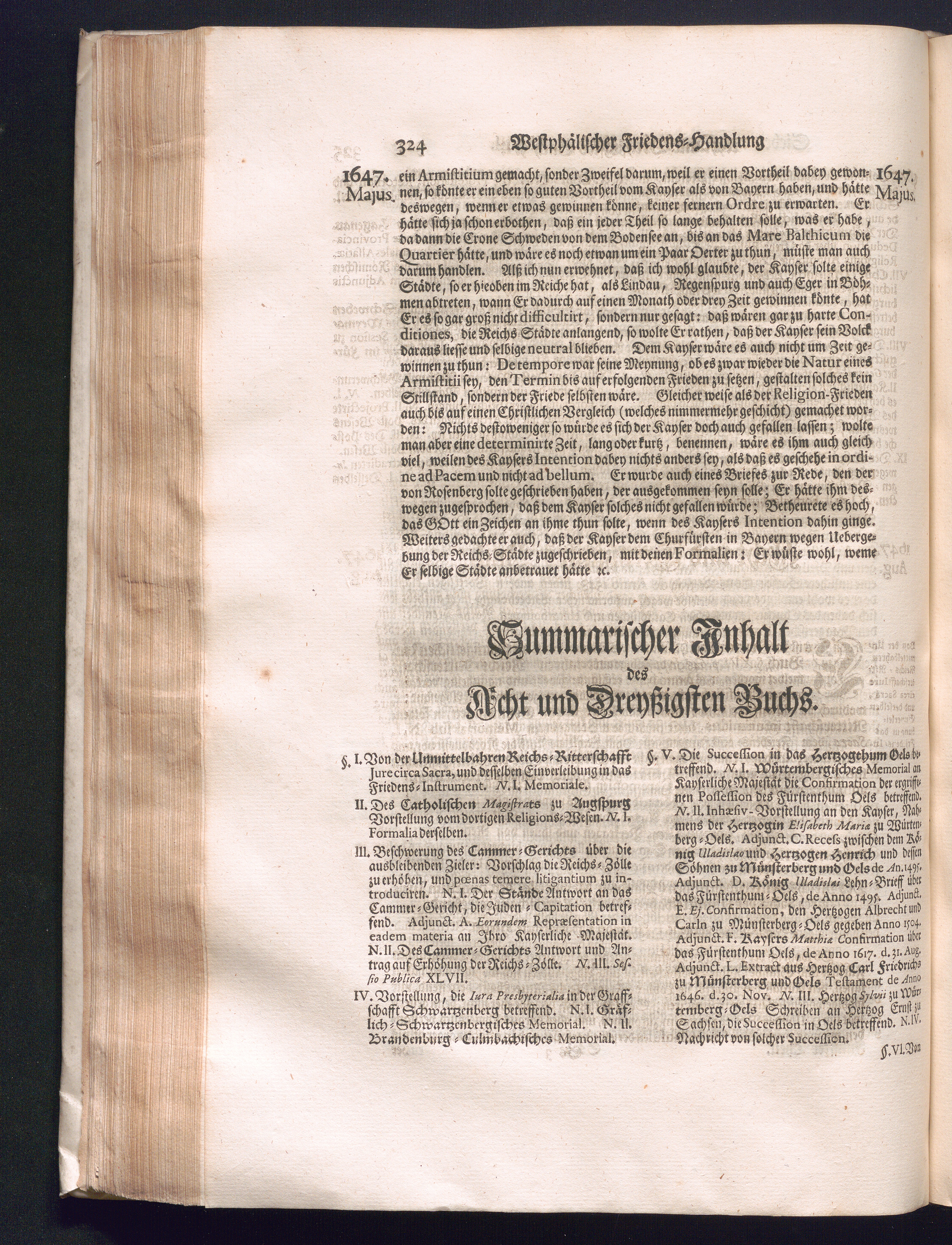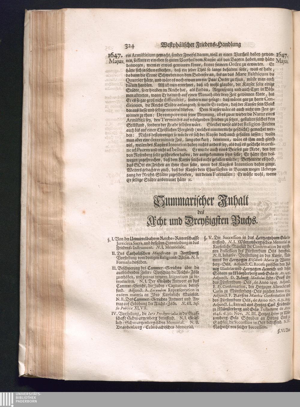 Fünffter Theil (1735) Worinnen enthalten, was vom Schluß des Jahrs 1647. biß in den Monath Junium des Jahrs 1648. zwischen Jhro Römisch-Kayserlichen Majestät, dann den Beyden Cronen Franckreich und Schweden, ingleichen des Heiligen Römischen Reichs Chur-Fürsten, Fürsten und Ständen, zu Oßnabrück und Münster gehandelt worden