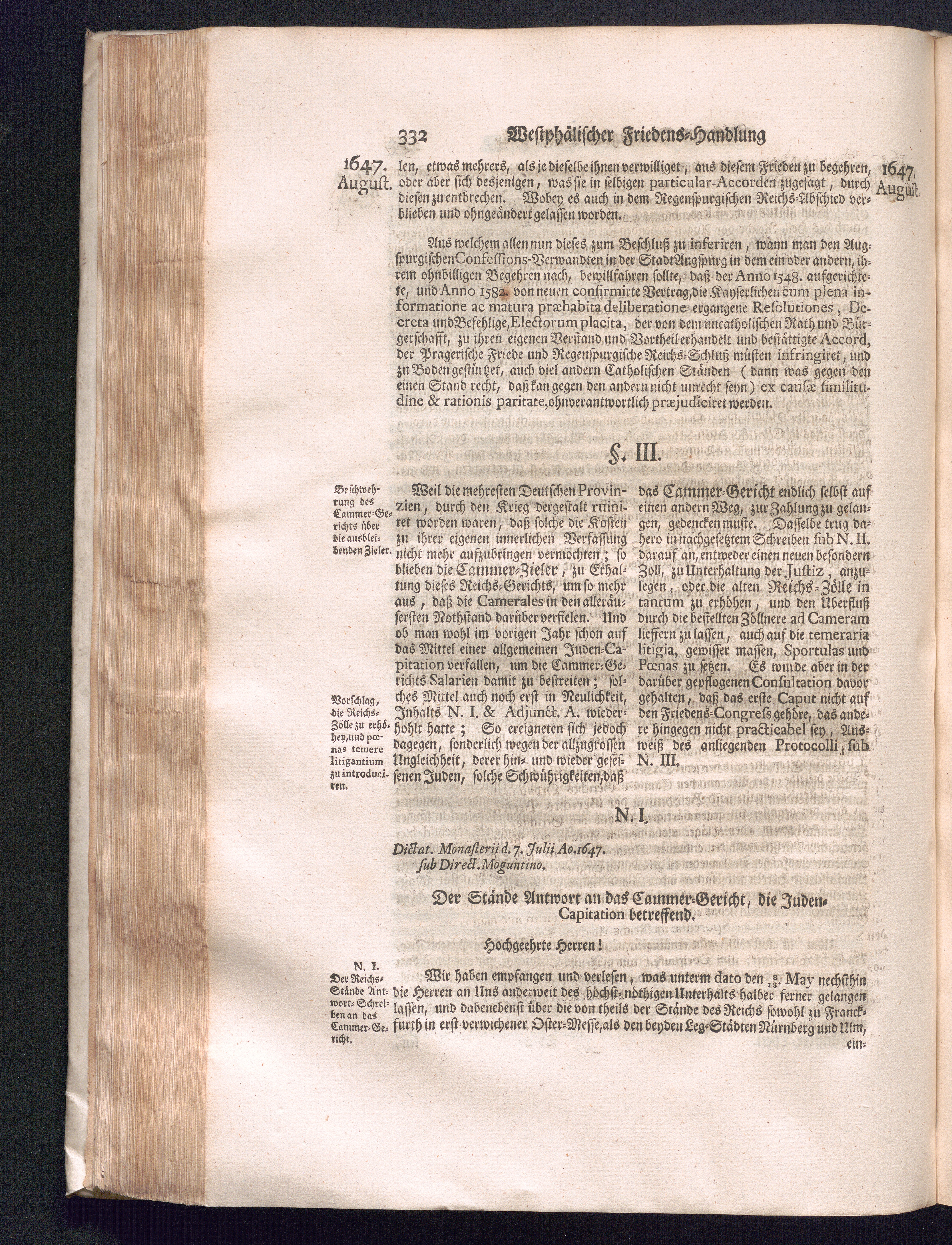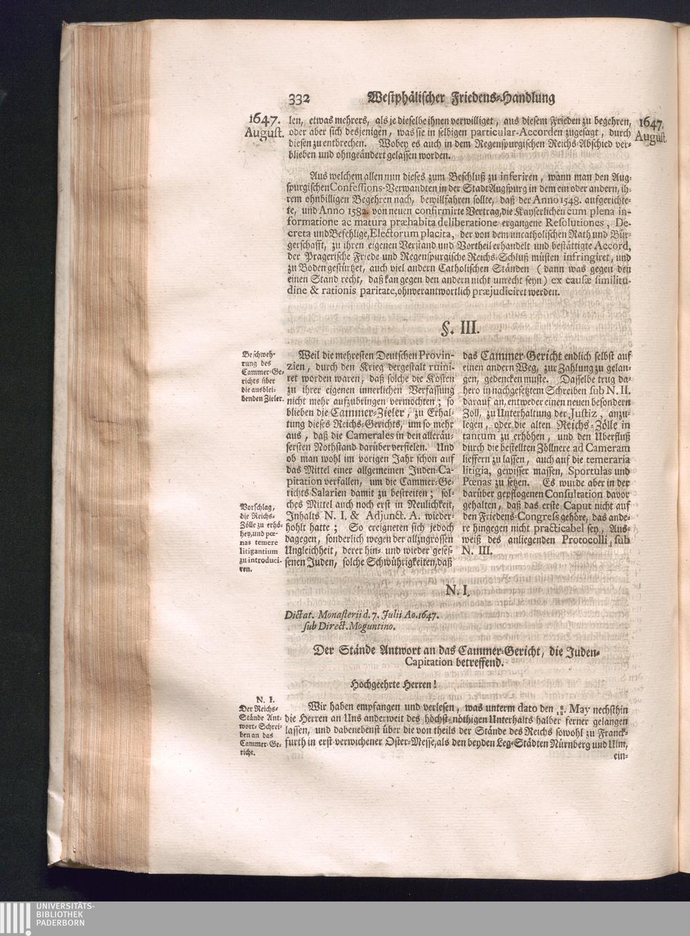 Fünffter Theil (1735) Worinnen enthalten, was vom Schluß des Jahrs 1647. biß in den Monath Junium des Jahrs 1648. zwischen Jhro Römisch-Kayserlichen Majestät, dann den Beyden Cronen Franckreich und Schweden, ingleichen des Heiligen Römischen Reichs Chur-Fürsten, Fürsten und Ständen, zu Oßnabrück und Münster gehandelt worden