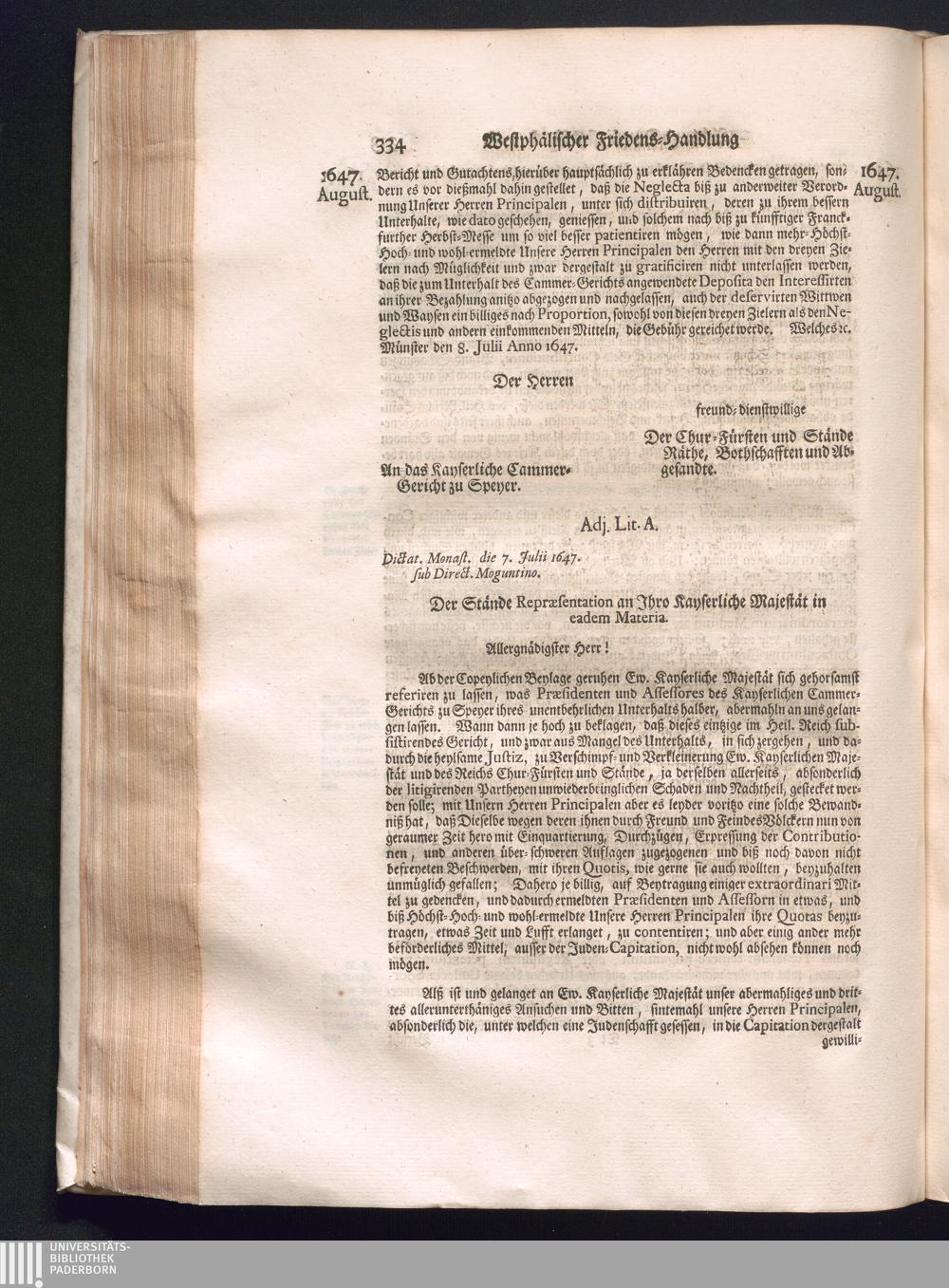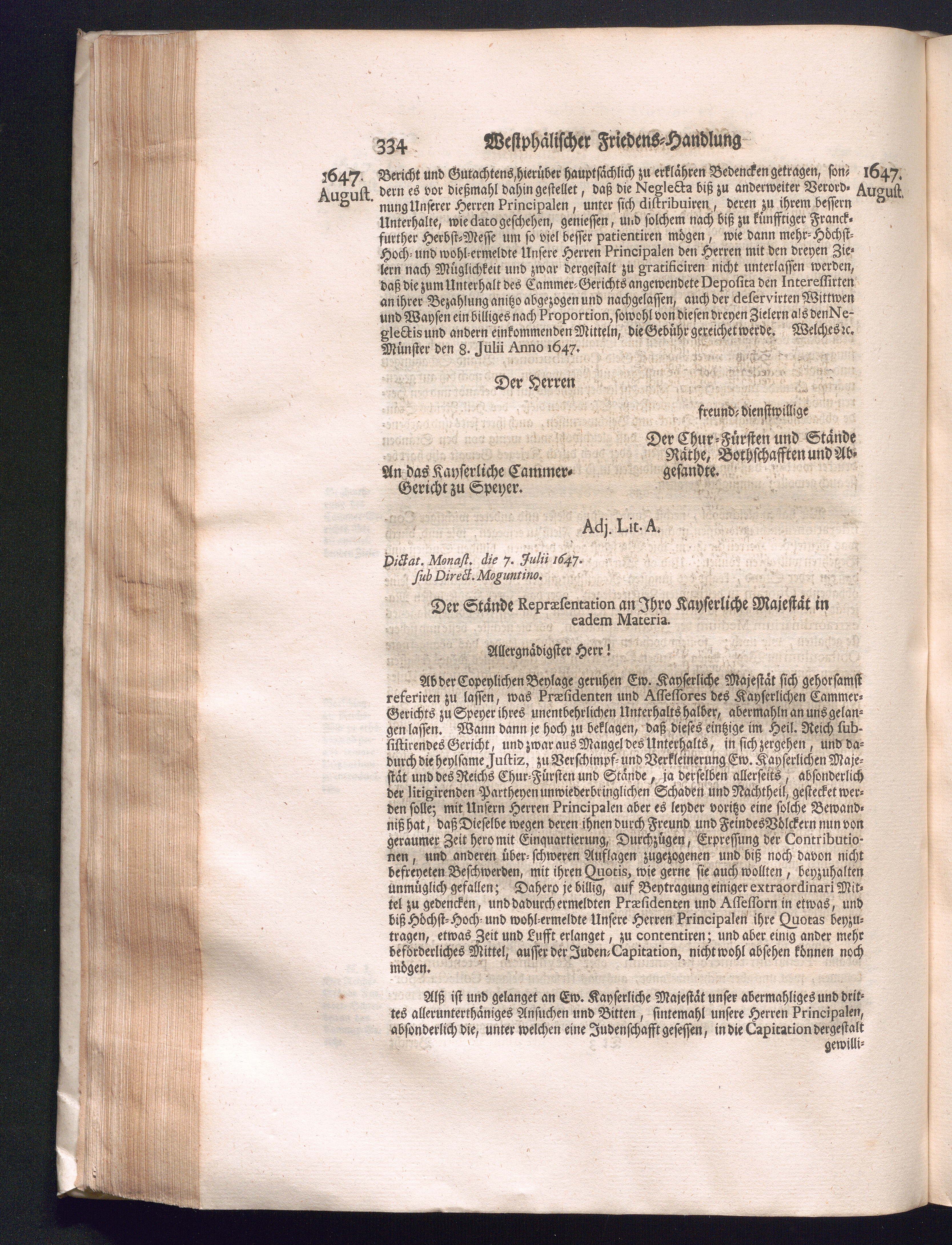 Fünffter Theil (1735) Worinnen enthalten, was vom Schluß des Jahrs 1647. biß in den Monath Junium des Jahrs 1648. zwischen Jhro Römisch-Kayserlichen Majestät, dann den Beyden Cronen Franckreich und Schweden, ingleichen des Heiligen Römischen Reichs Chur-Fürsten, Fürsten und Ständen, zu Oßnabrück und Münster gehandelt worden